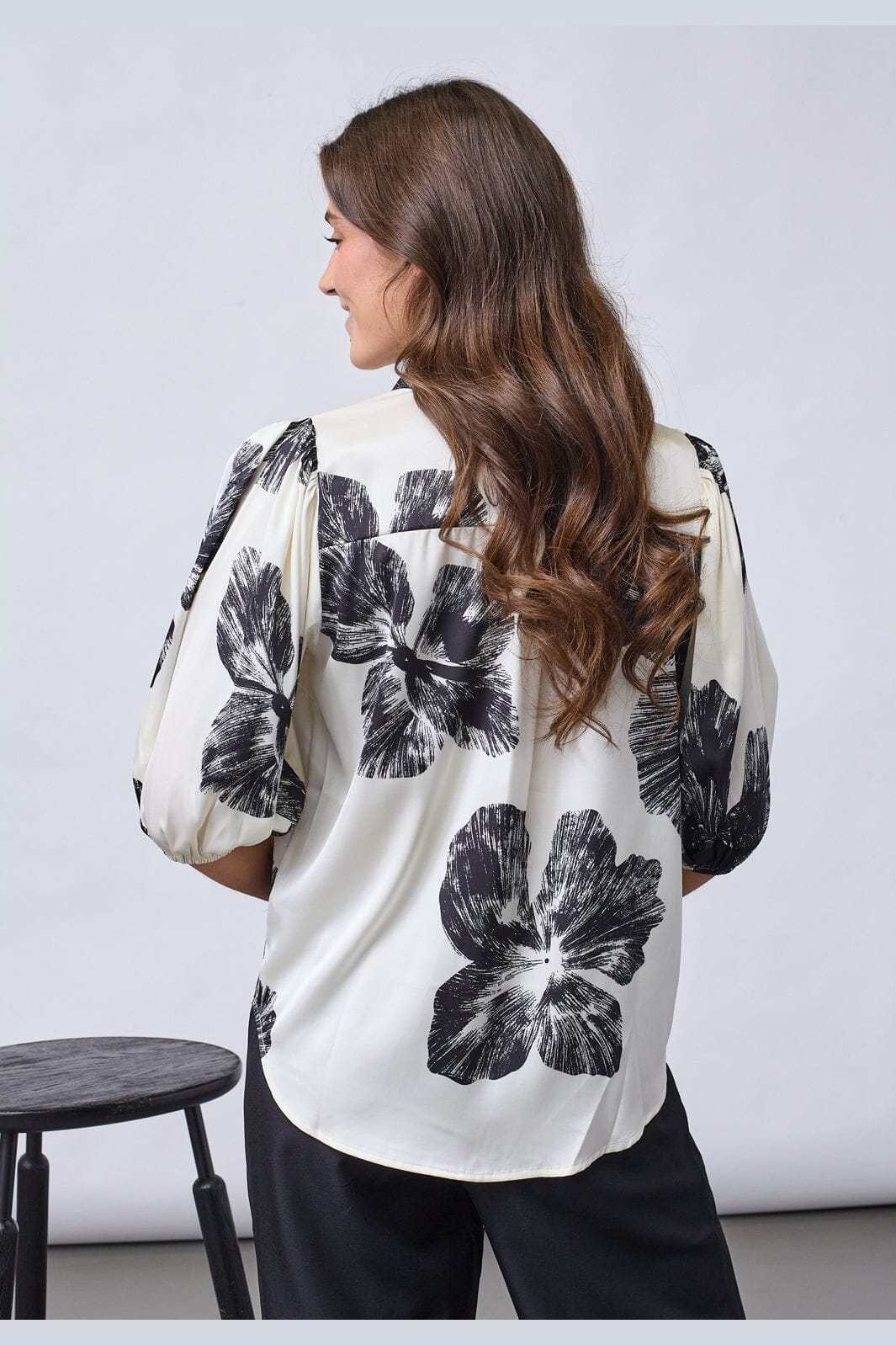 Een satijnen blouse van Sisters Point met een grafische bloemenprint in zwart op een crèmekleurige achtergrond. De blouse heeft een losse pasvorm.