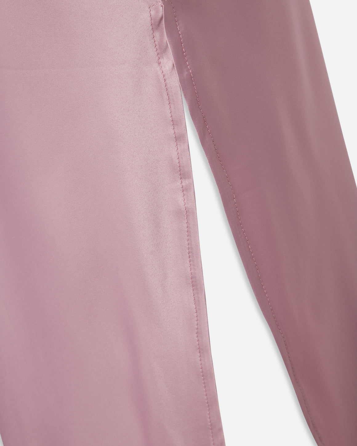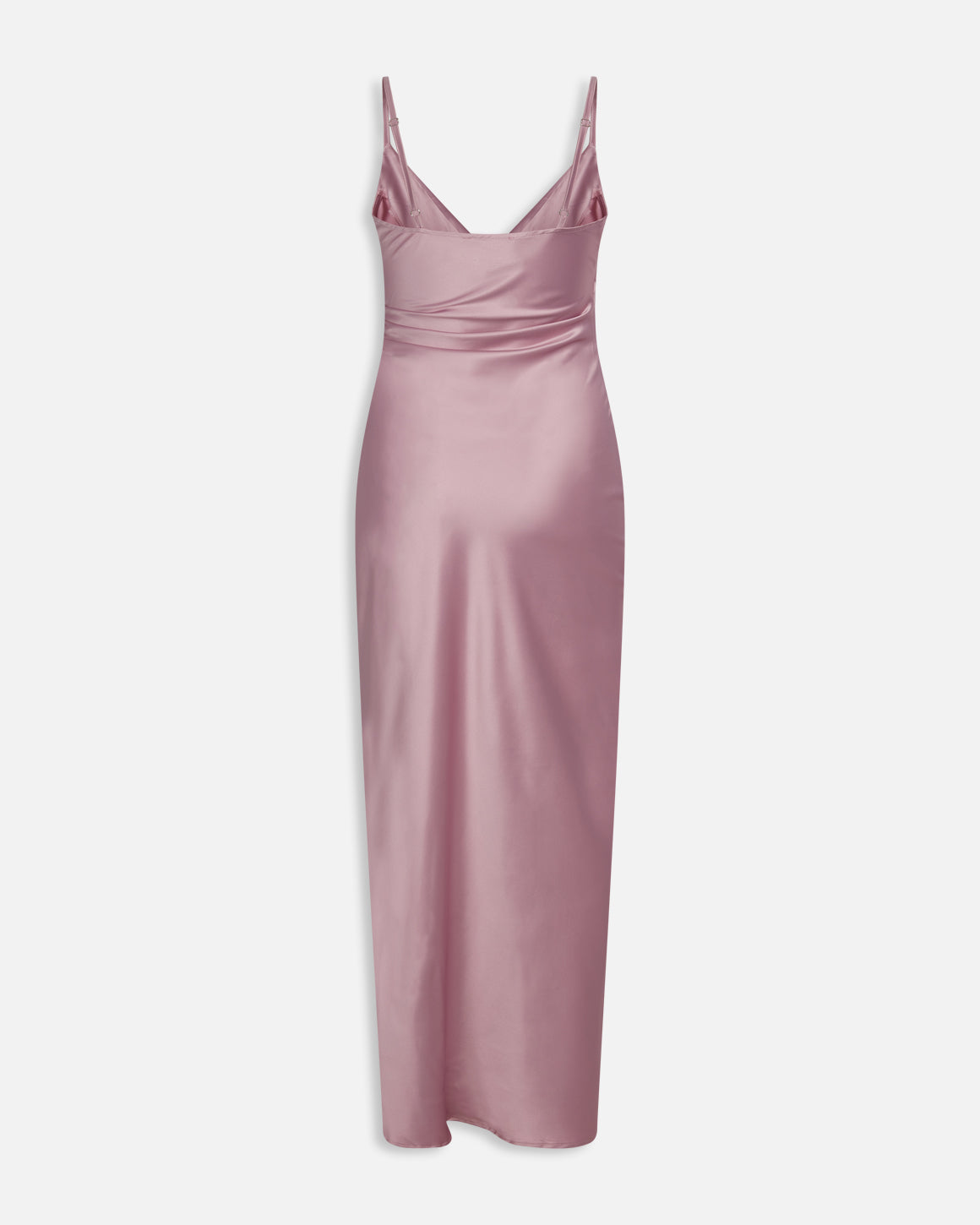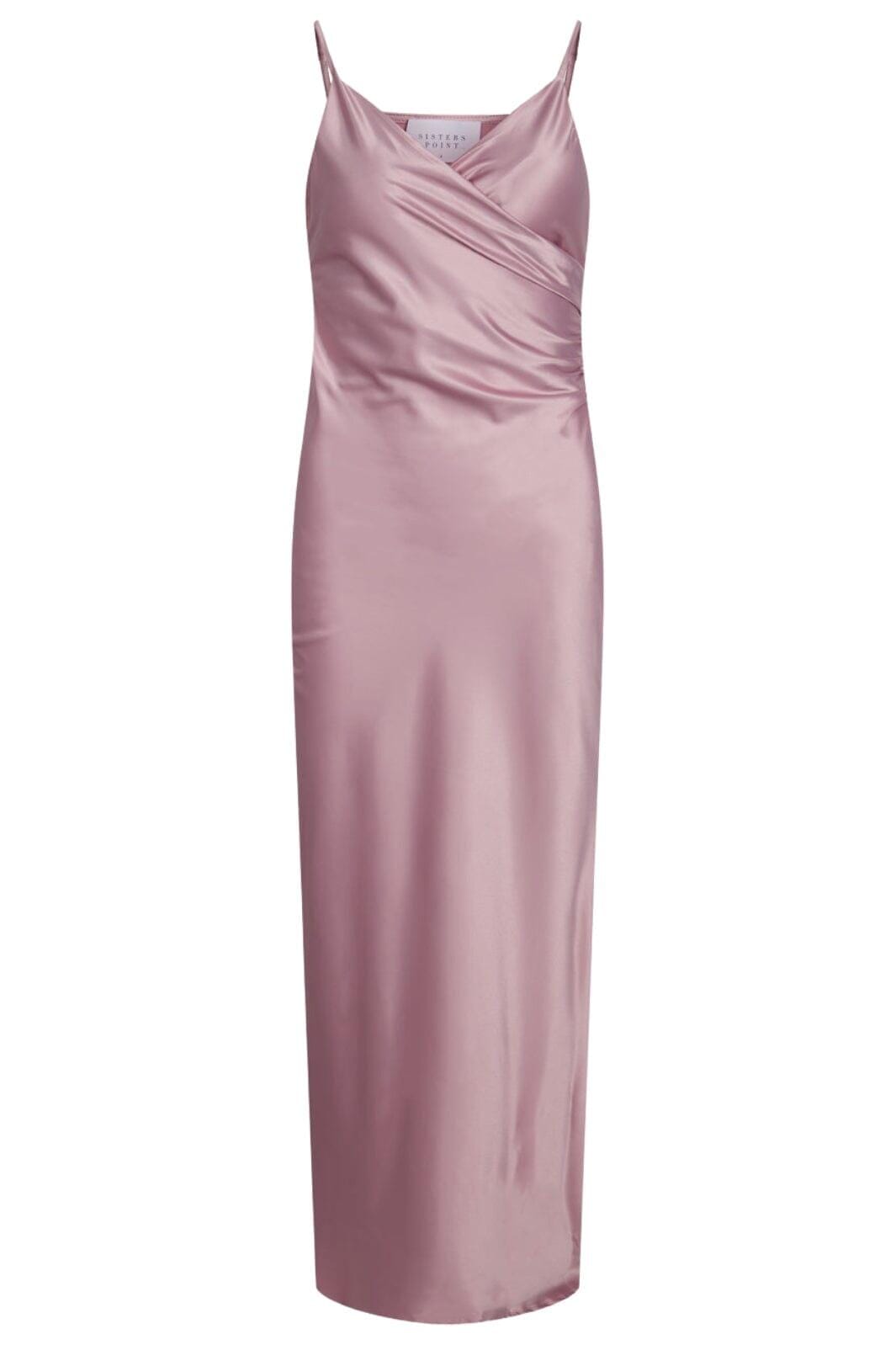 Roze feestjurk van Sisters Point met gedrapeerde v-hals en dunne bandjes. De jurk heeft een aansluitende pasvorm en reikt tot aan de enkels.