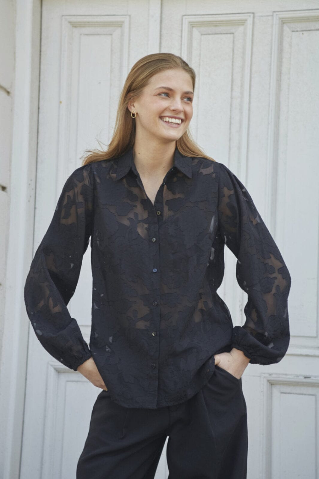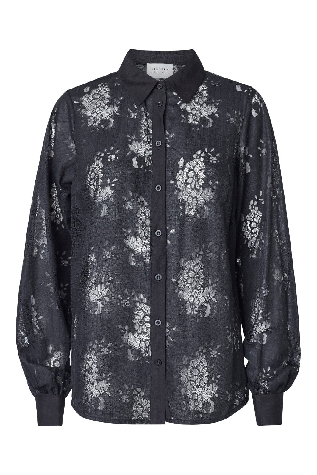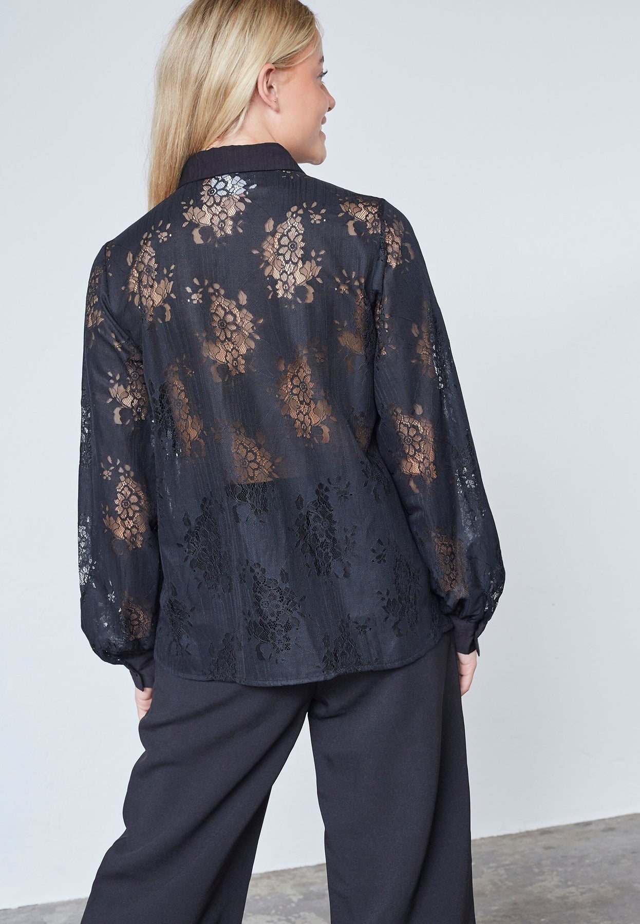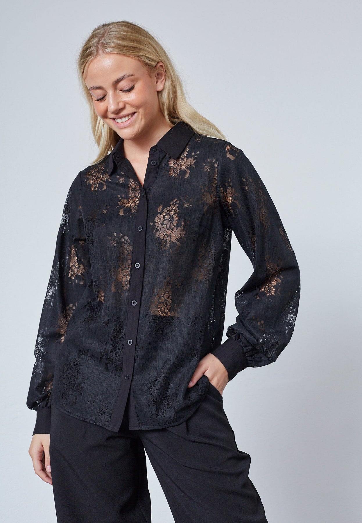Zwarte blouse van Sisters Point met een doorschijnend bloemenpatroon in kant. De blouse heeft een losse pasvorm met een klassieke kraag en knoopsluiting aan de voorkant. De lange mouwen eindigen met manchetten.