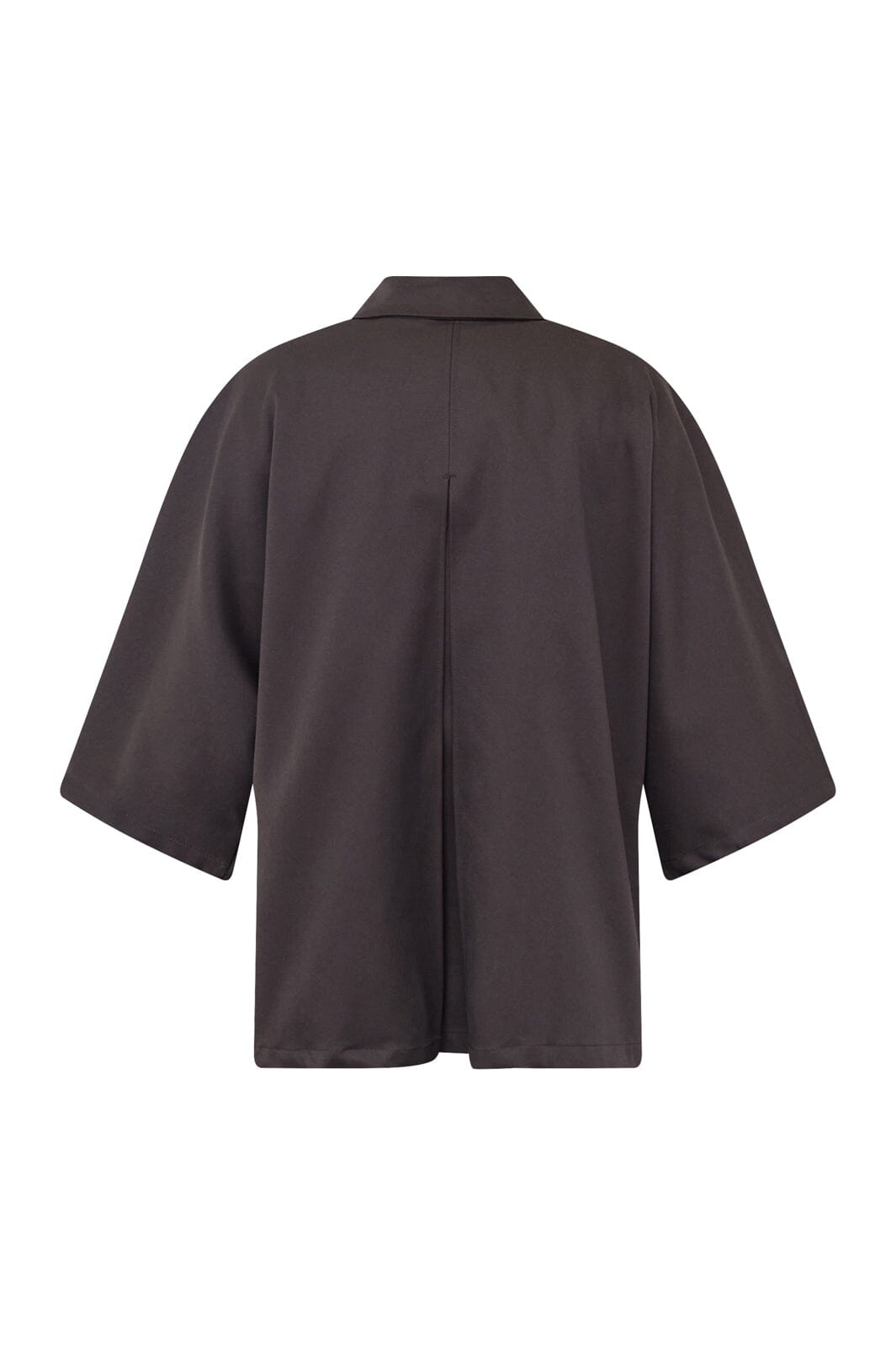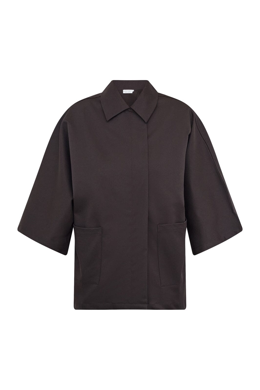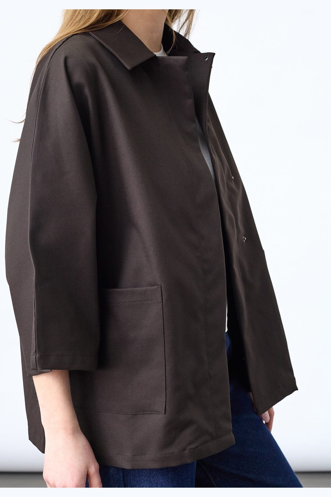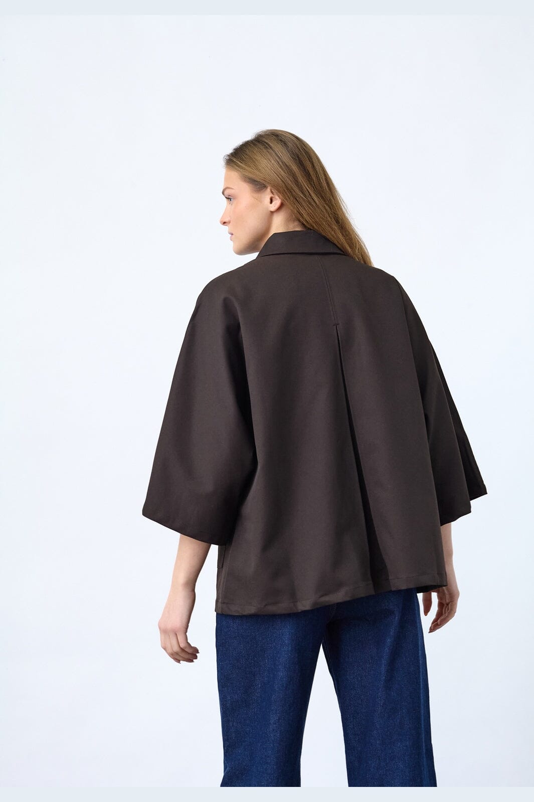 Effen jas van Sisters Point in donker chocoladebruin. De jas heeft een oversized pasvorm en 3/4-mouwen met een wijde snit.