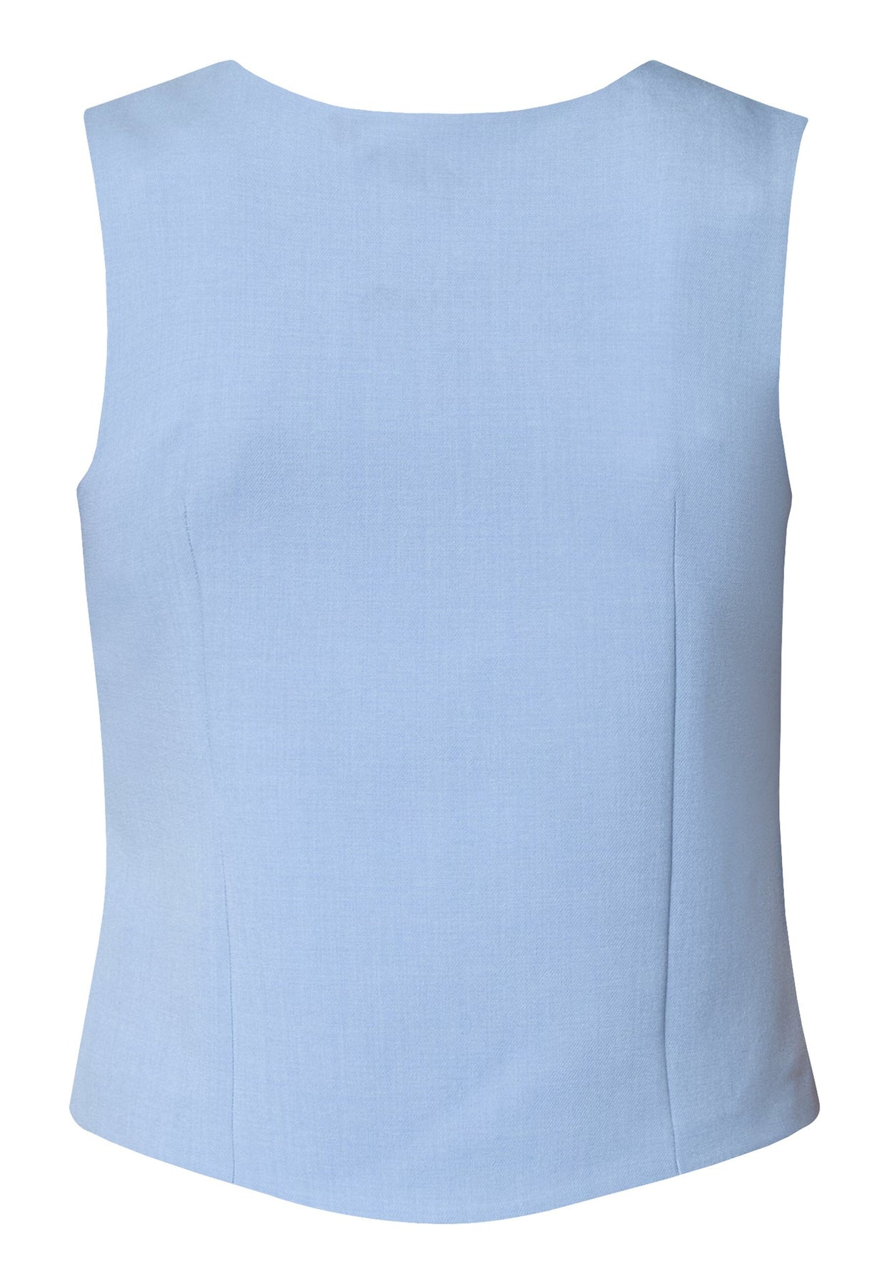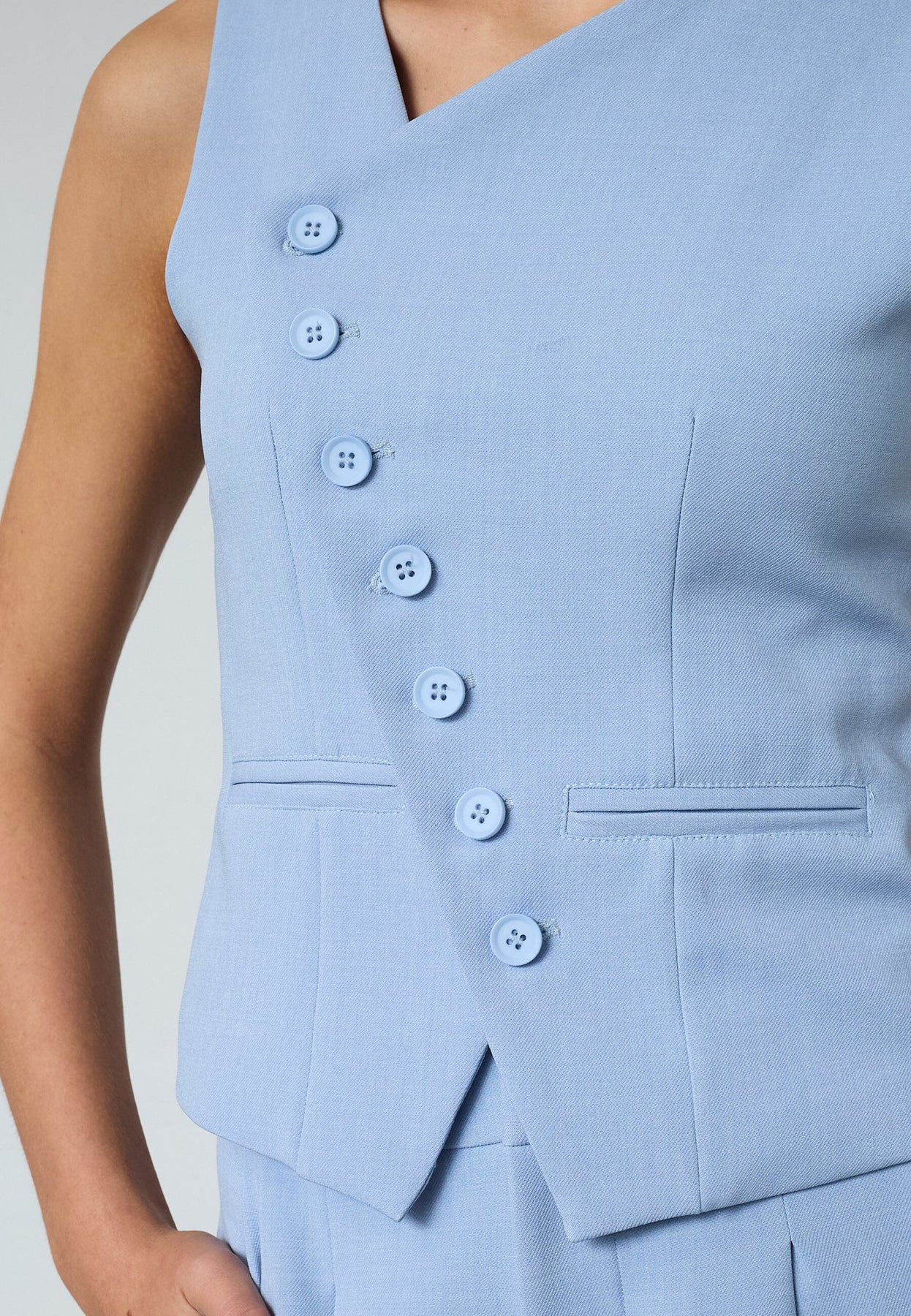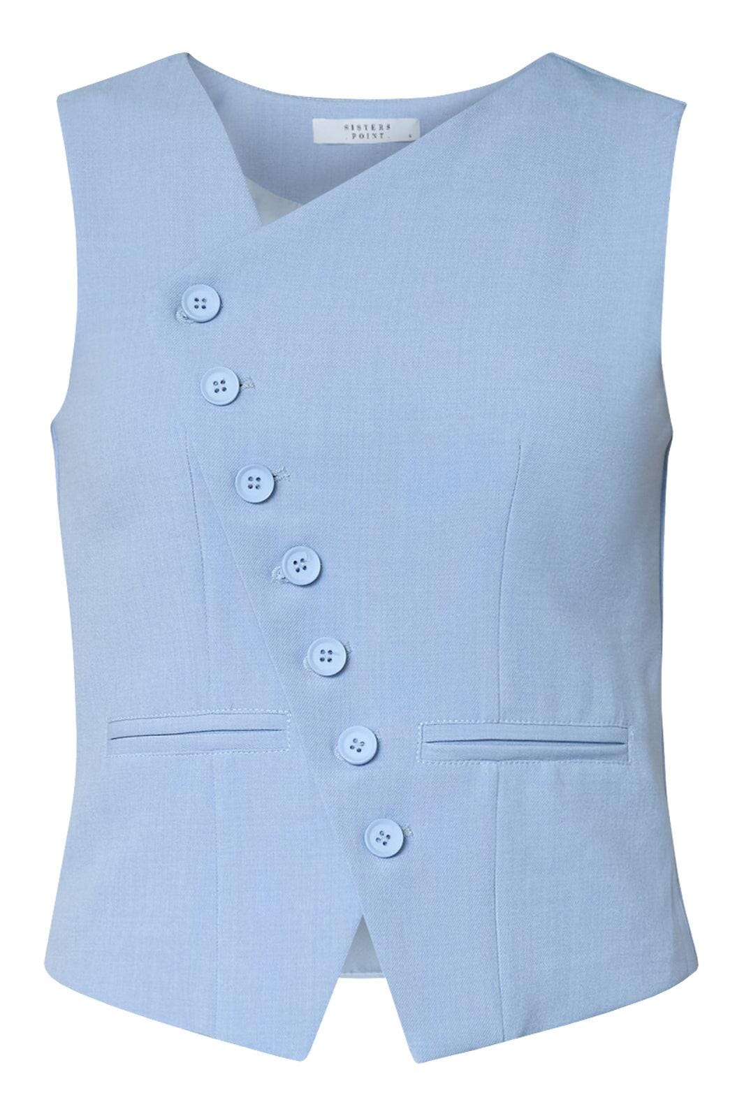 Een lichtblauw gilet van Sisters Point met asymmetrische knoopsluiting en V-hals. Het gilet heeft zes knopen langs de voorkant en twee decoratieve zakken.