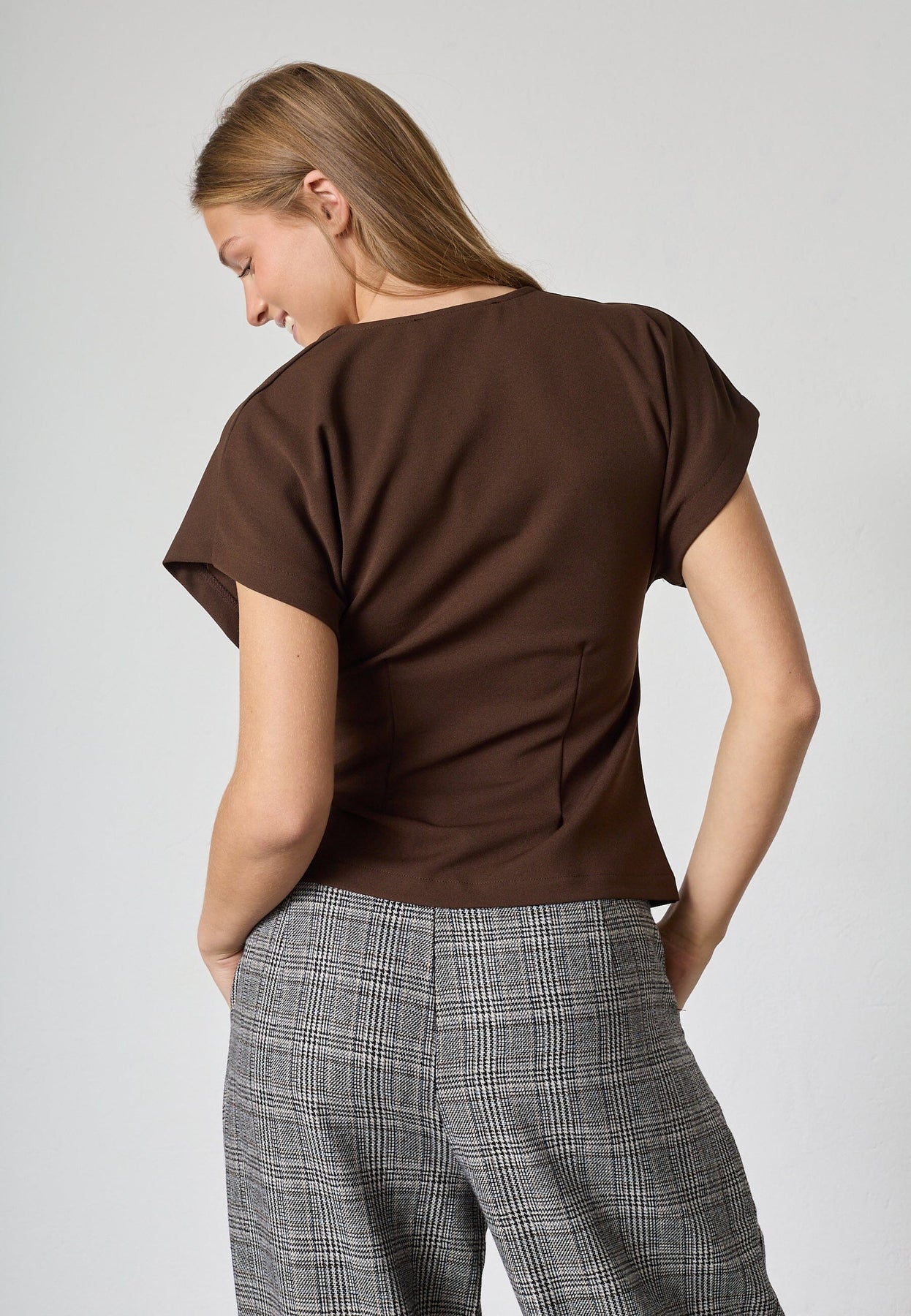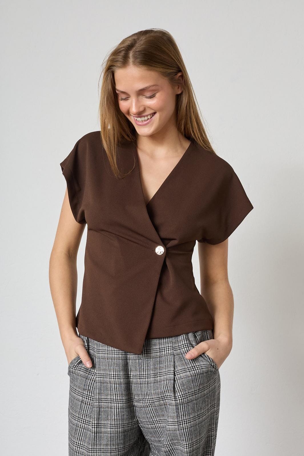 Donkerbruine top van Sisters Point met een wikkelontwerp en korte mouwen. De top heeft een diepe V-hals en een decoratieve gouden knoop aan de zijkant.