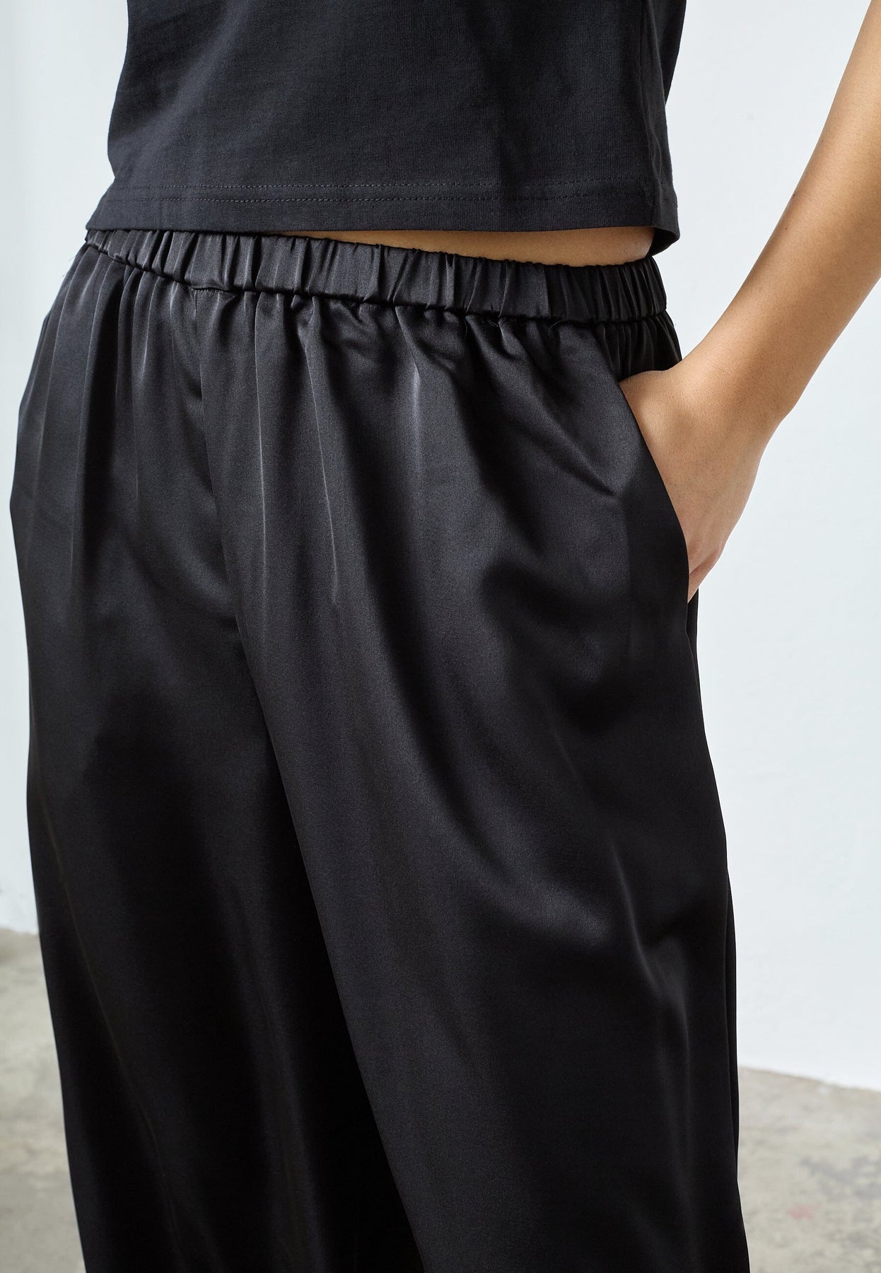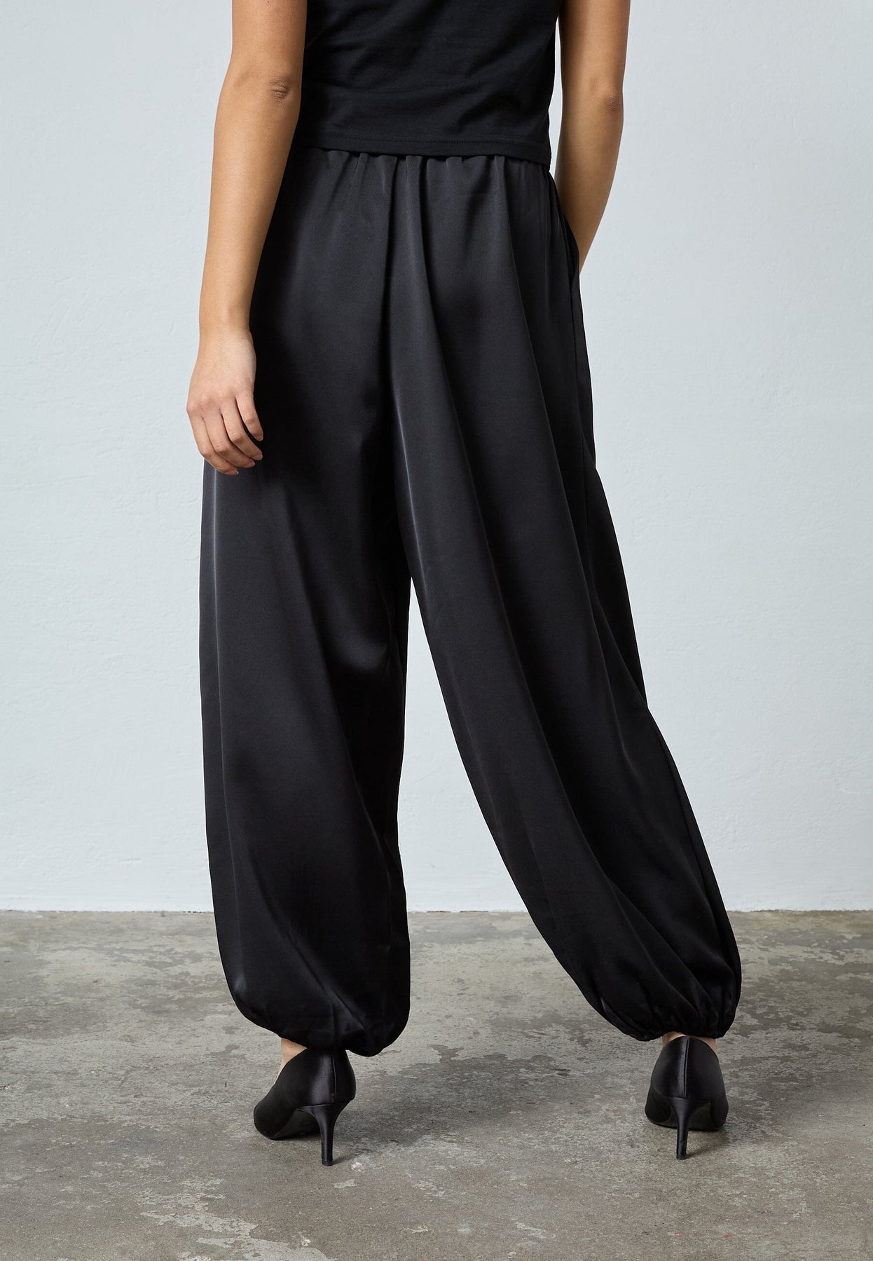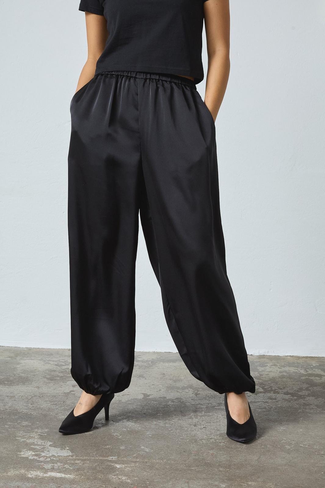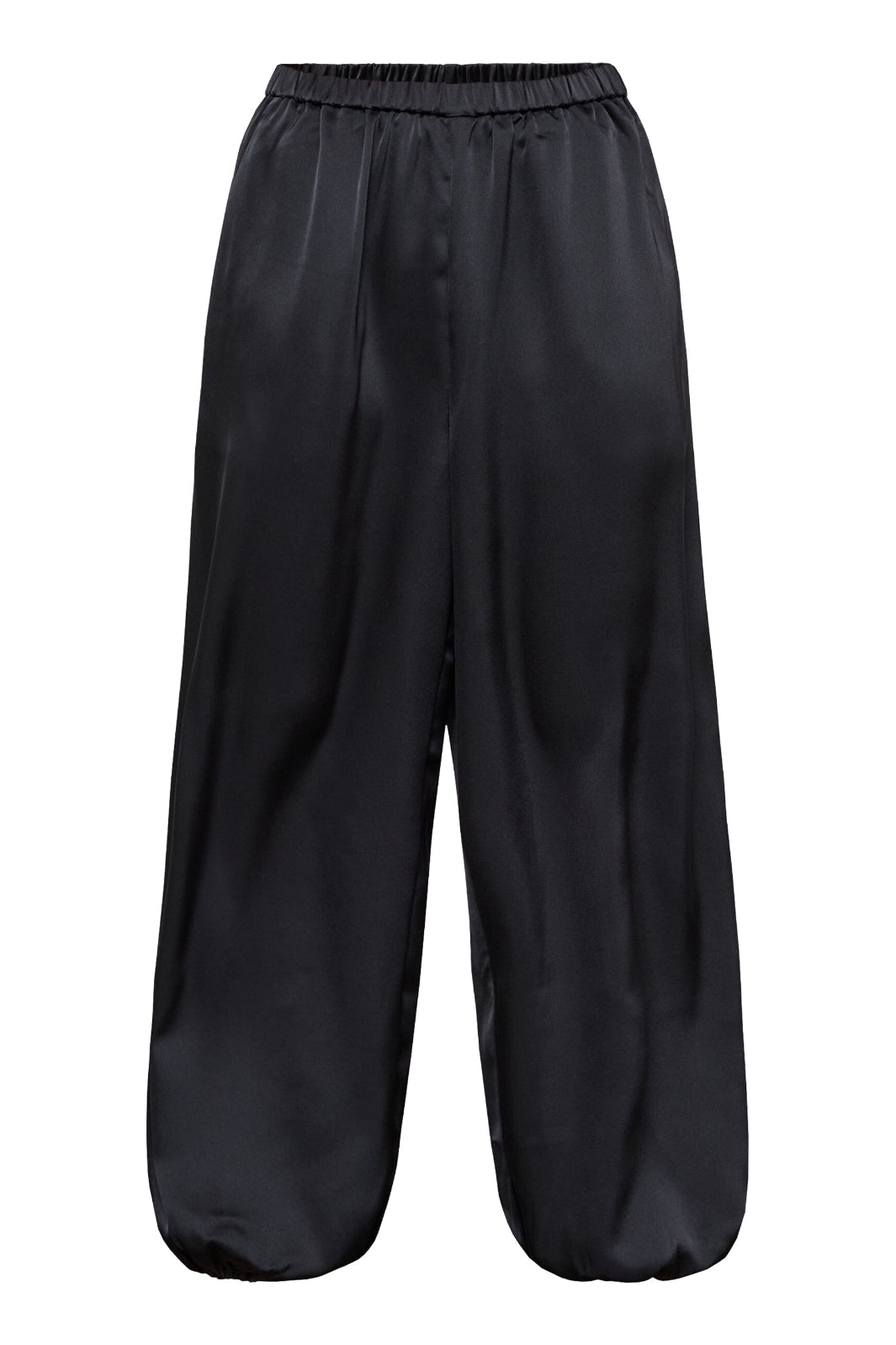 Zwarte broek van Sisters Point, gemaakt van 100% polyester met een gladde, glanzende afwerking. De broek heeft een losse pasvorm en een elastische tailleband.