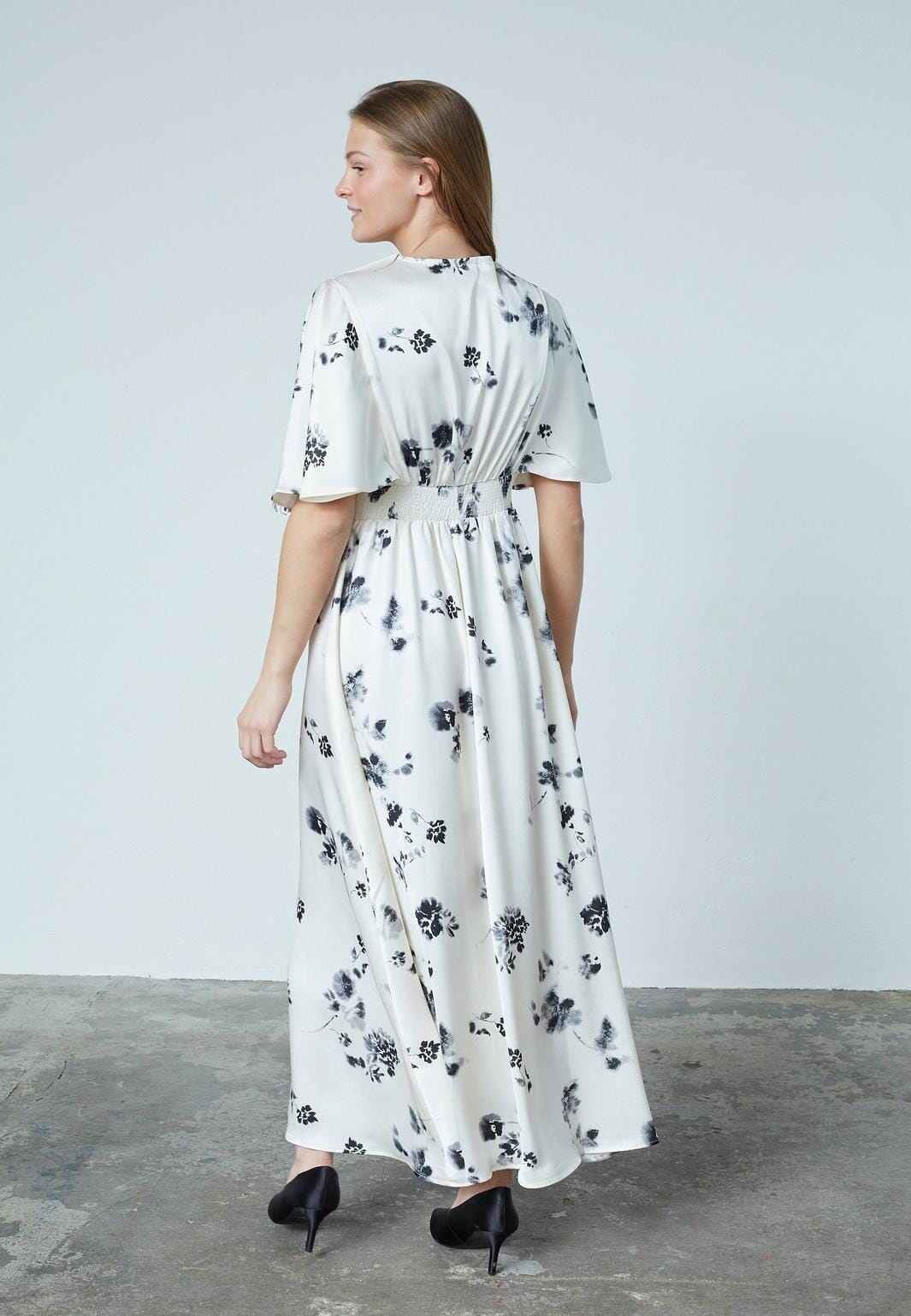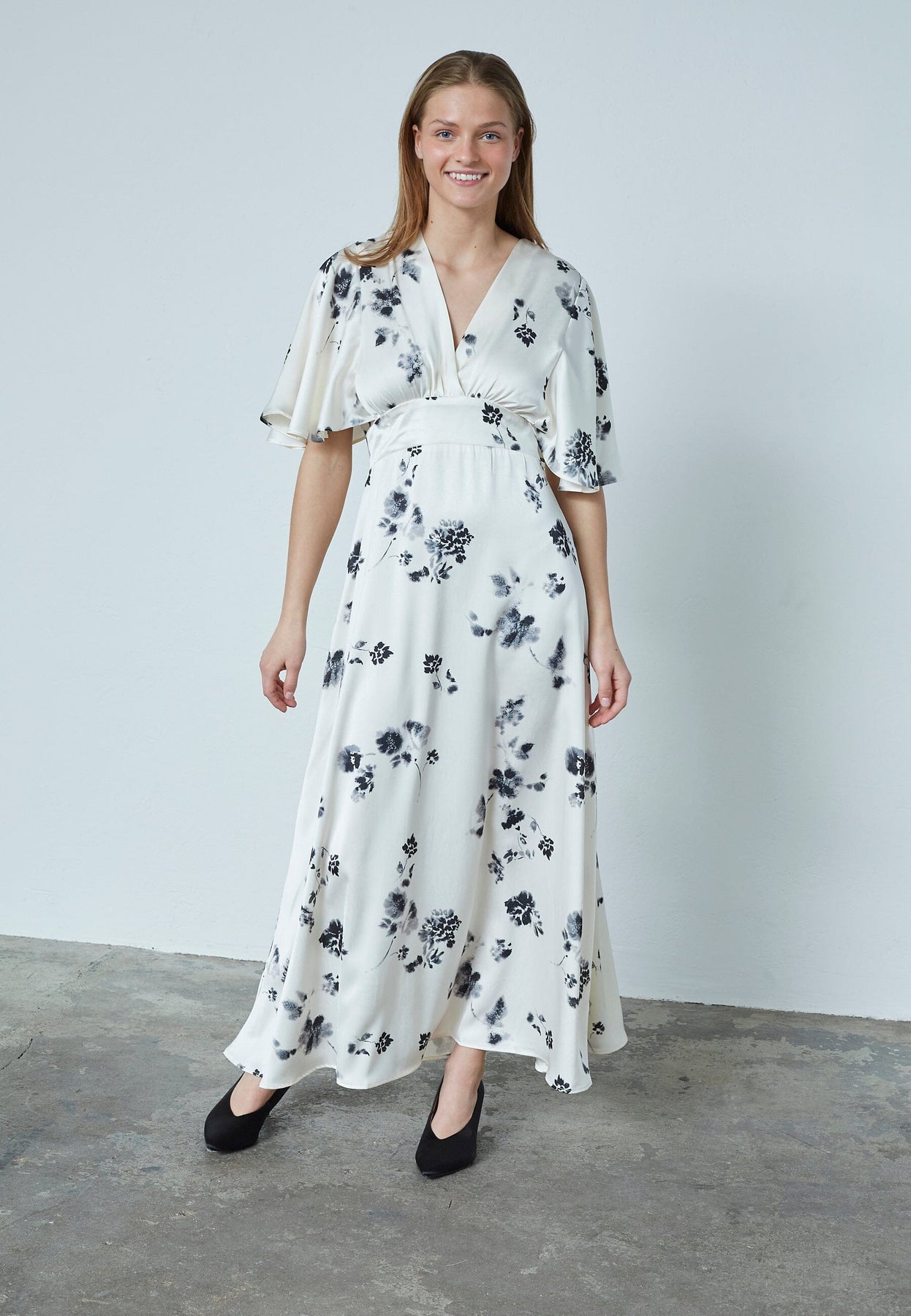Enkel-lange jurk van Sisters Point in crème met zwarte bloemen. De jurk heeft een V-hals en korte fladdermouwen. De smock taille zorgt voor een goede pasvorm.