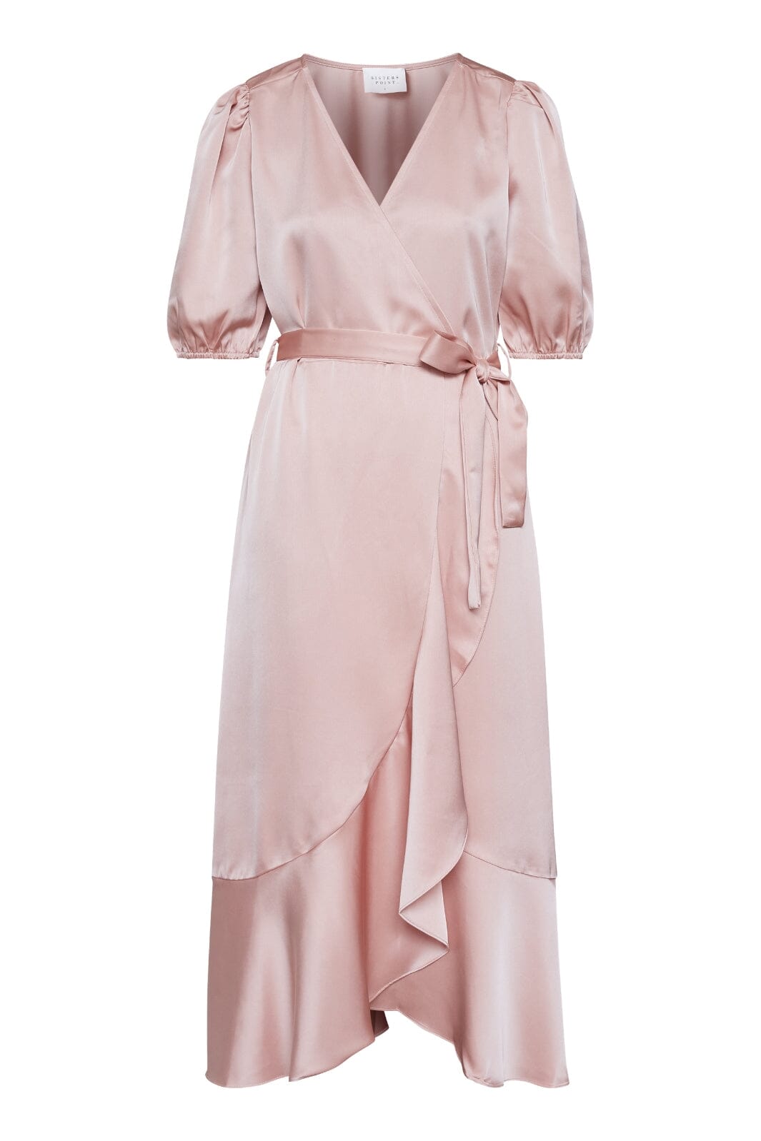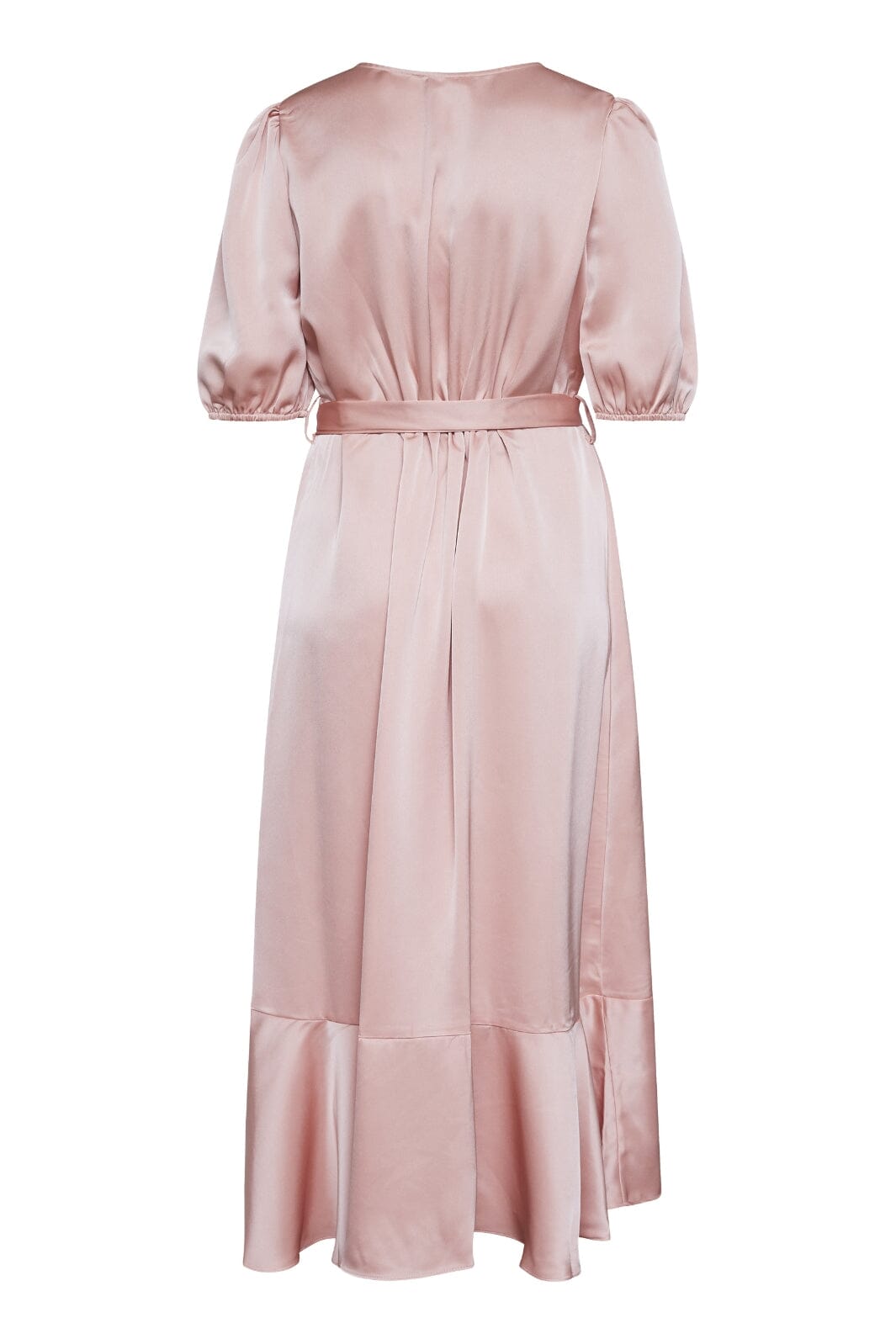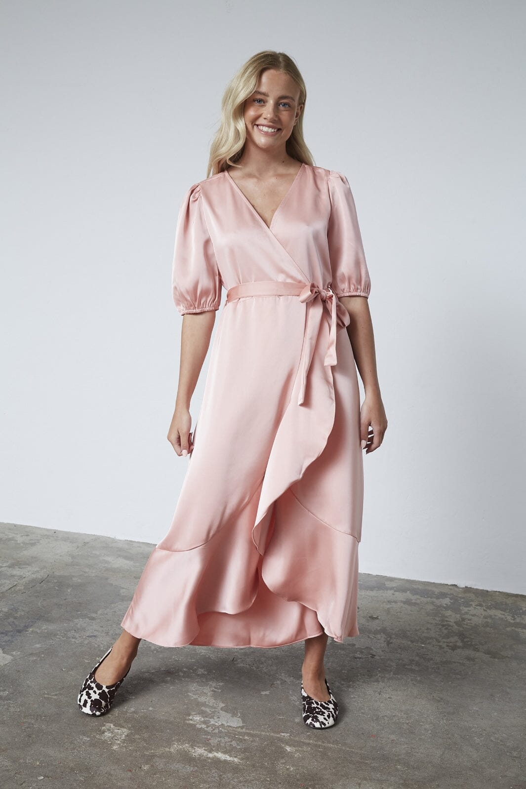 Wikkeljurk van Sisters Point in koraalkleurige satijn met pofmouwen. De jurk heeft een wikkelontwerp met een strikband in de taille en een vloeiende rok met een volantrand.
