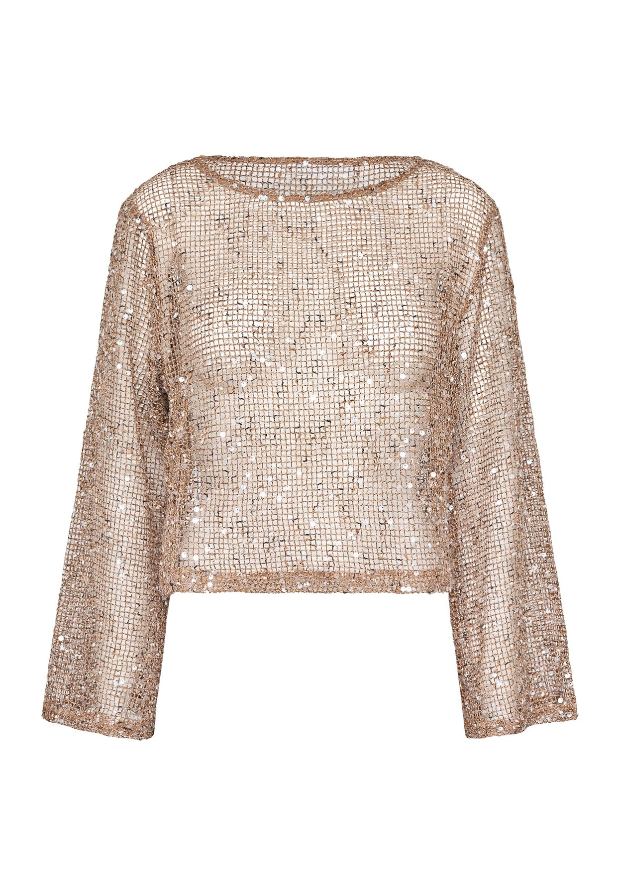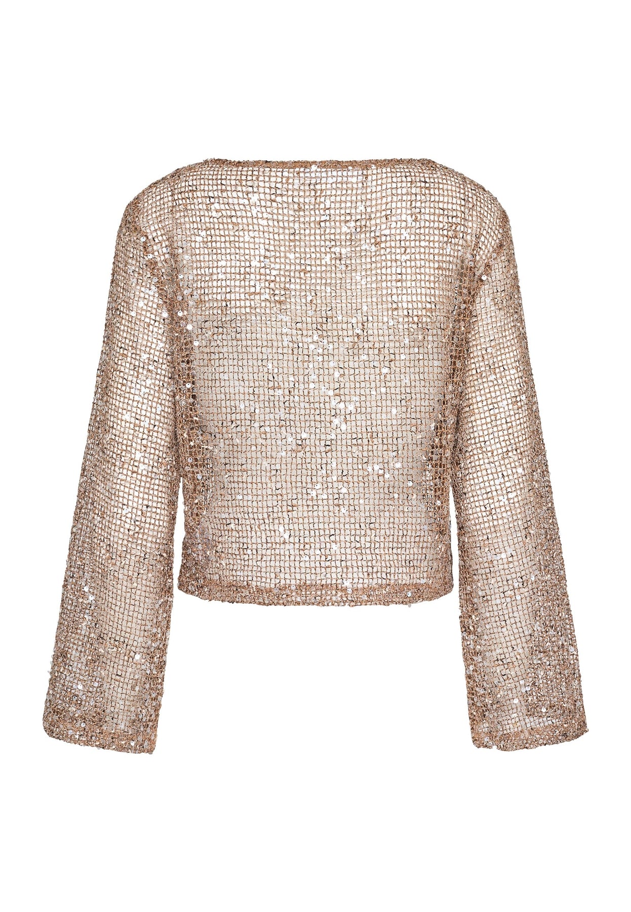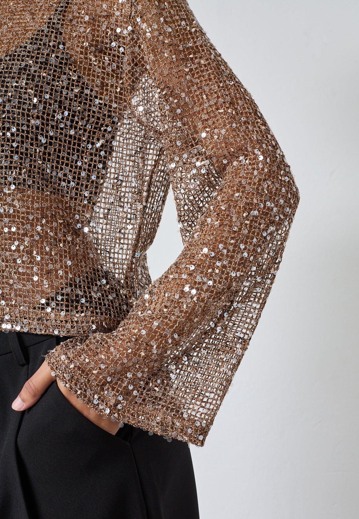 Een bruine glittertop van Sisters Point met pailletten op transparant mesh. De top heeft lange mouwen en een ronde halslijn.