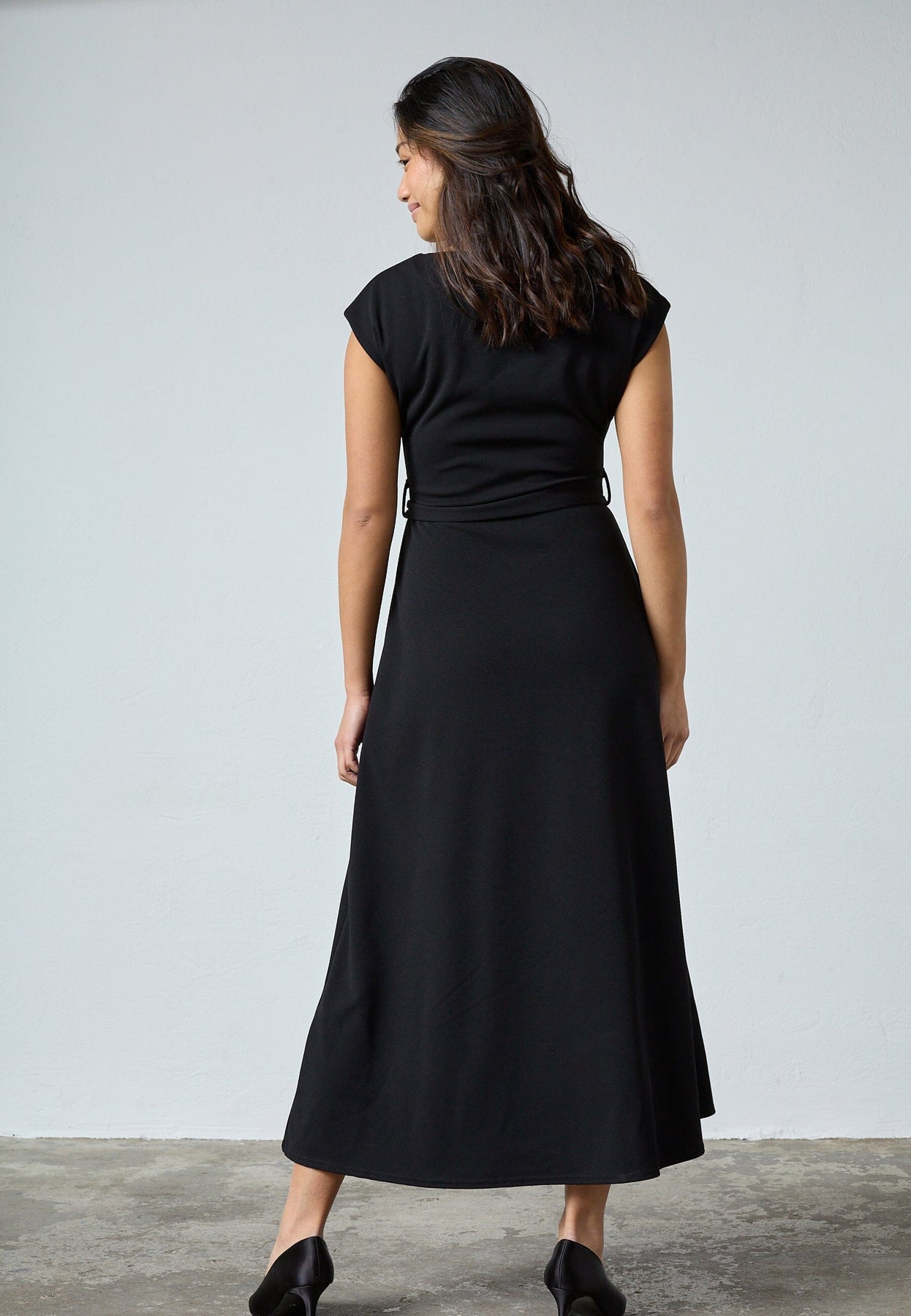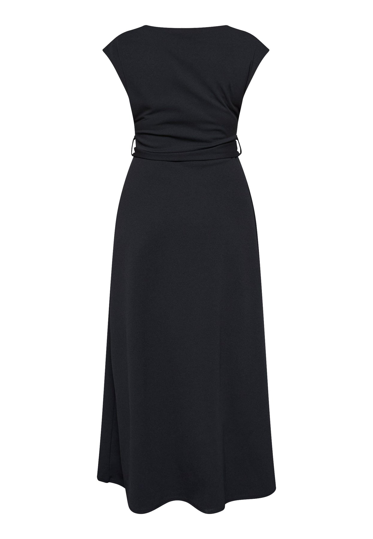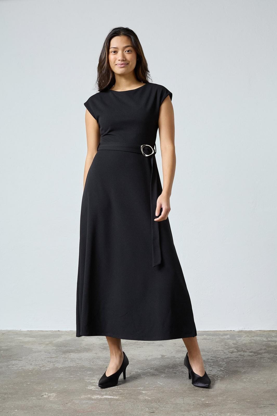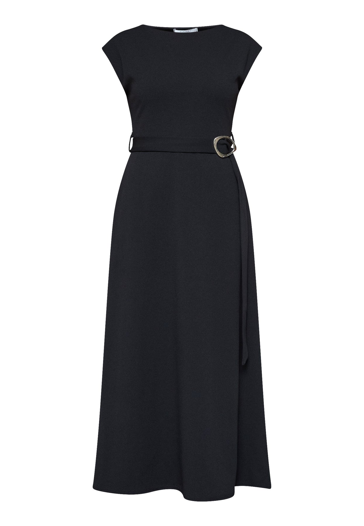 Zwarte jurk van Sisters Point in glad polyester met een vast tailleceintuur en een grote, ronde gesp aan de voorkant.