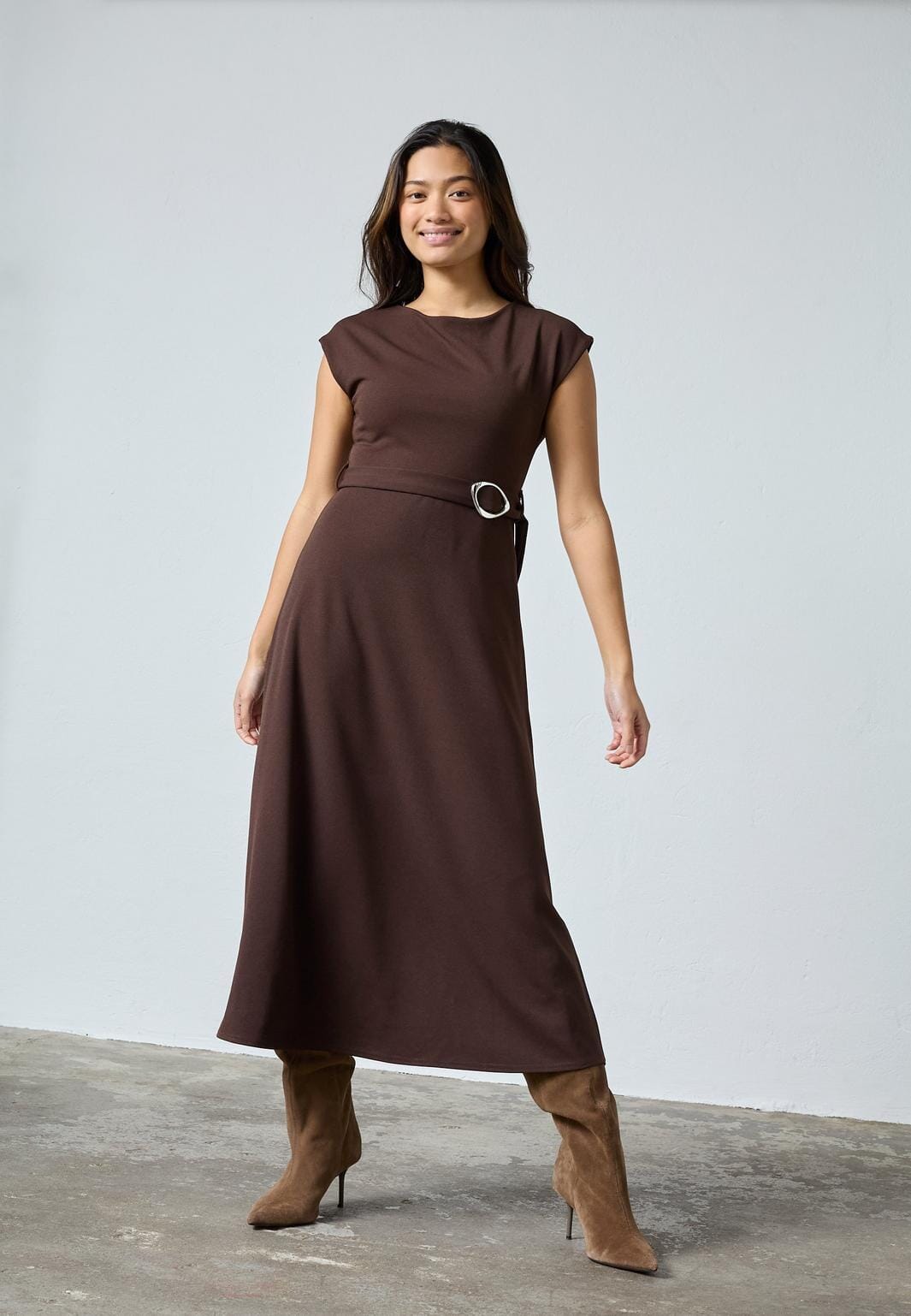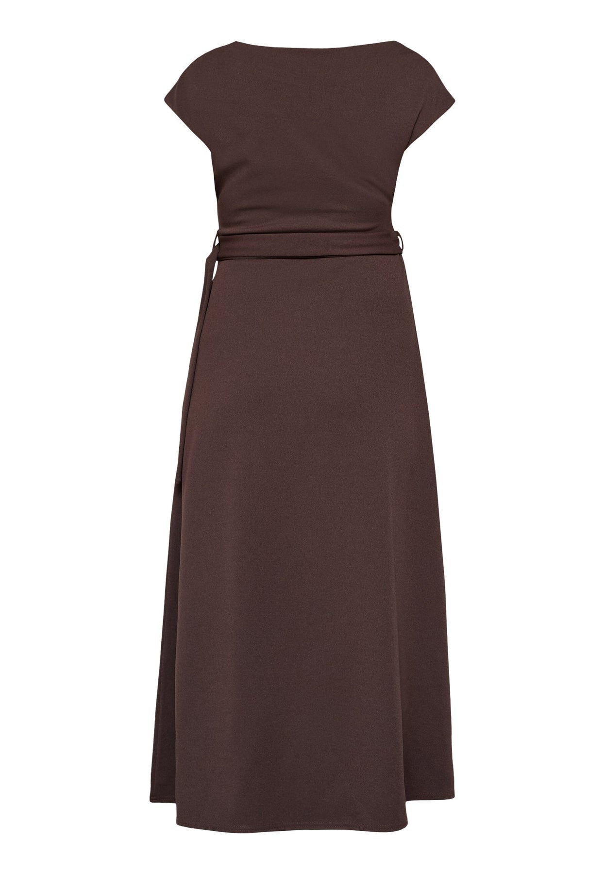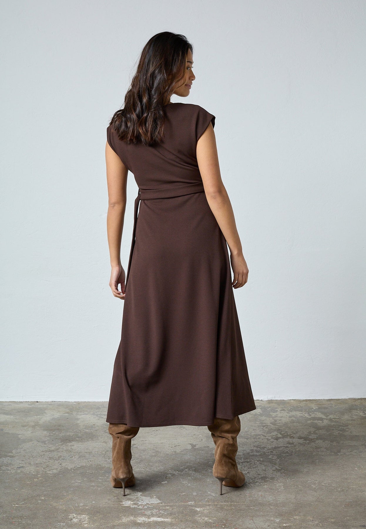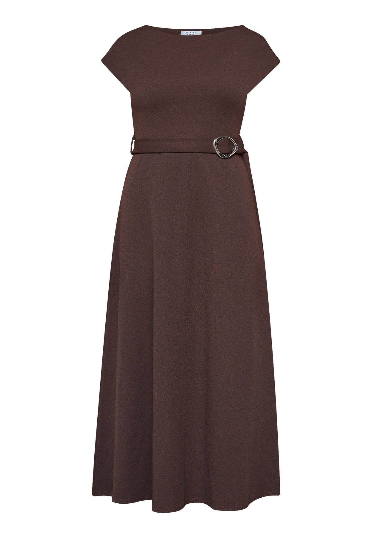 Midilengte jurk van Sisters Point in een diepe chocoladebruine kleur. De jurk is gemaakt van glad polyester dat zwaar valt en zorgt voor een gestructureerd silhouet.