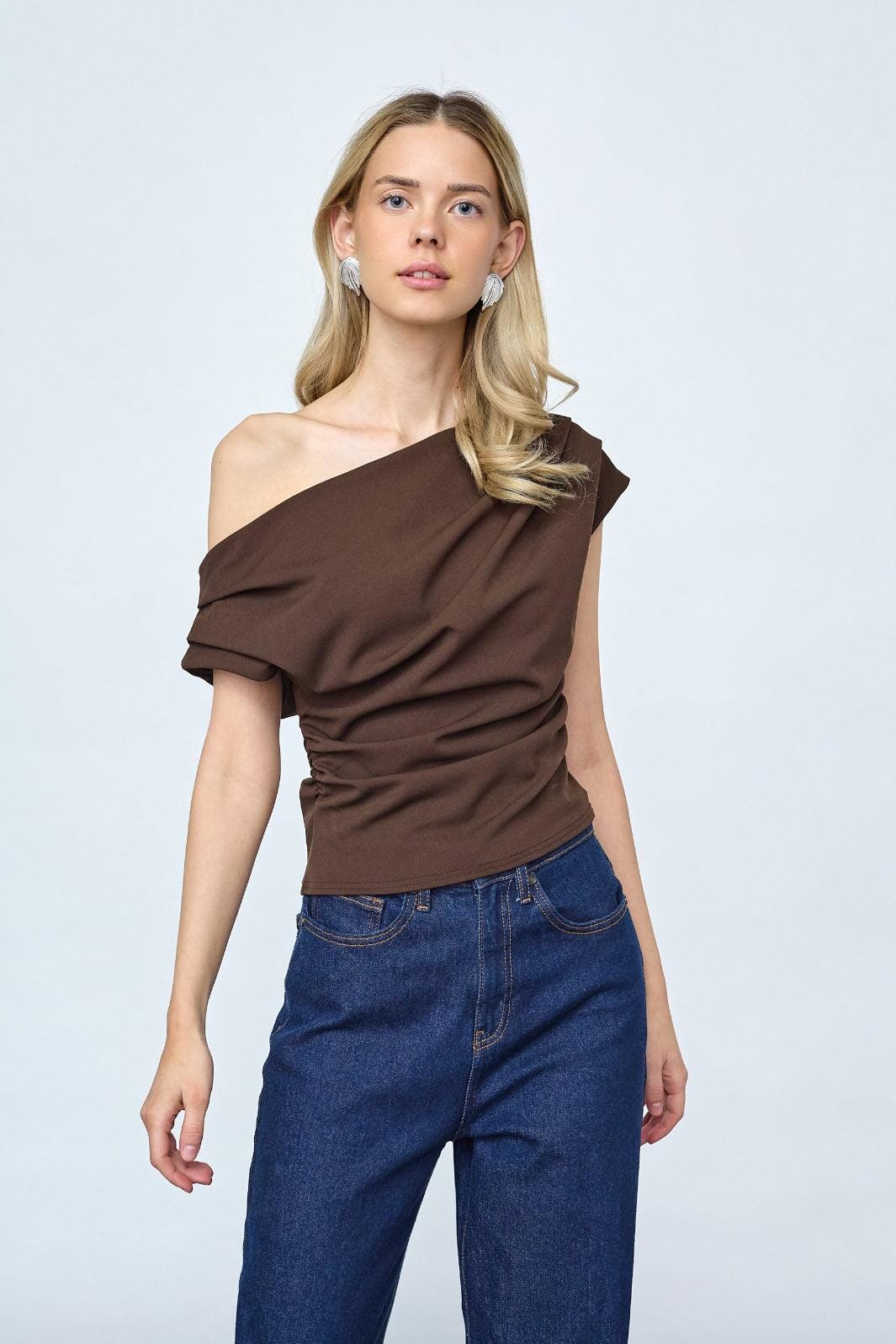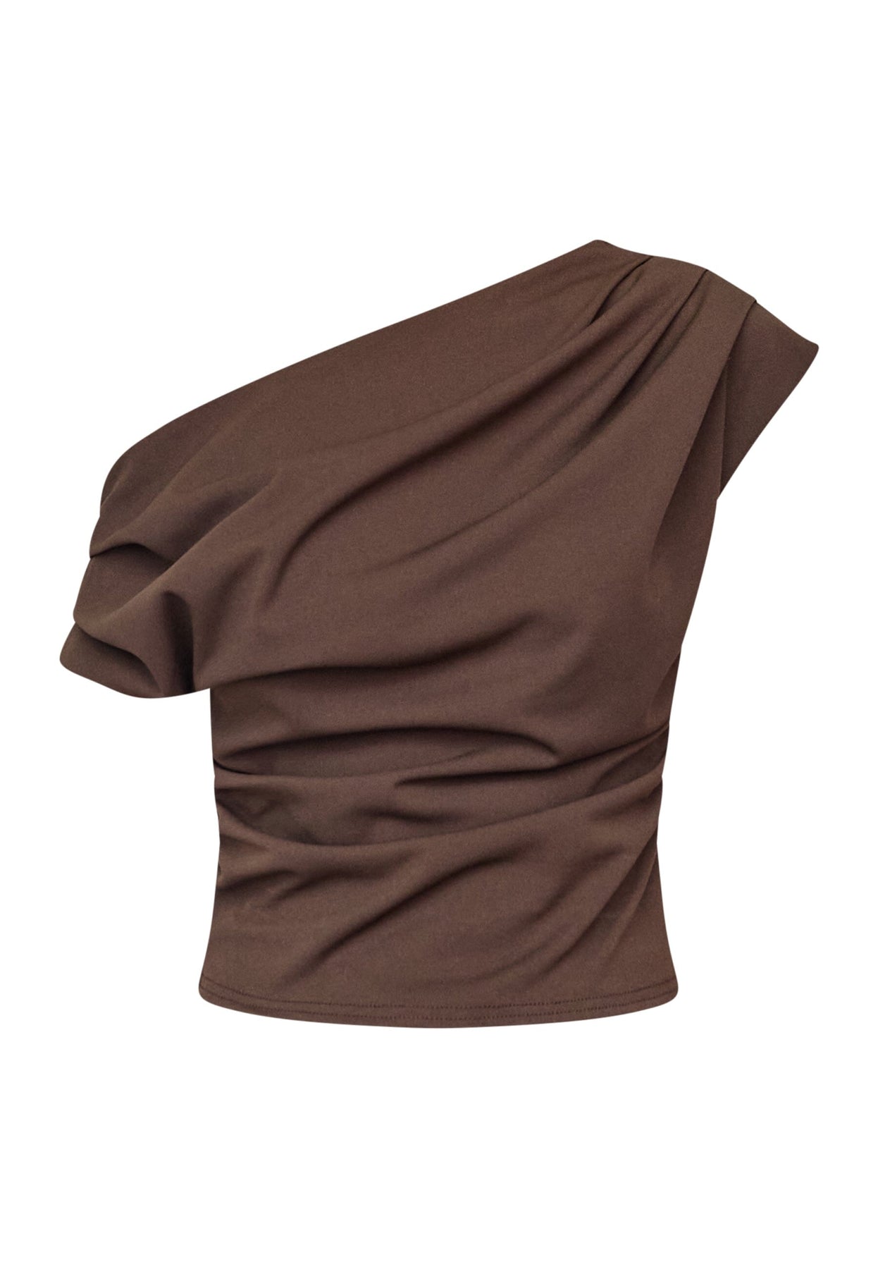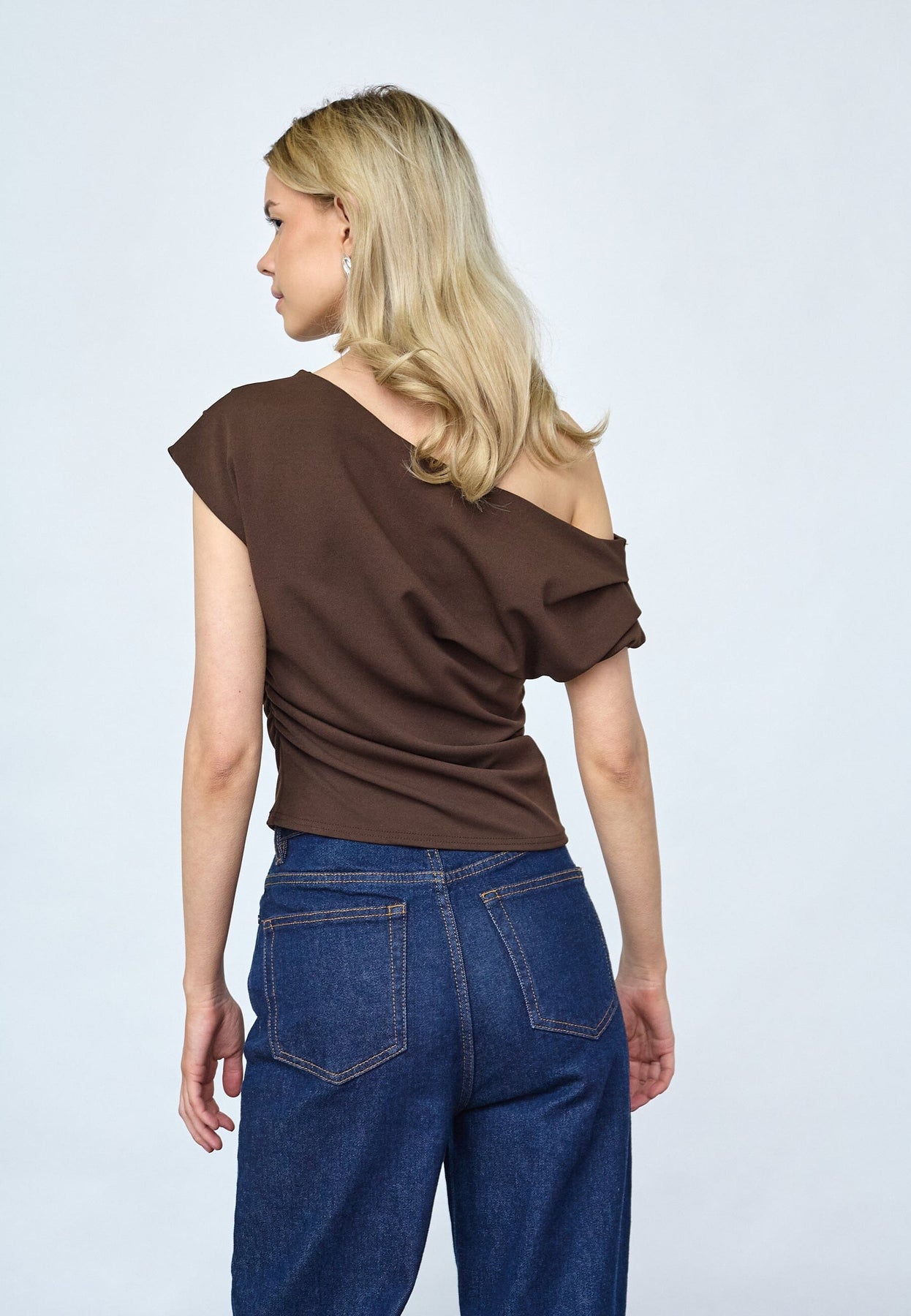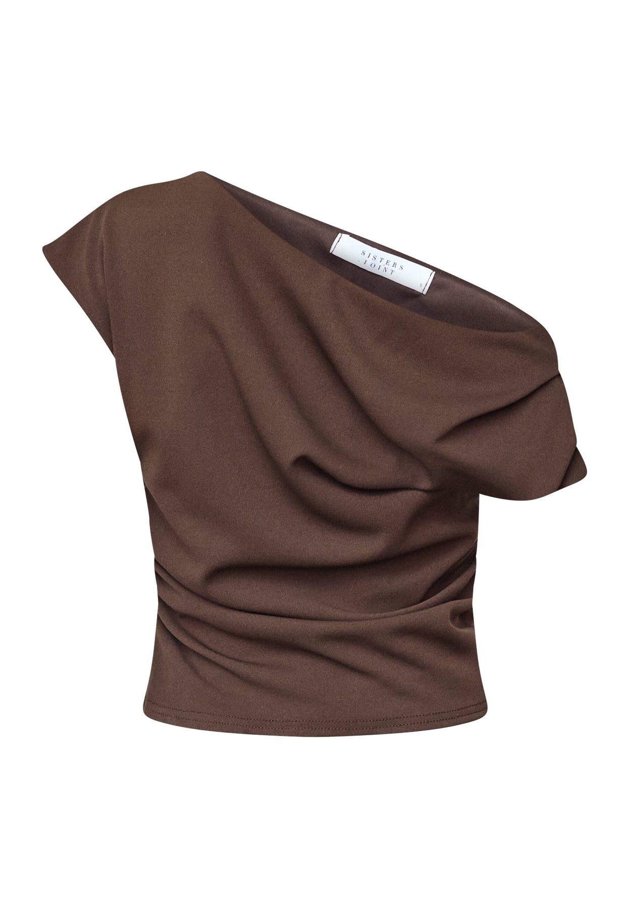 Een chocoladebruin topje van Sisters Point met een asymmetrisch off-shoulder-design. Het topje is gemaakt van een polyestermix en heeft een aangesloten pasvorm.
