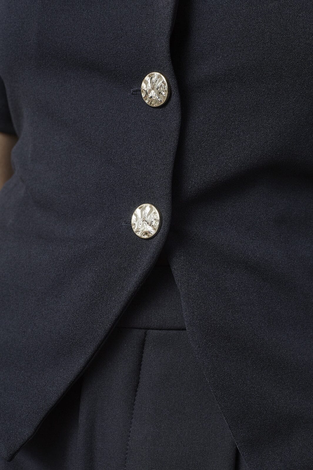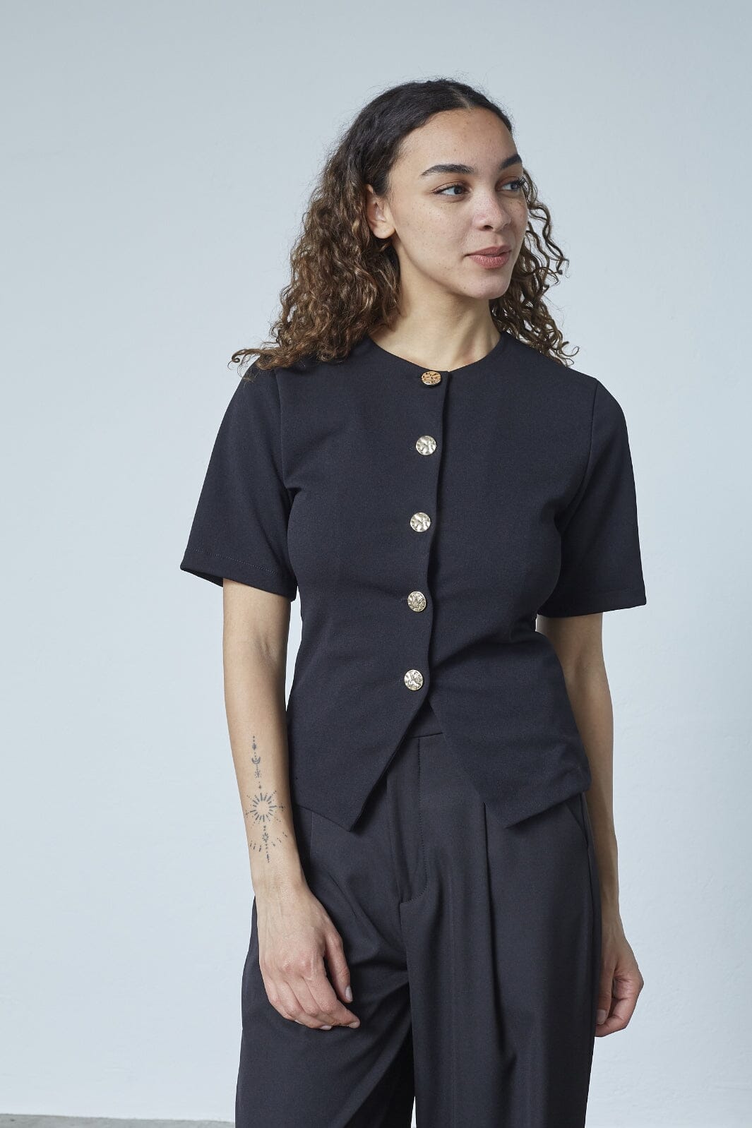 Zwarte top van Sisters Point met aansluitende pasvorm. De top heeft korte mouwen en een ronde halslijn, evenals decoratieve knopen aan de voorkant en een lichte split aan de onderkant.