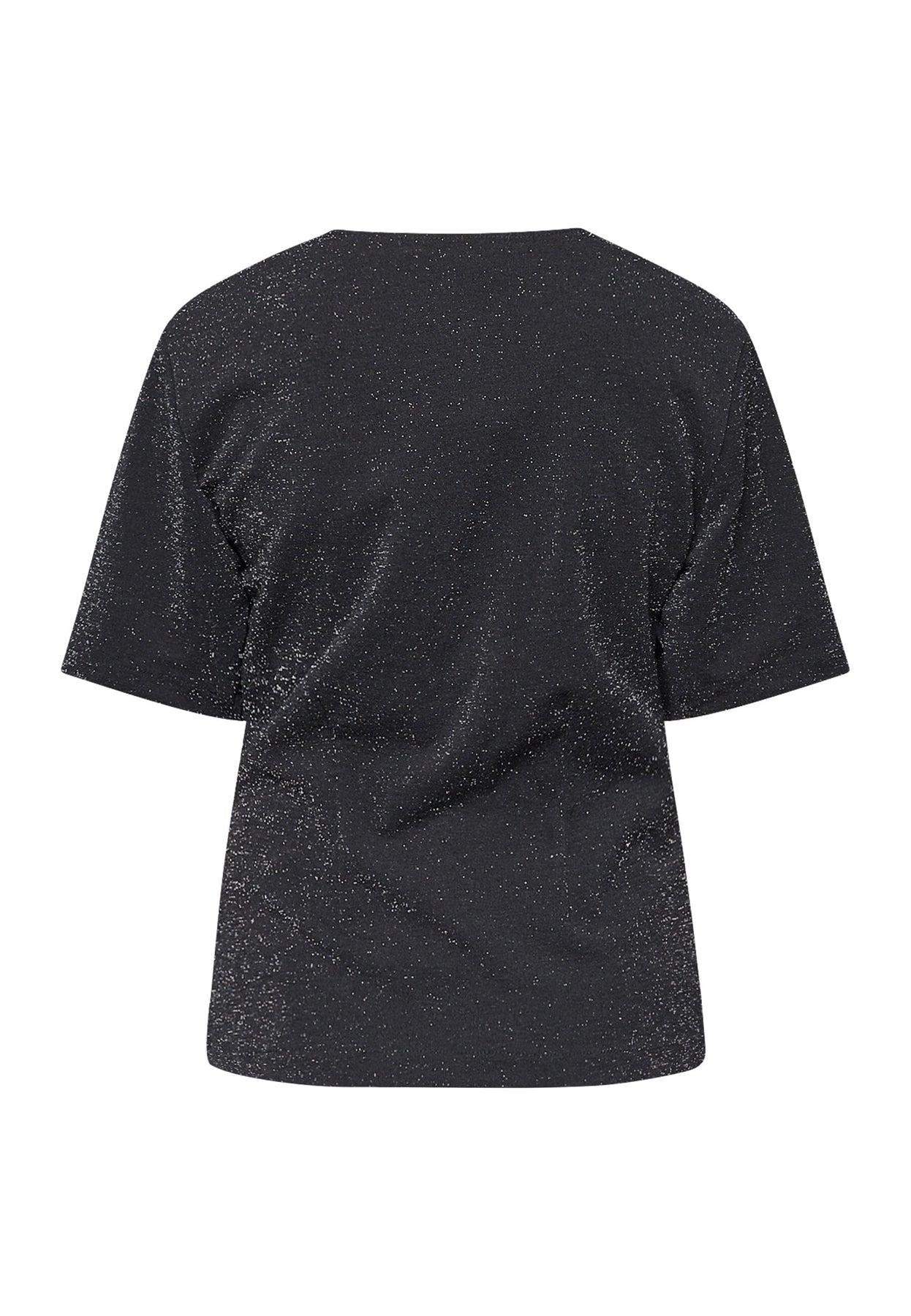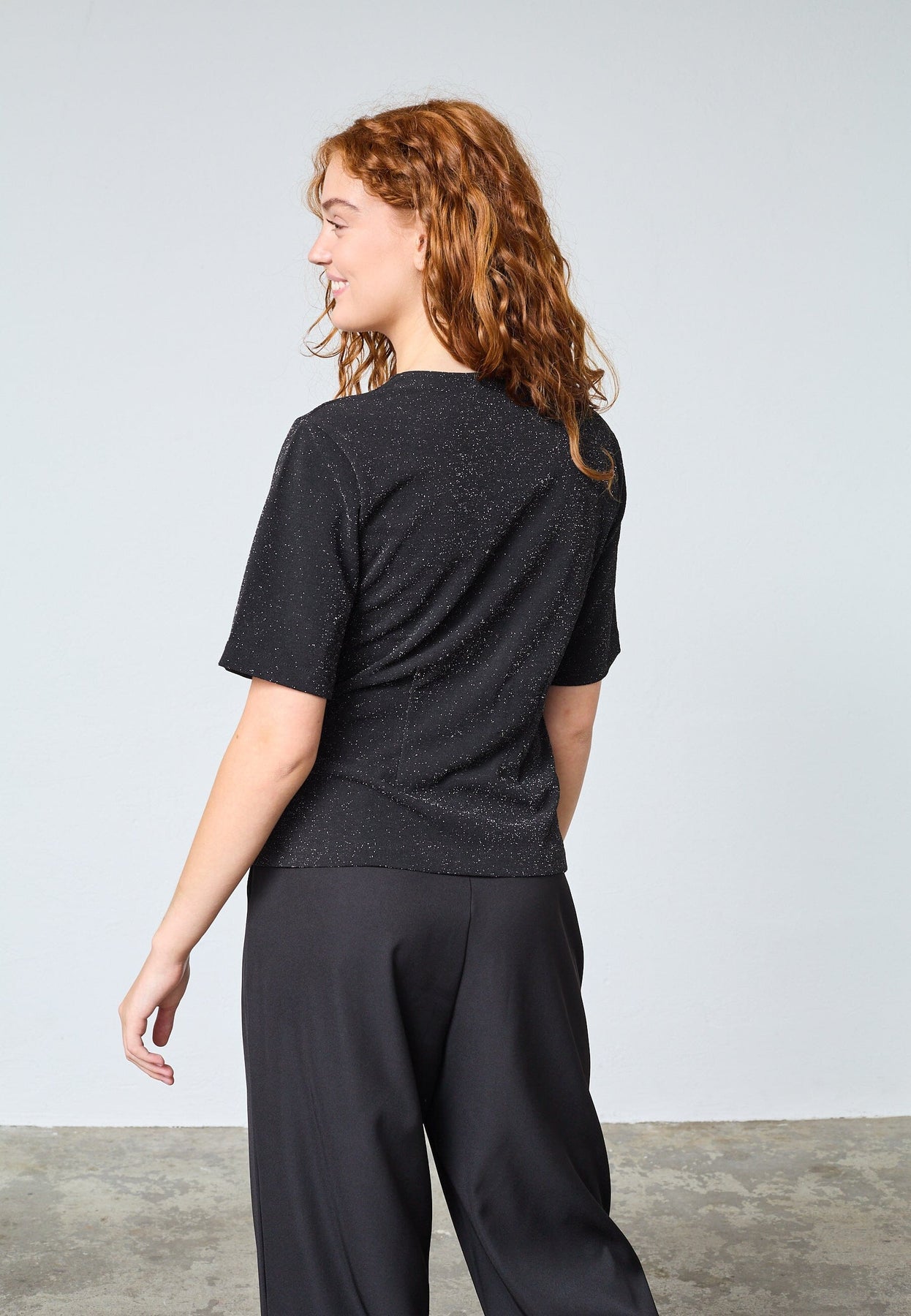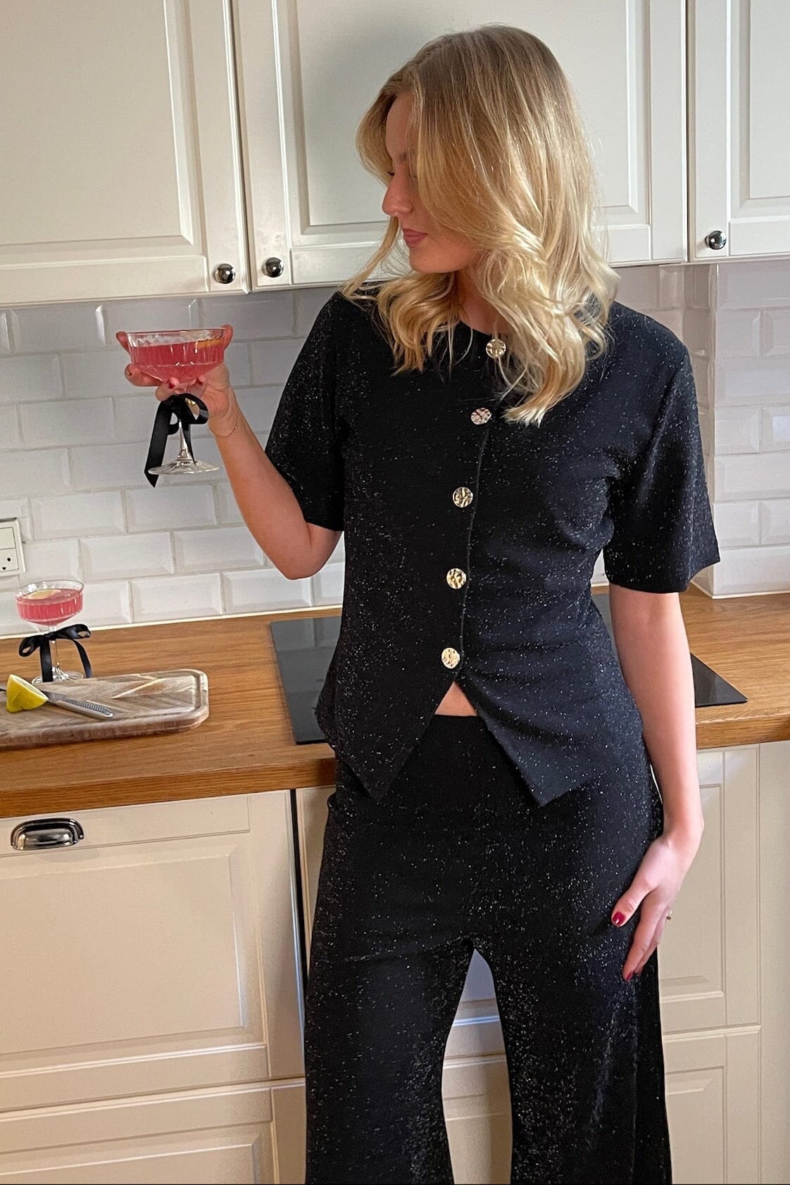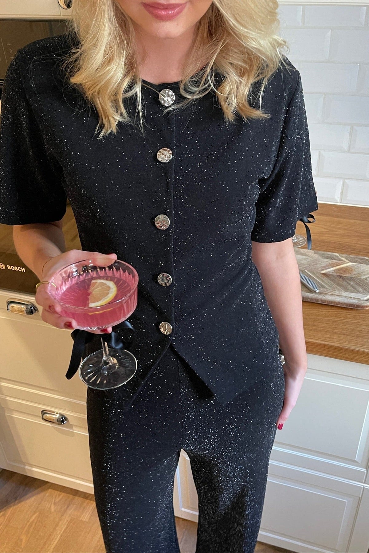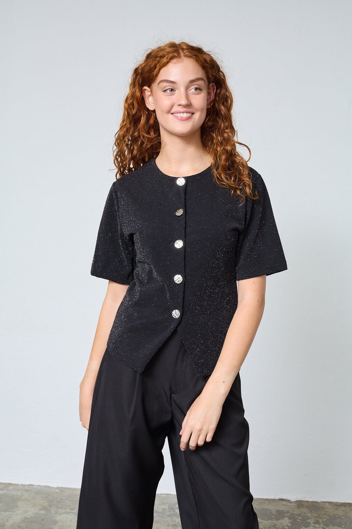 Zwarte top met een glinsterend zilvereffect van Sisters Point. De top heeft een ronde halslijn en korte mouwen met decoratieve zilveren knopen aan de voorkant.