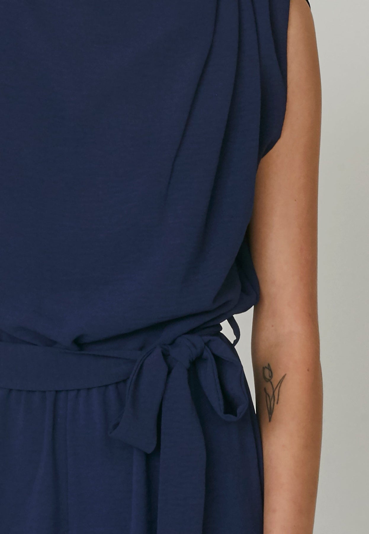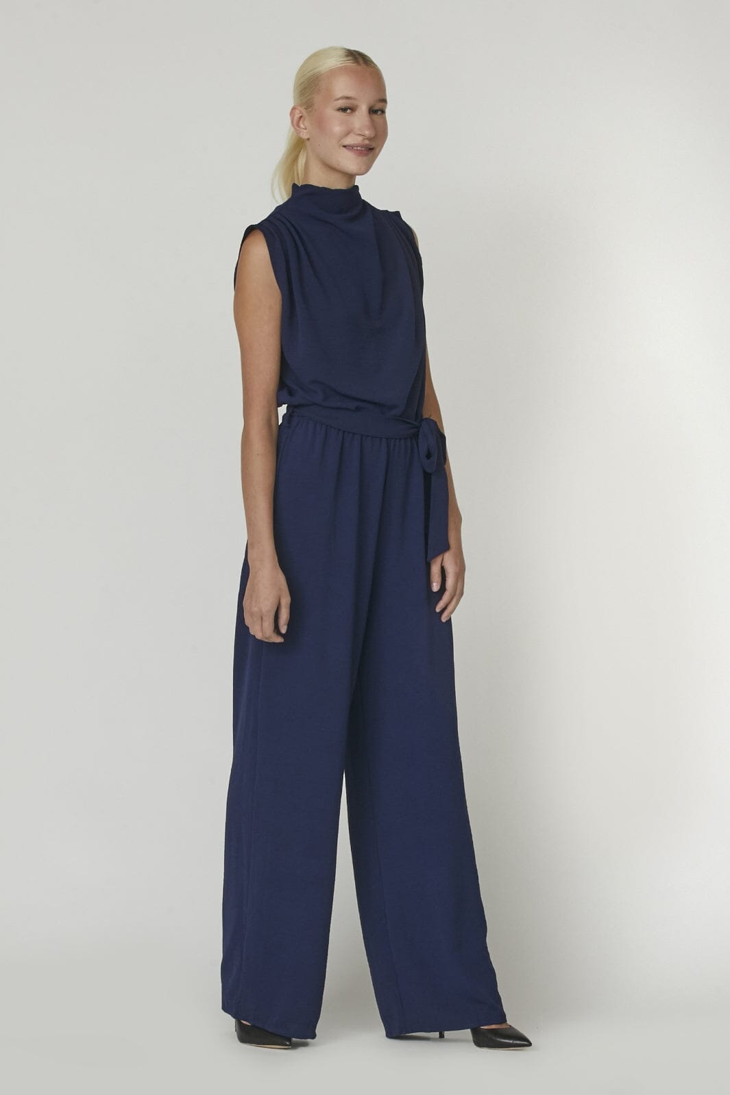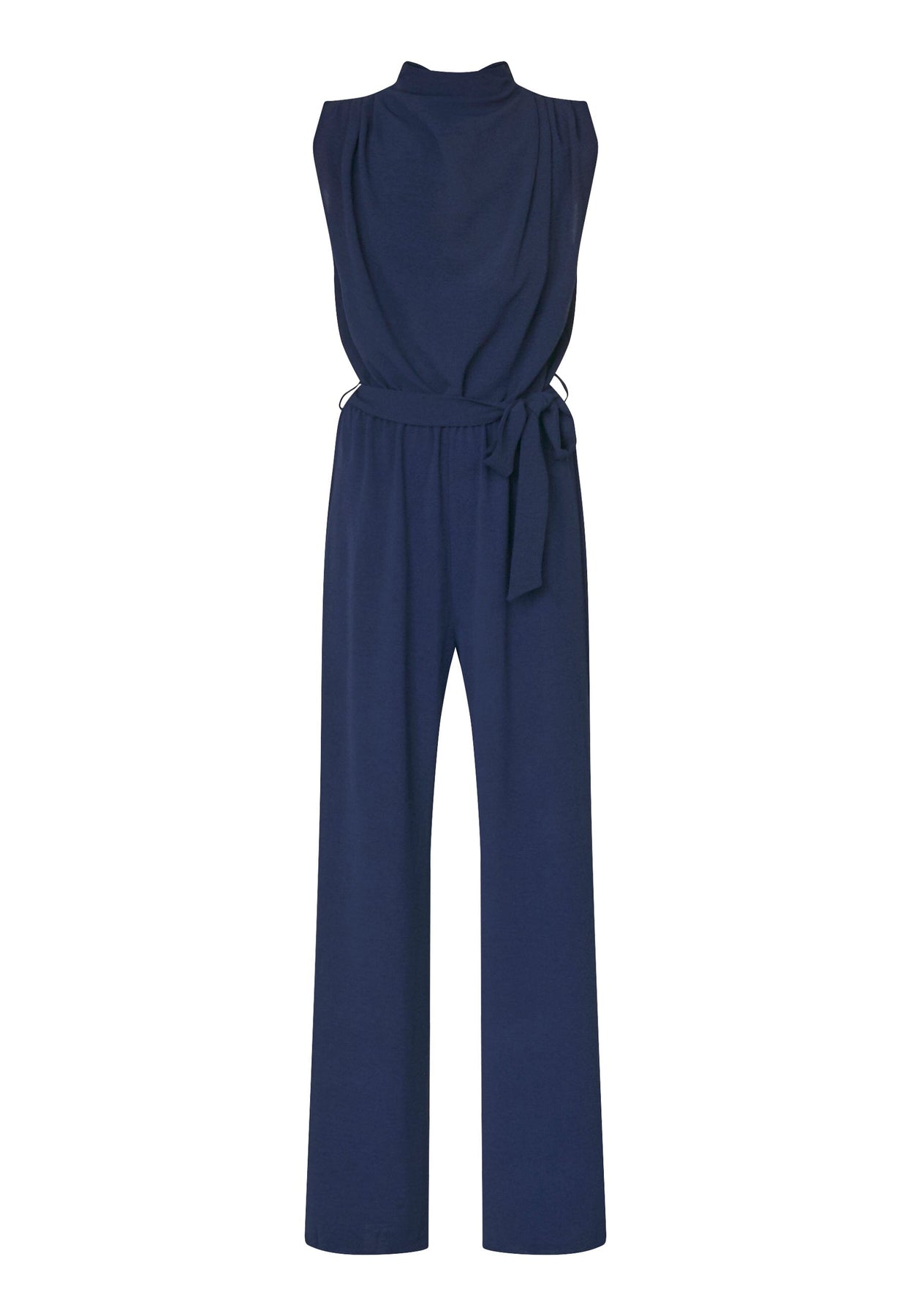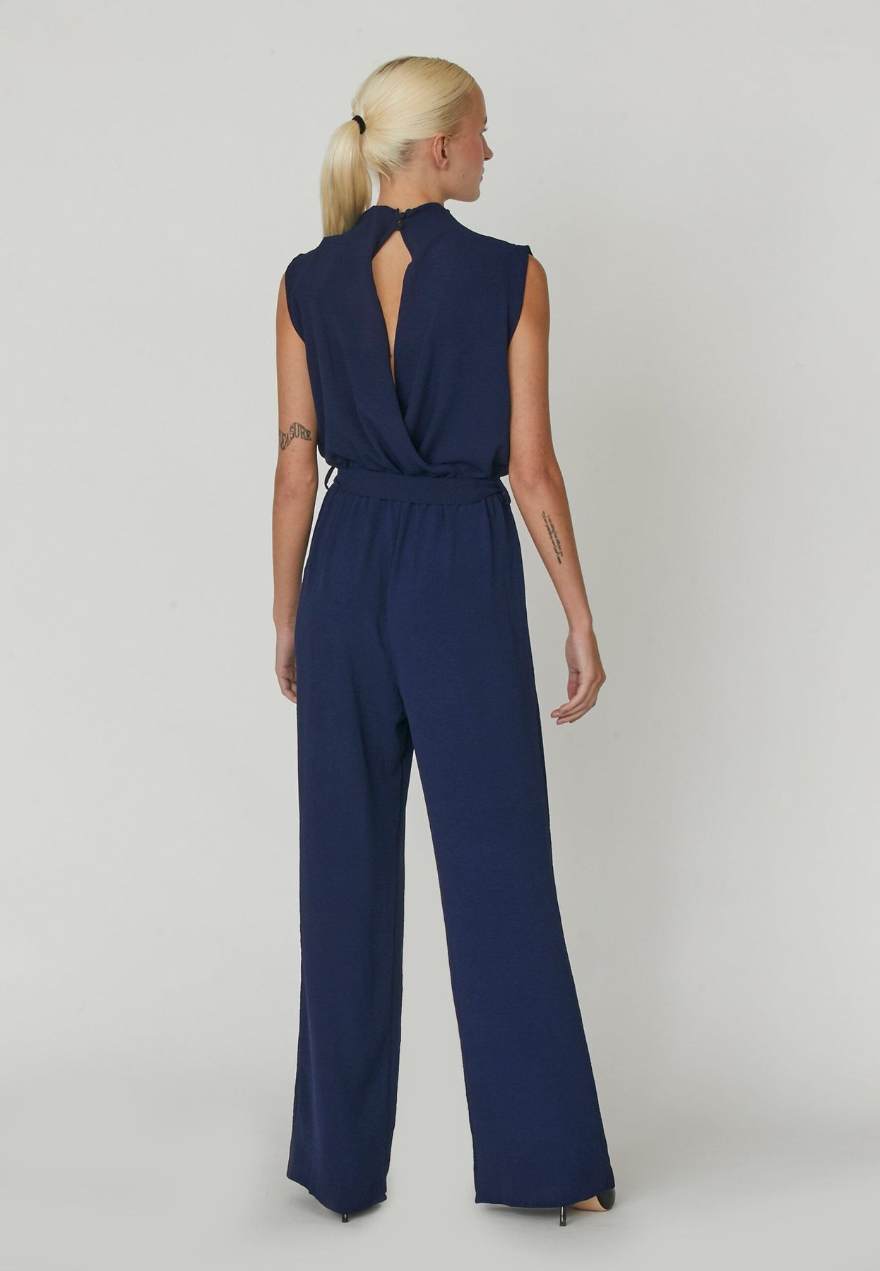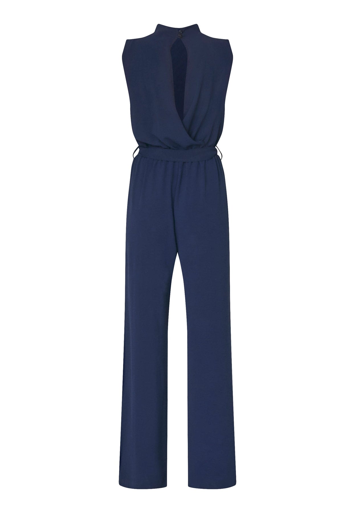 is een mooie effen jumpsuit met een wrap detail op de rug. De jumpsuit heeft lange rechte pijpen en een afneembare riem. Er zit een knoop in de kraag aan de achterkant. Het model draagt maat S.