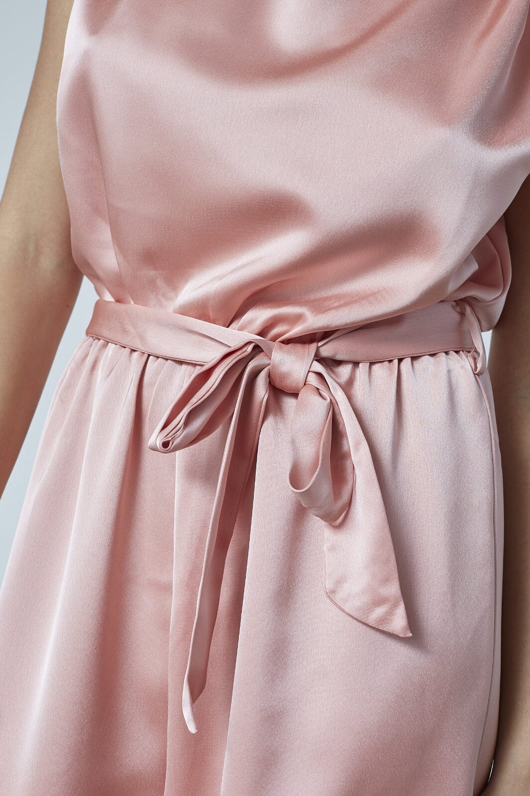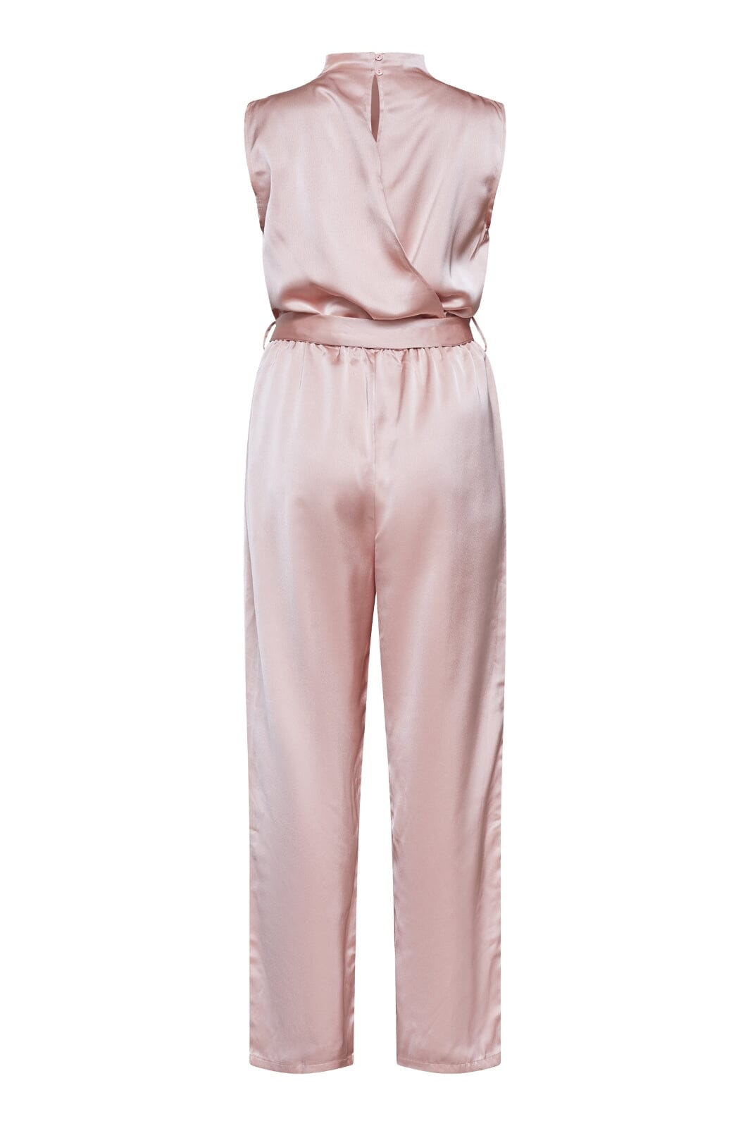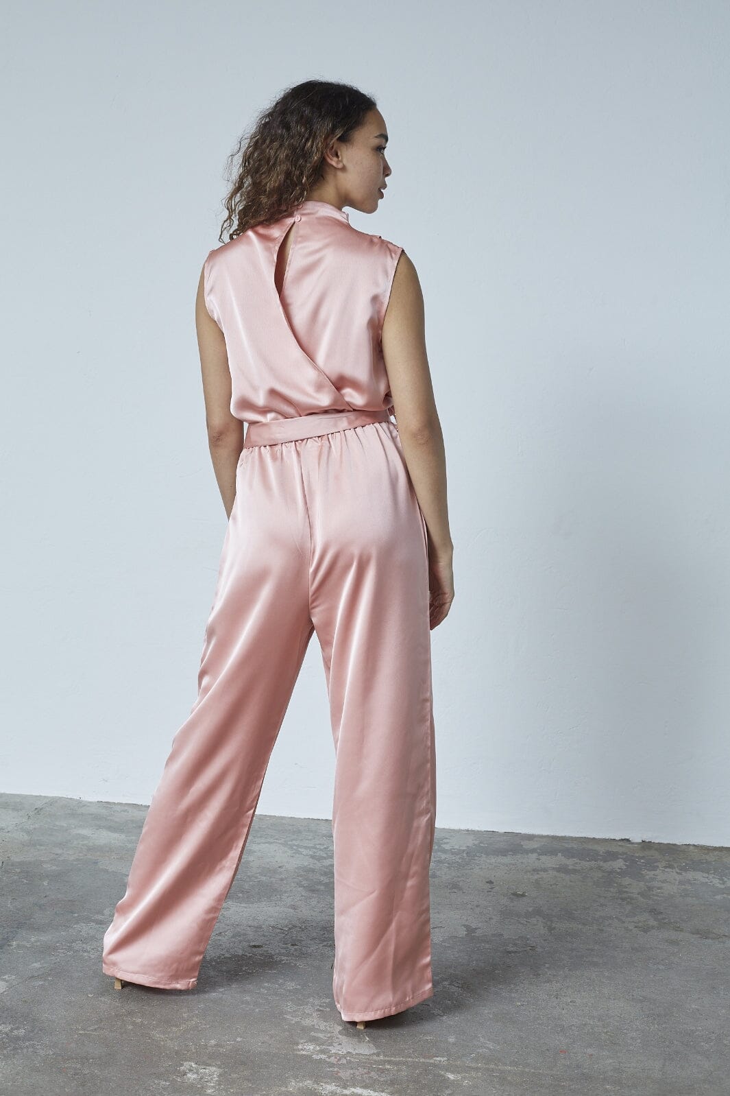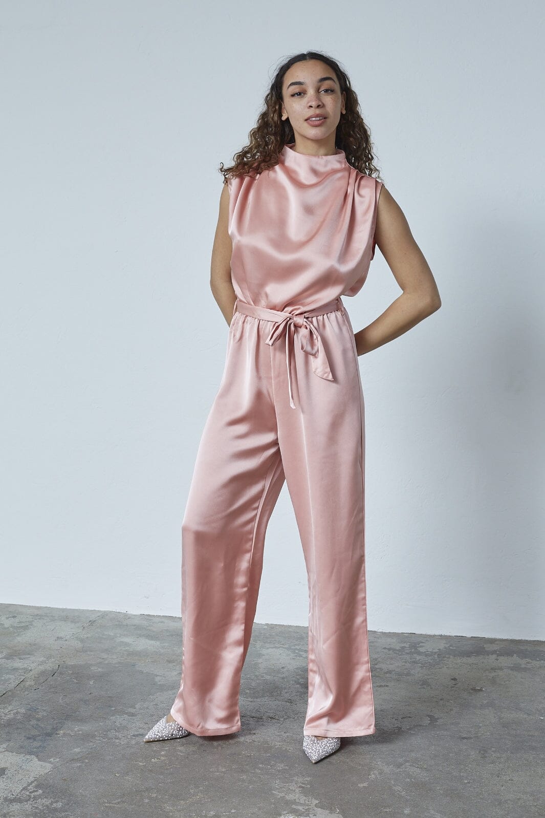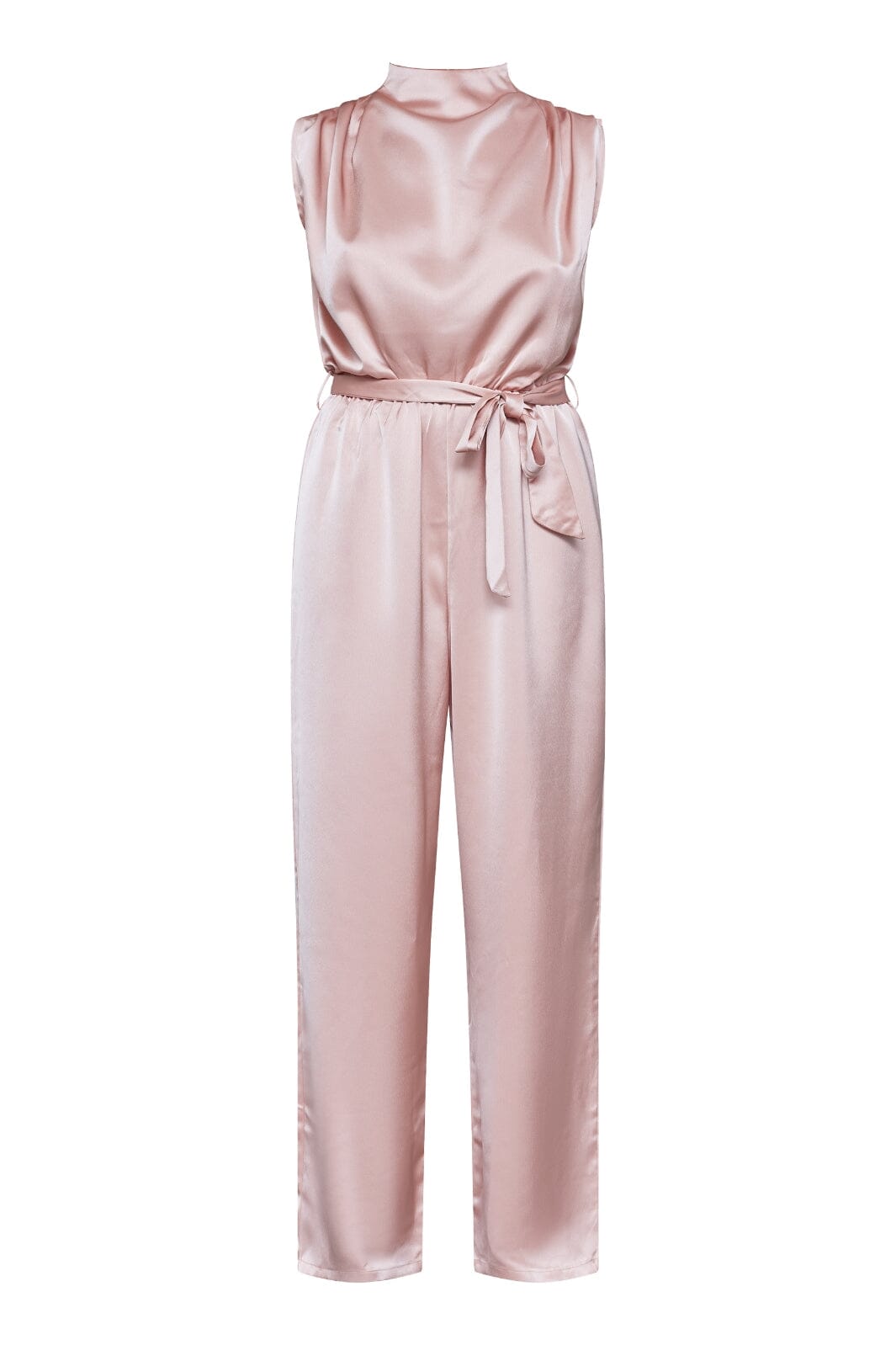 Mouwloze jumpsuit van satijn in koraalroze kleur. Hij heeft een hoge halslijn, een uitsnijding op de rug en een strikband in de taille om de pasvorm aan te passen.
