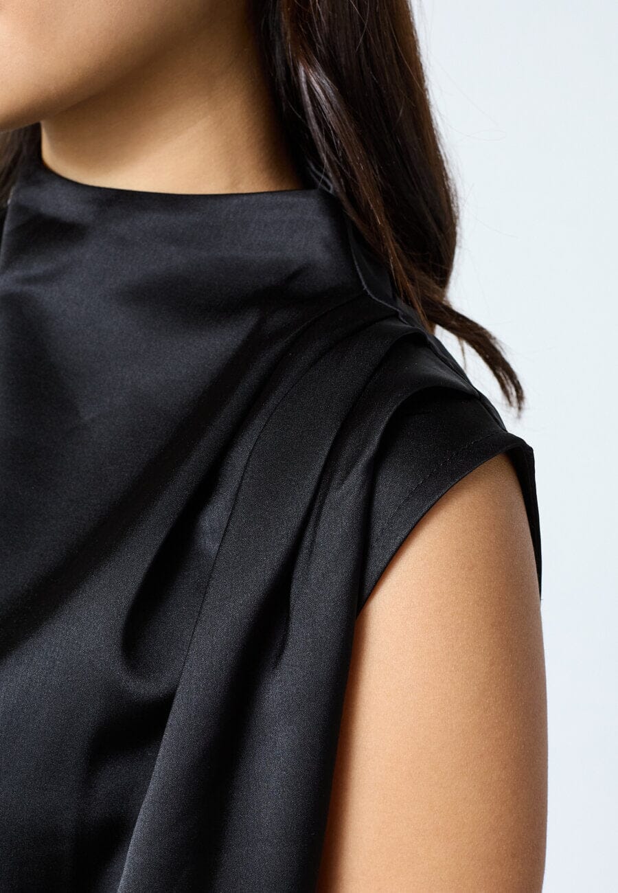 Zwarte mouwloze blouse van Sisters Point met een glanzende satijnlook. Het materiaal is 100% polyester met een glad oppervlak.