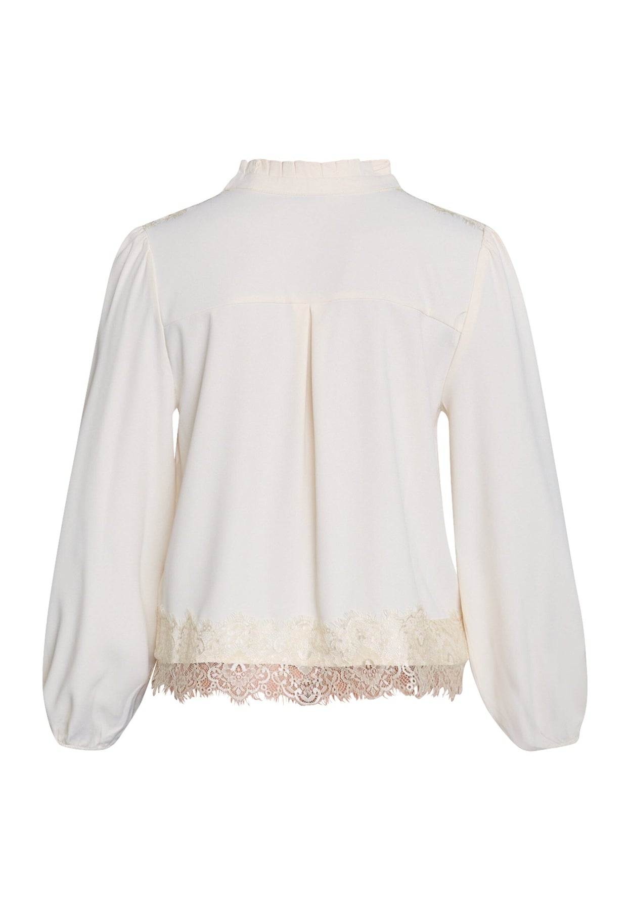 Crèmekleurige blouse van Sisters Point met kant- en ruchesdetails. De blouse is geschikt voor zowel formele gelegenheden als voor alledaags en feestelijk gebruik.
