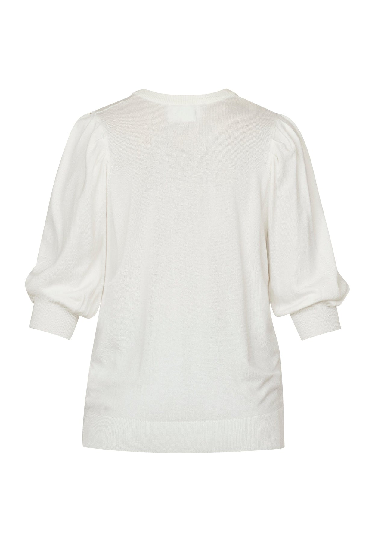 Fijn gebreide cardigan in crèmekleurige tint met ronde hals en knoopsluiting. Het heeft driekwartlange pofmouwen en ribboorden die een zachte en vrouwelijke uitstraling geven.