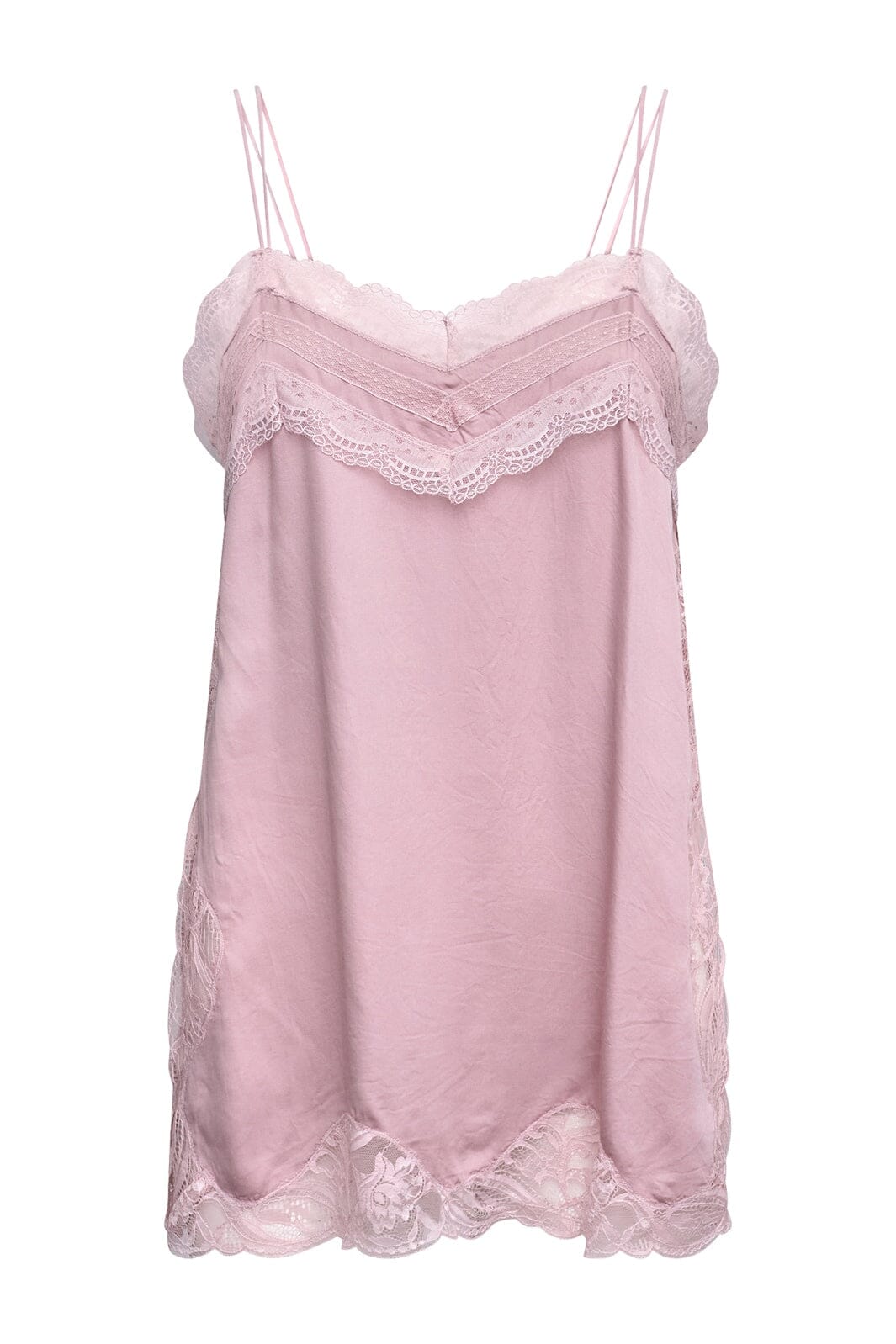 Een lila-roze top van Sisters Point, gemaakt van 100% viscose. De top heeft kanten randen bij de halslijn en langs de zoom, dunne verstelbare bandjes en een losse pasvorm.