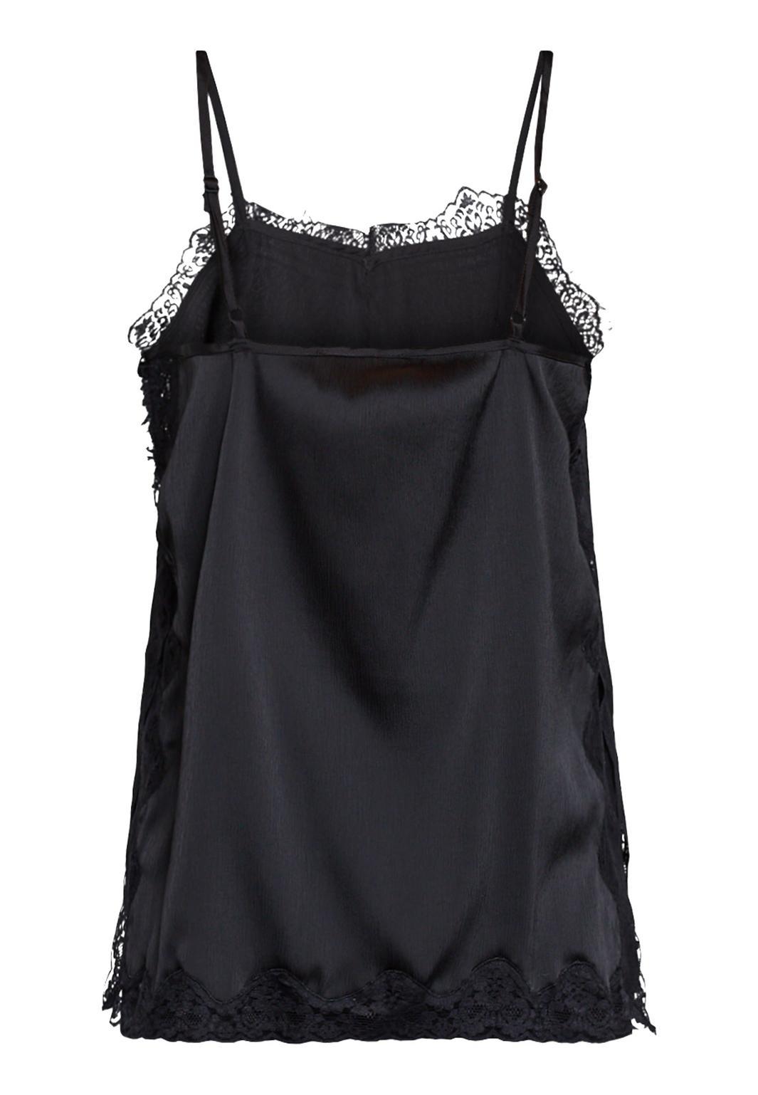 Zwarte top van Sisters Point, gemaakt van satijn met kanten randen. De top heeft dunne spaghettibandjes en een V-hals met kant.