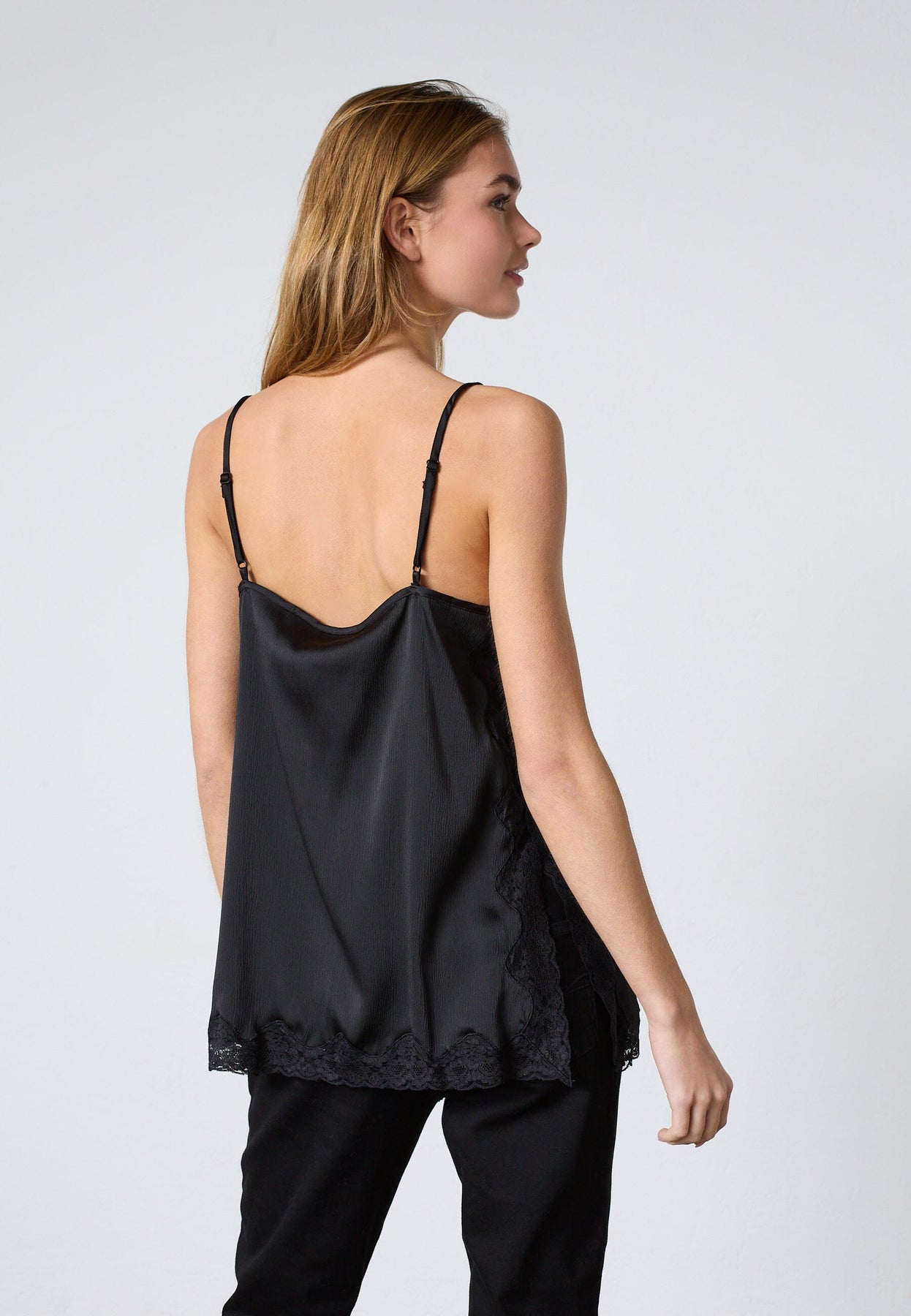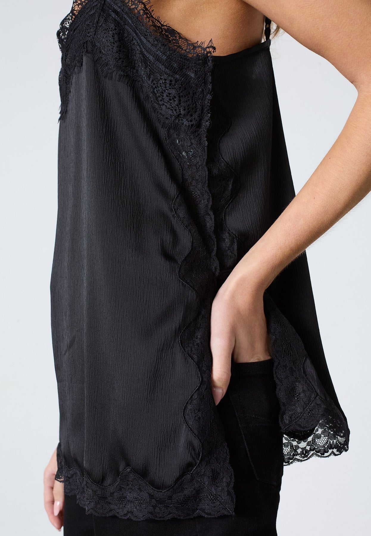Zwarte top van Sisters Point, gemaakt van satijn met kanten randen. De top heeft dunne spaghettibandjes en een V-hals met kant.