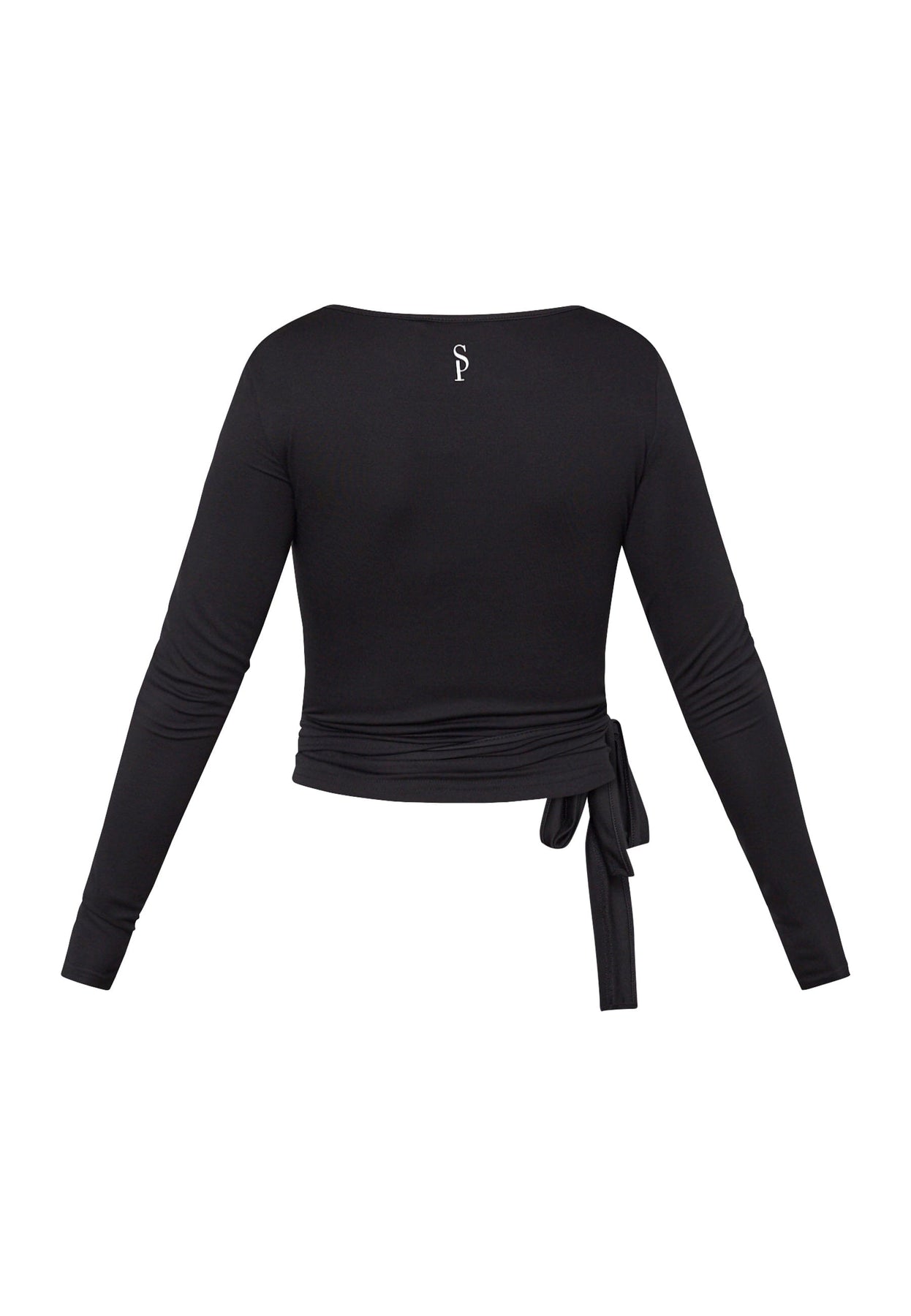 Zwarte wikkelblouse van Sisters Point in een overslagsnit met V-hals. Geschikt voor zowel casual, feestelijke gelegenheden als thuisgebruik.