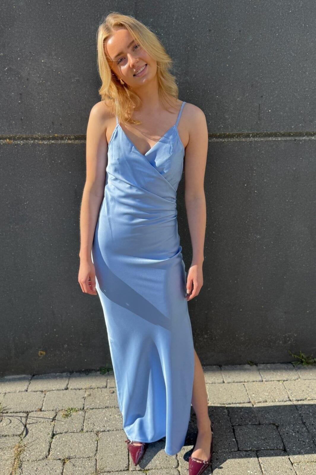 Lange jurk van Sisters Point in lichtblauw. De jurk heeft een aansluitende pasvorm met V-hals en dunne bandjes. De vrouwelijke silhouet wordt benadrukt door een split aan de zijkant.