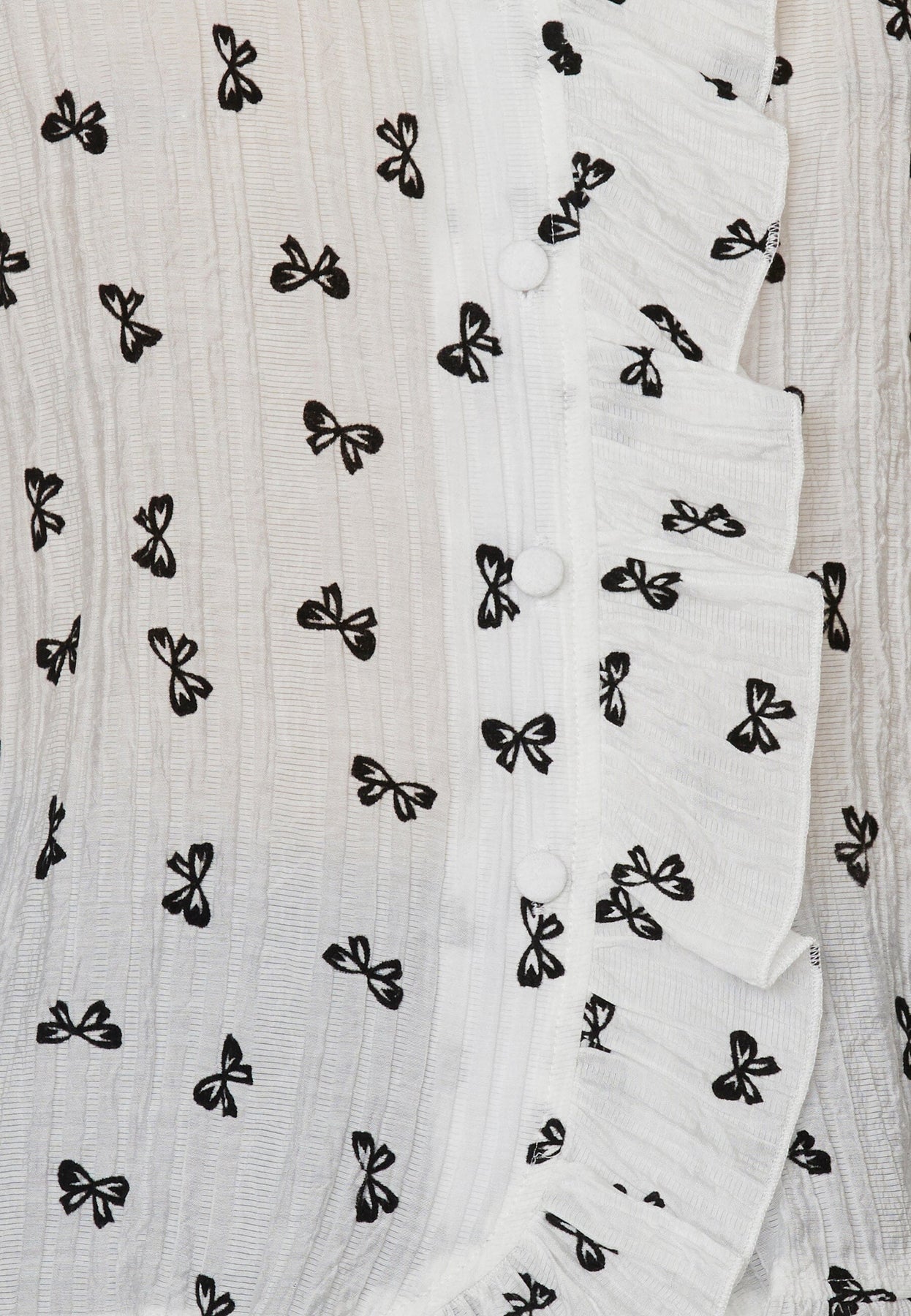 is een witte vrouwelijke blouse met een zwart all-over strikjesprint. De blouse heeft een ronde hals, korte mouwen en ruches langs de knoopsluiting en aan de onderkant.