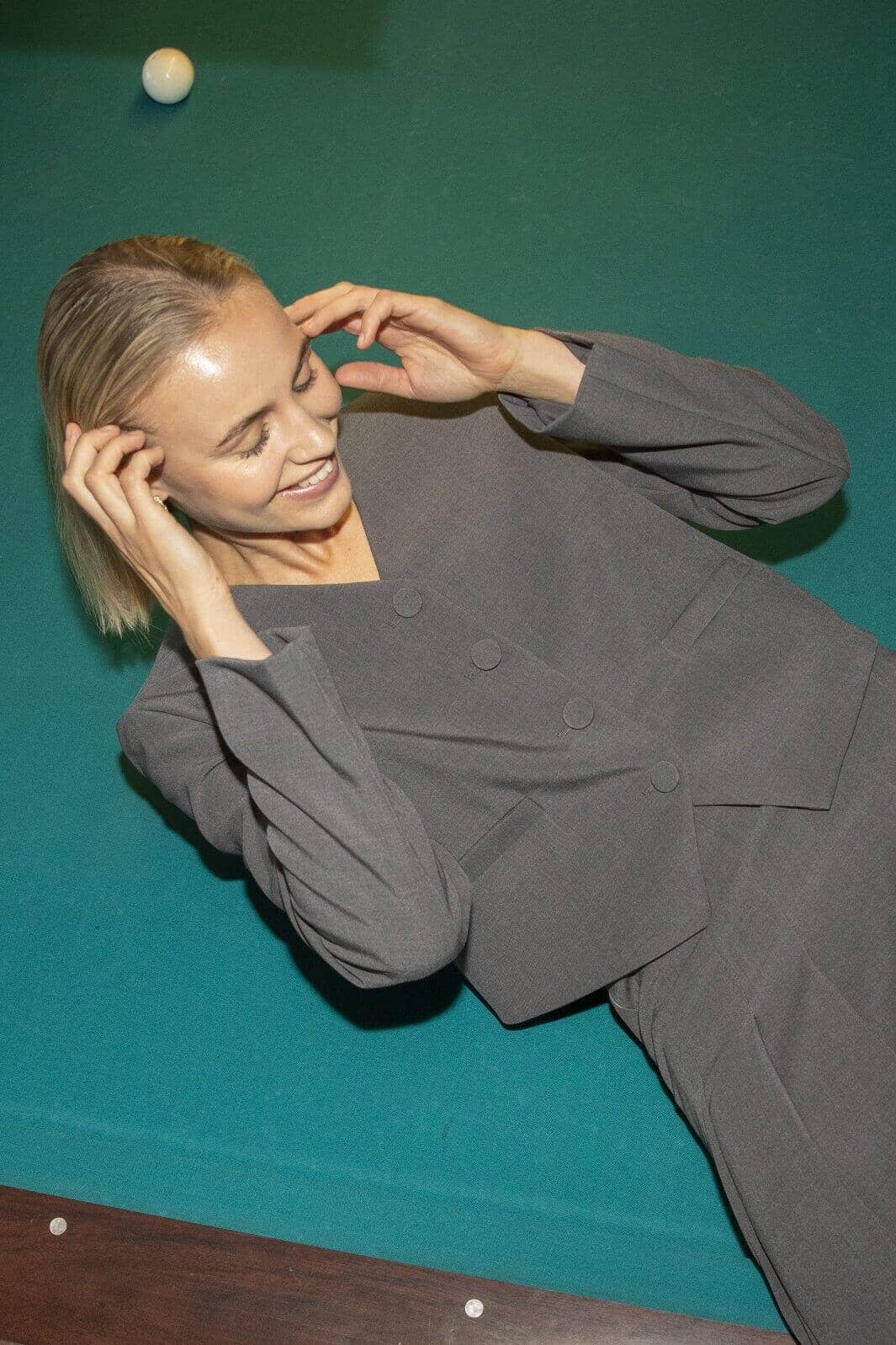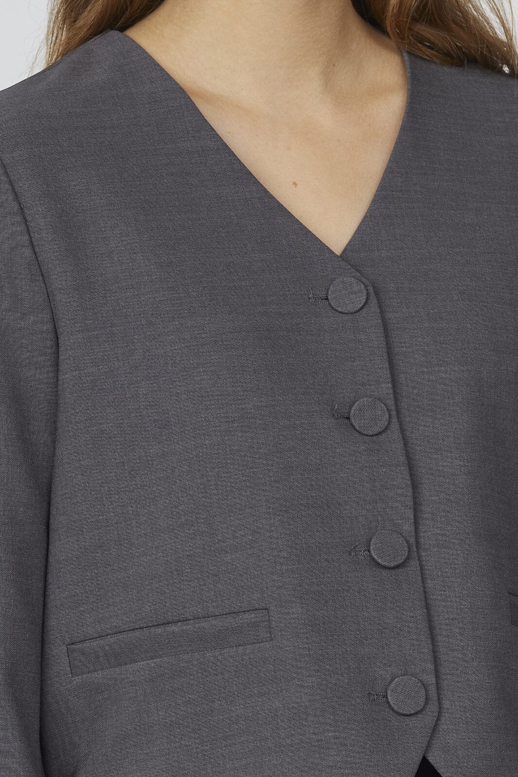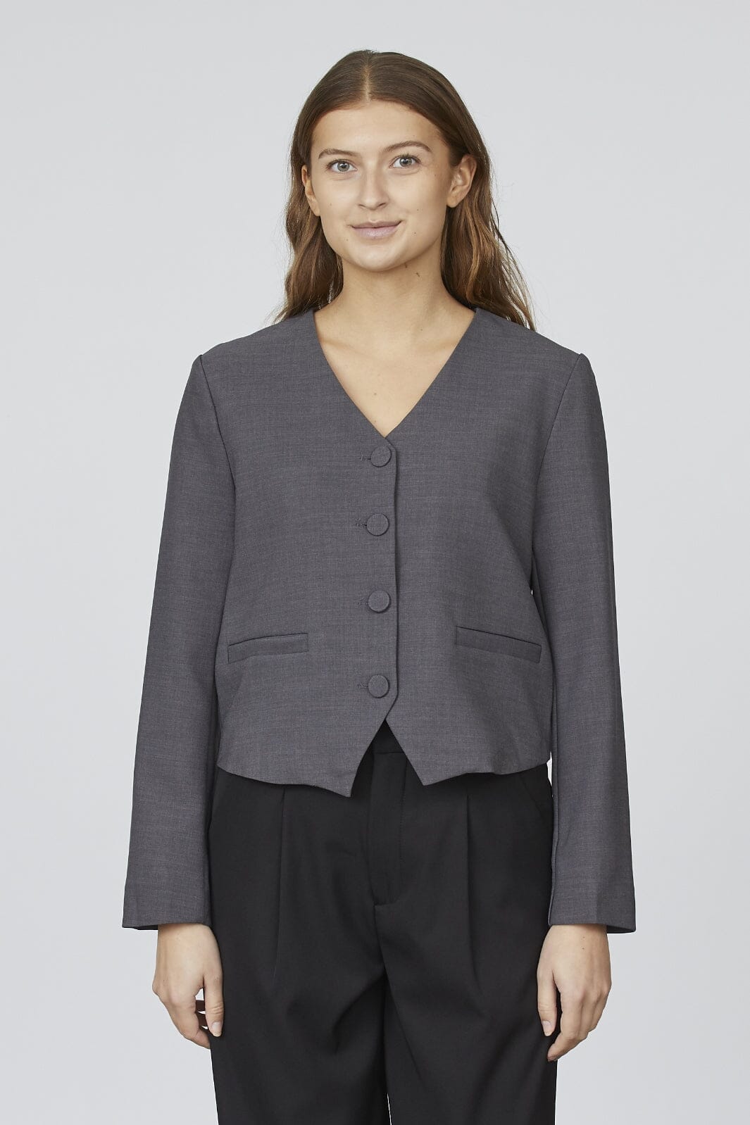 Grijze blazer van Sisters Point met v-hals en vier knopen. De blazer heeft lange mouwen en een klassieke snit die geschikt is voor zowel zakelijke als formele gelegenheden.