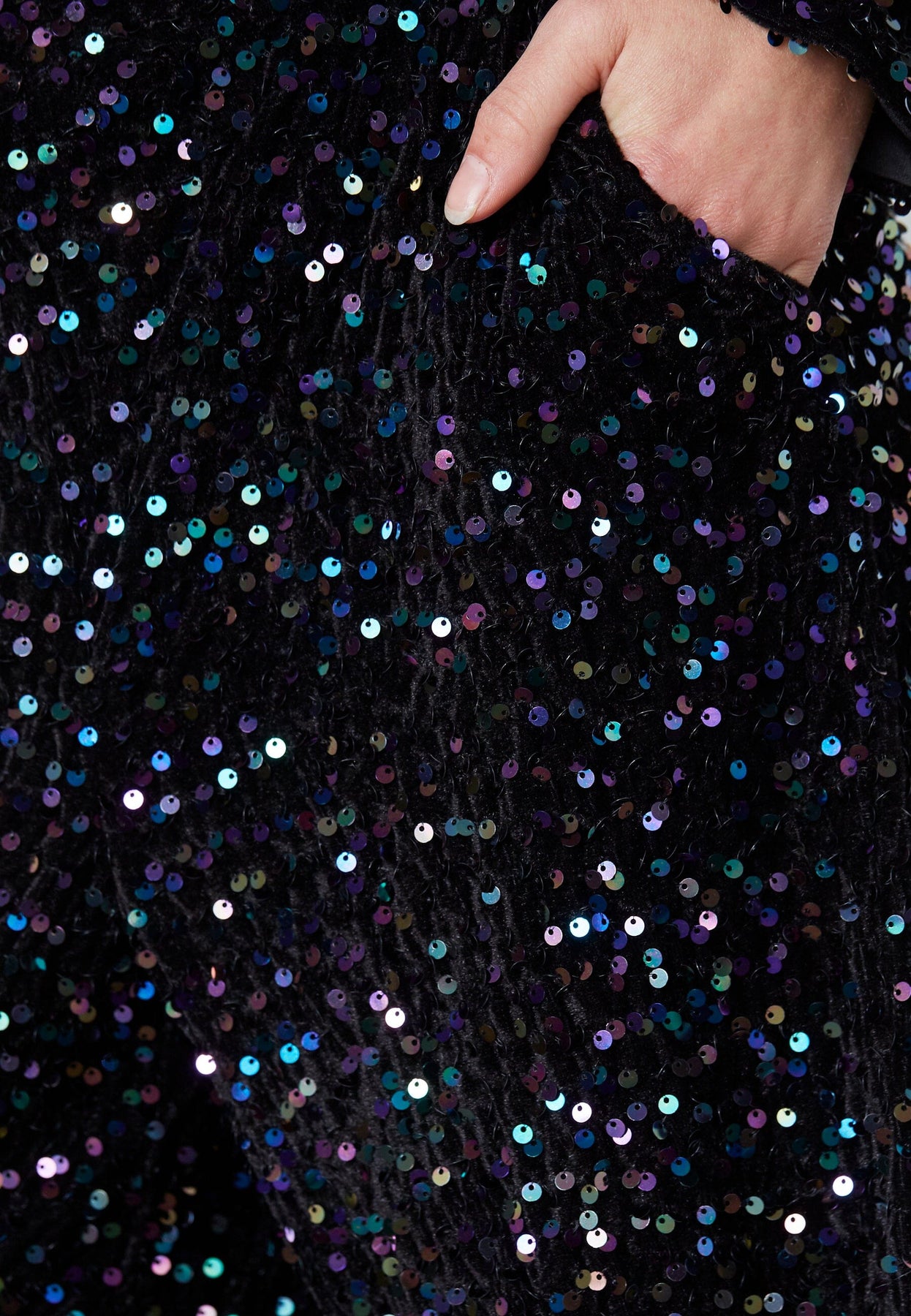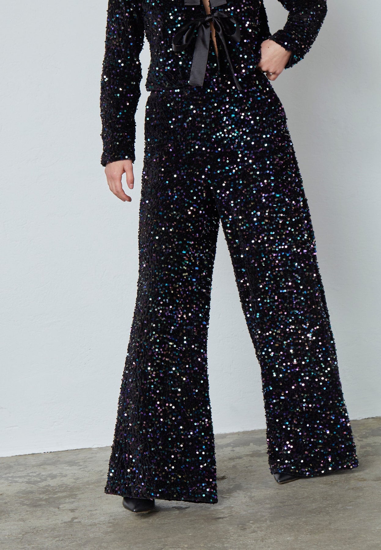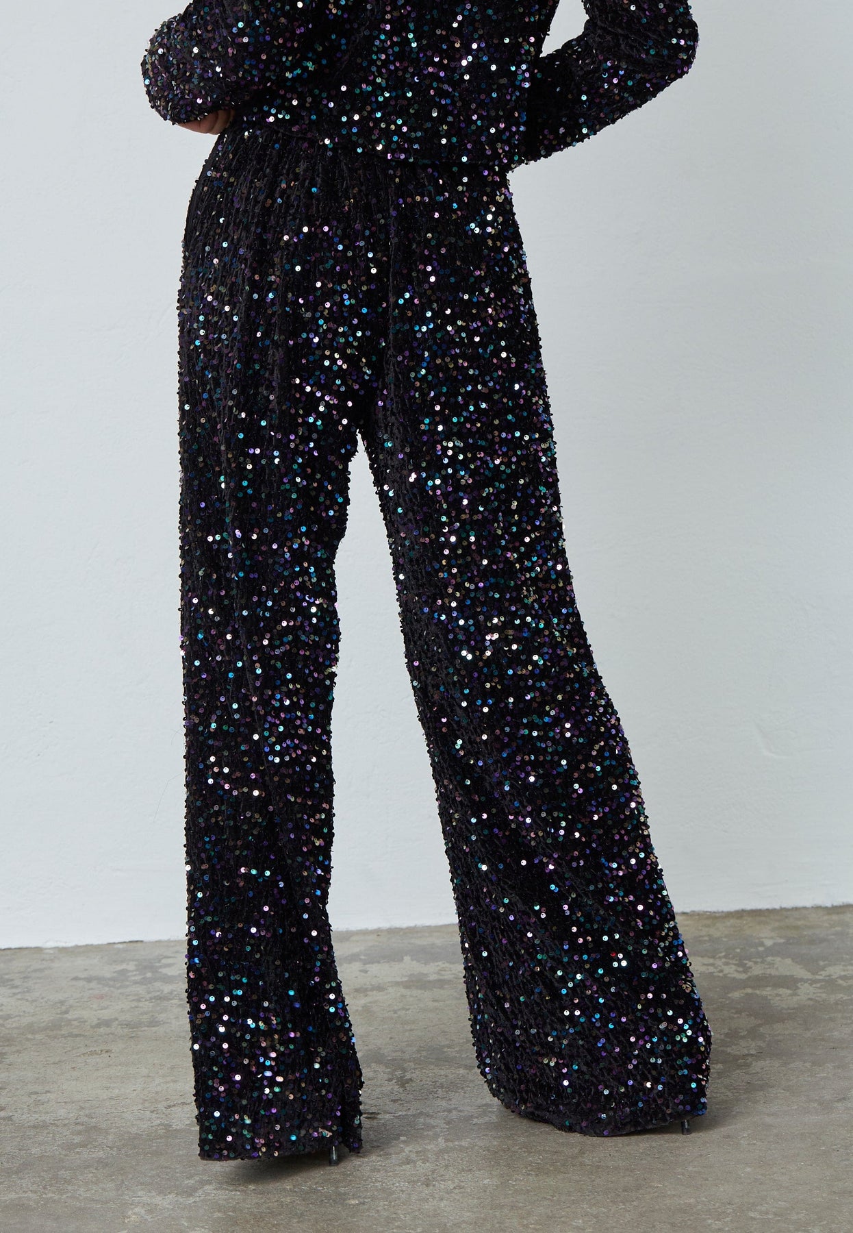 Zwarte broek van Sisters Point met een losse pasvorm en wijde pijpen. De broek is bedekt met veelkleurige pailletten, wat een feestelijke uitstraling geeft. De elastiek in de taille zorgt voor een goede pasvorm.