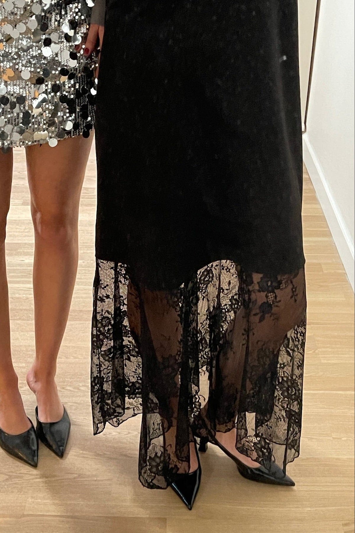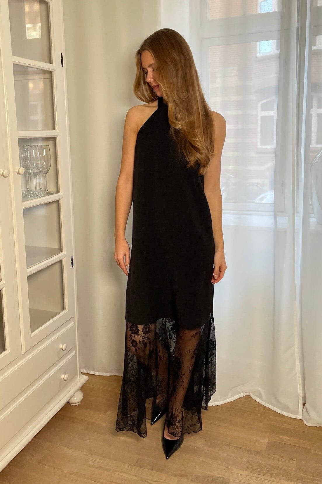 Zwarte enkellange jurk van Sisters Point met een hoge halslijn. De mouwloze jurk heeft kant aan de onderkant en een losse pasvorm, waardoor hij geschikt is voor feestelijke gelegenheden.