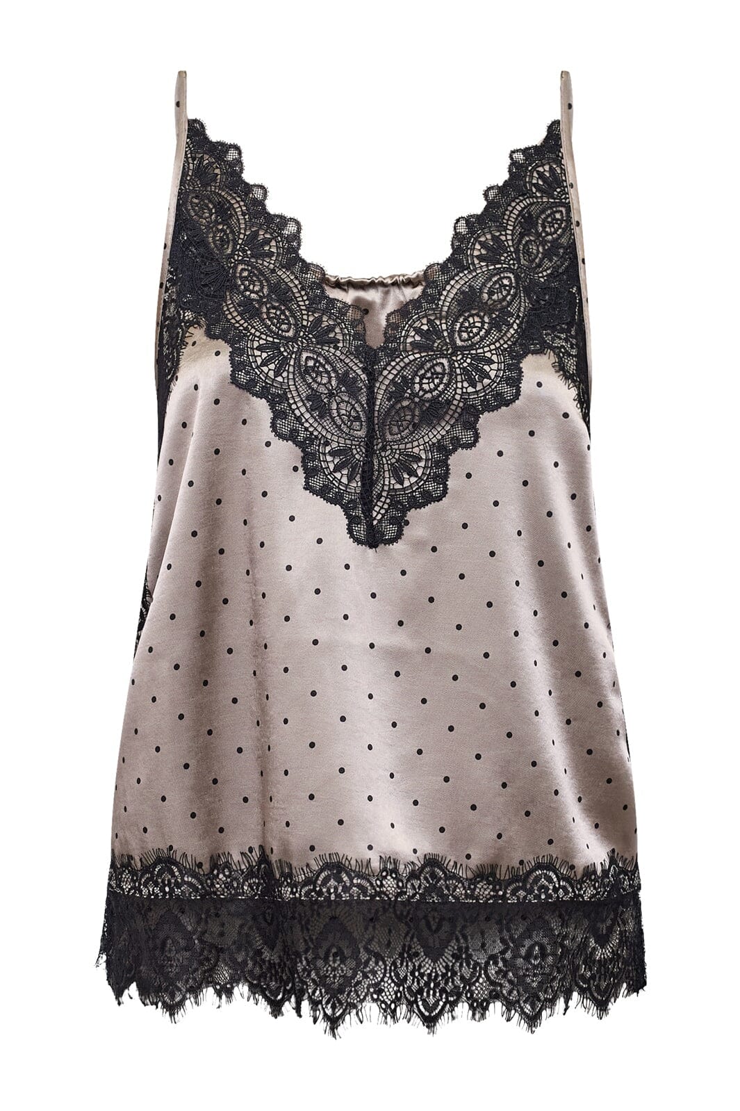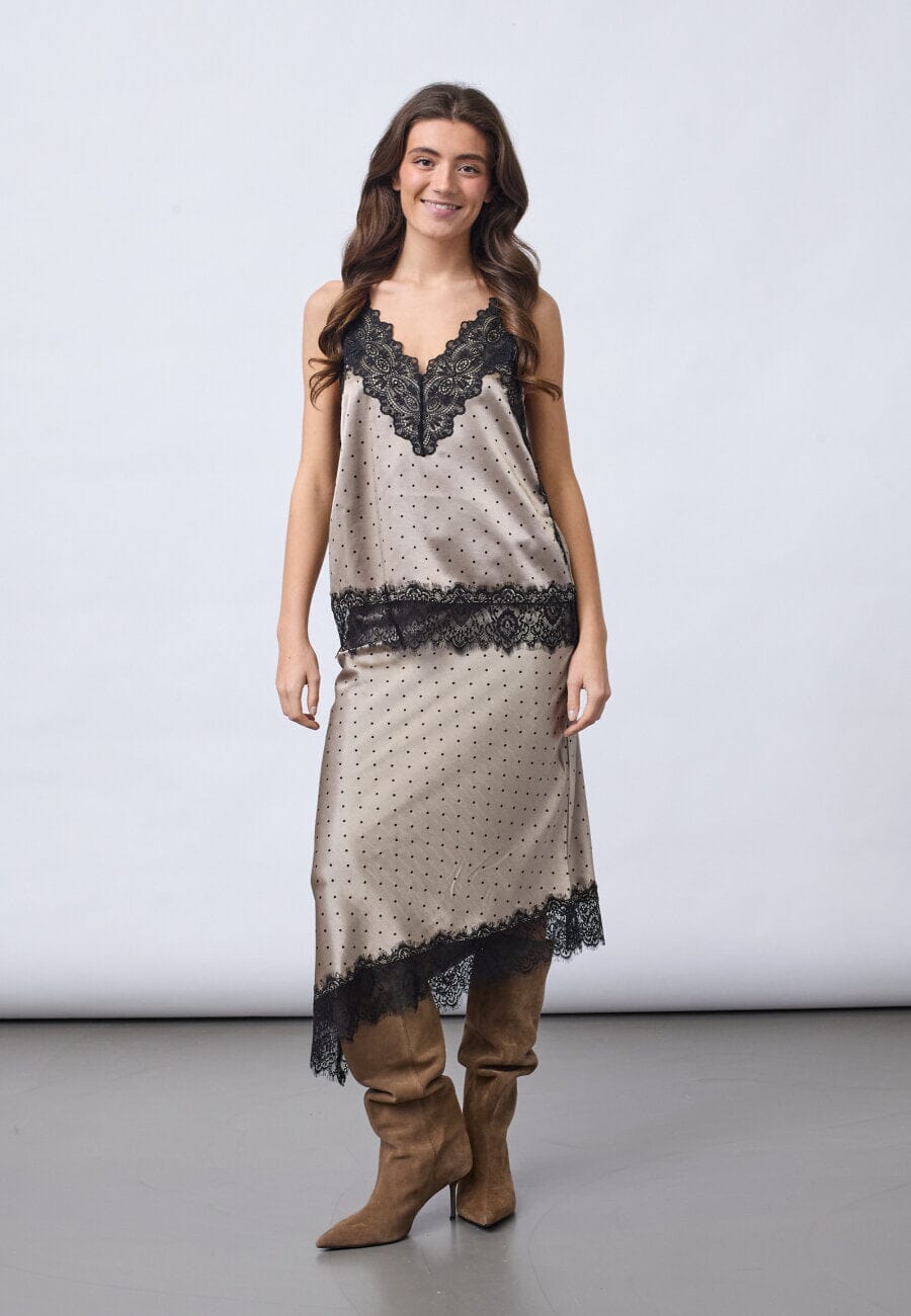 Top van Sisters Point in beige met zwarte polkadots. De top heeft dunne bandjes en kanten randen bij de V-hals en aan de onderkant.