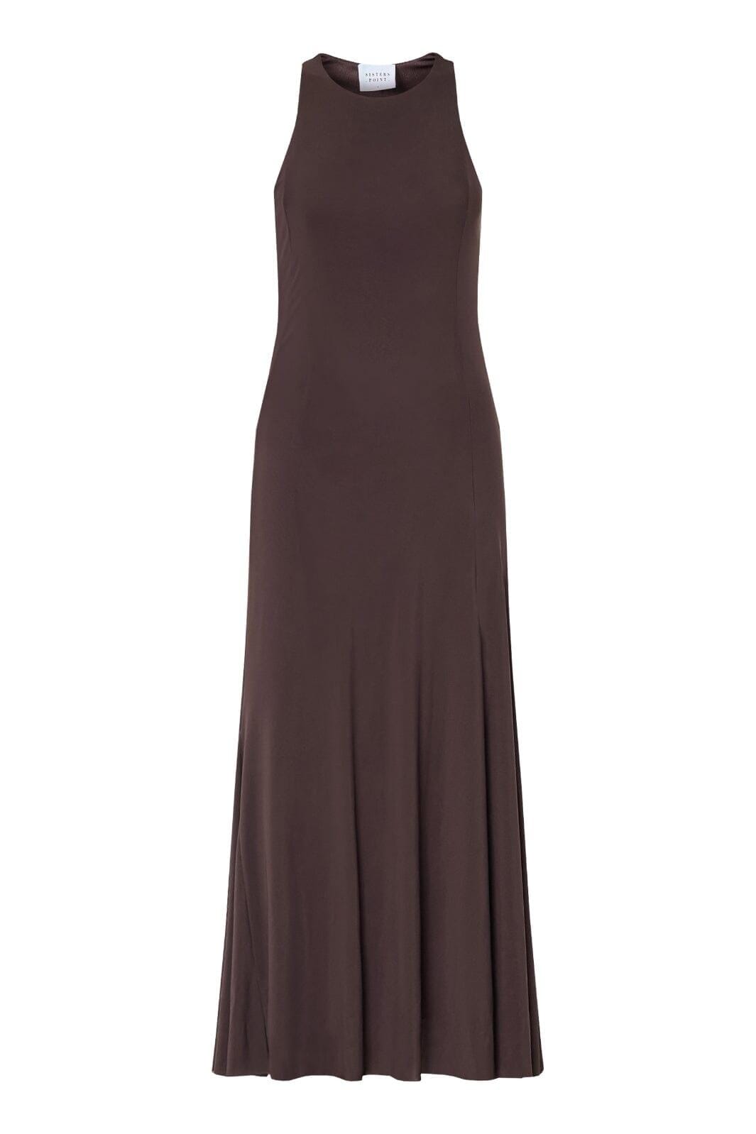 Lange bruine jurk van Sisters Point zonder mouwen. De jurk heeft een hoge halslijn en een losse pasvorm aan de onderkant met een split aan de zijkant.