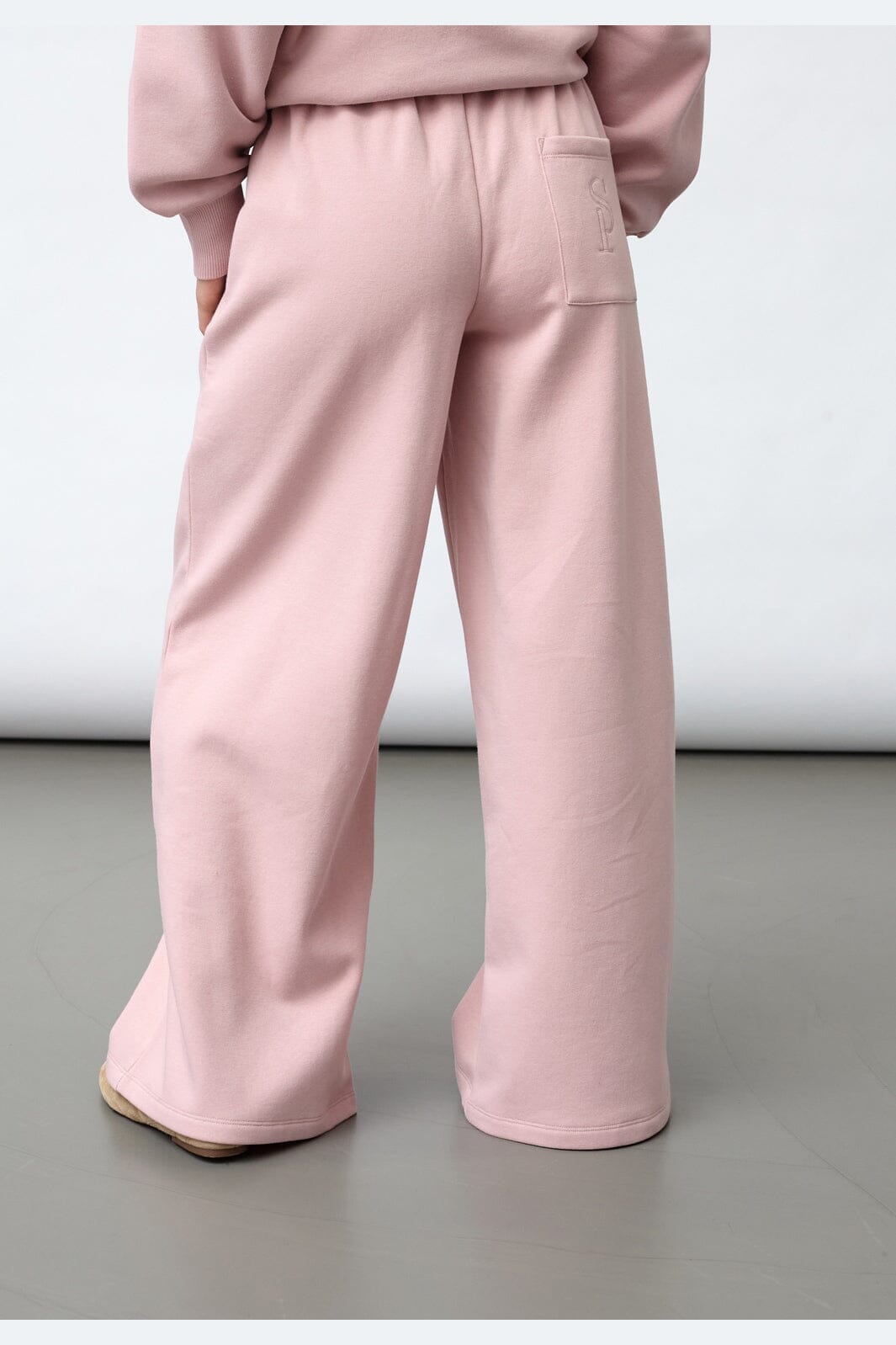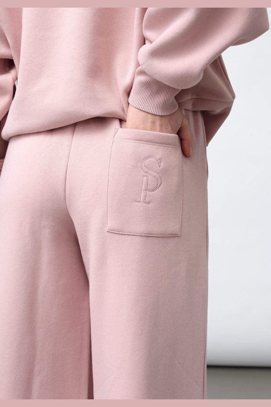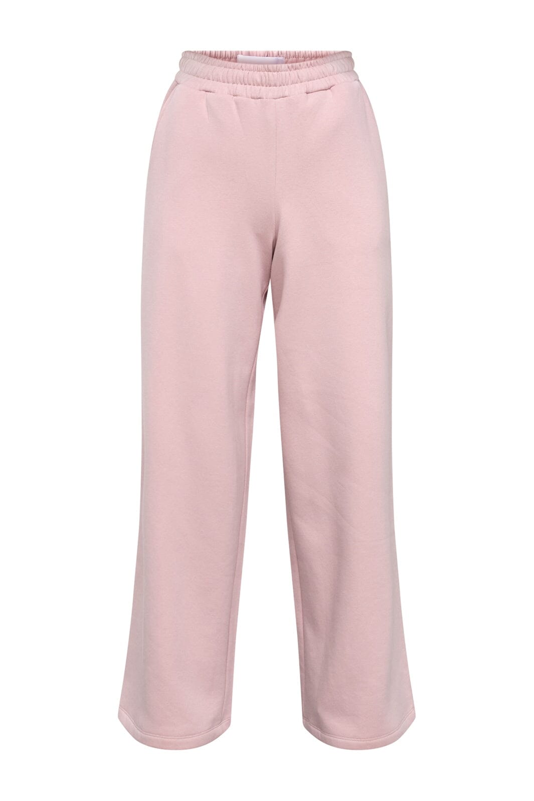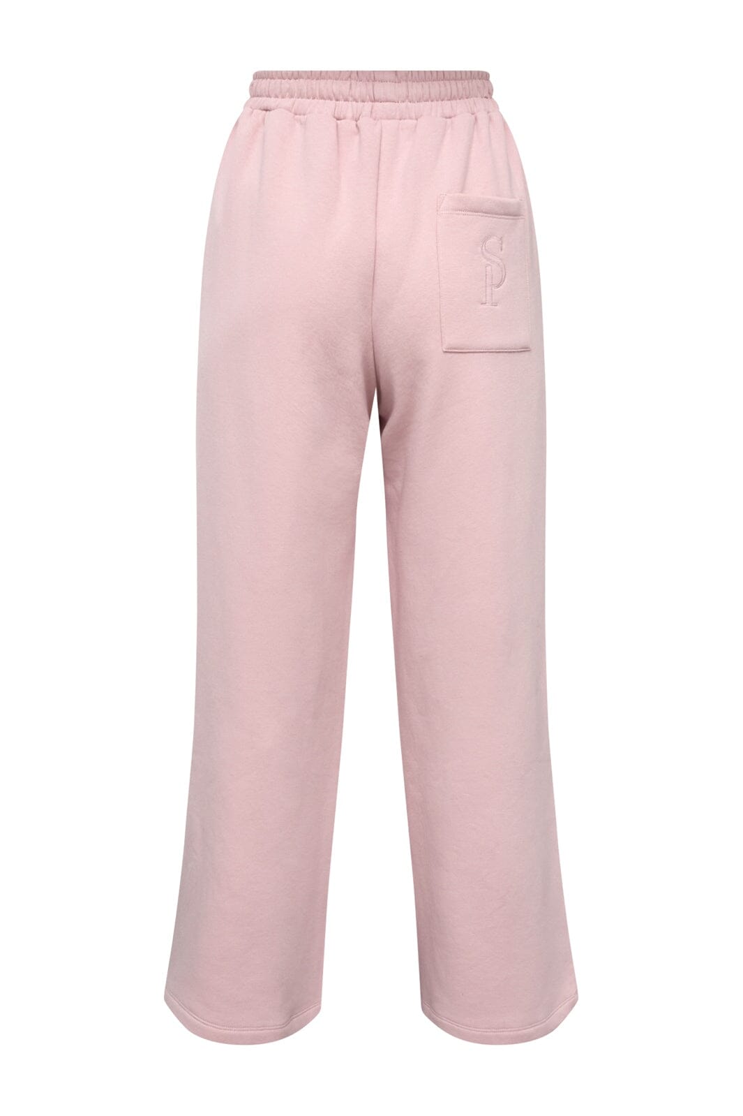 Lila-roze broek van Sisters Point met een hoge taille en een geborduurd SP-logo op de achterzak. De broek heeft een wijd pijpontwerp en een losse pasvorm.