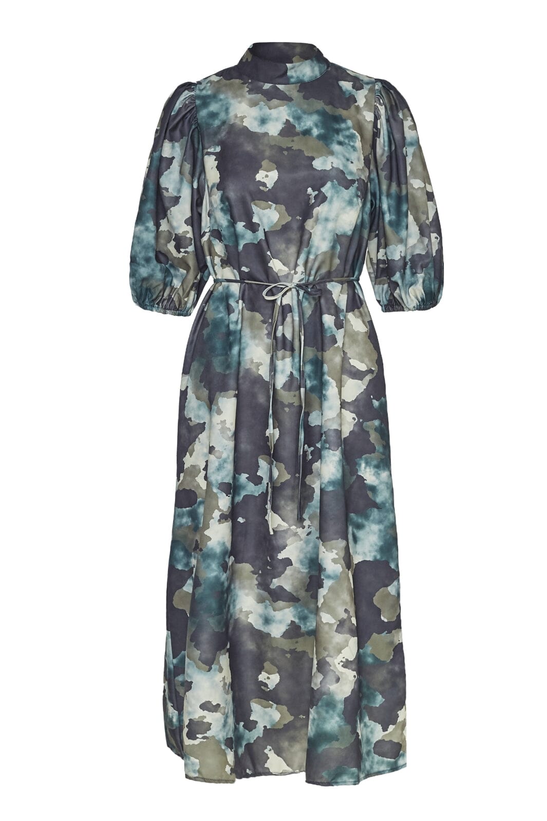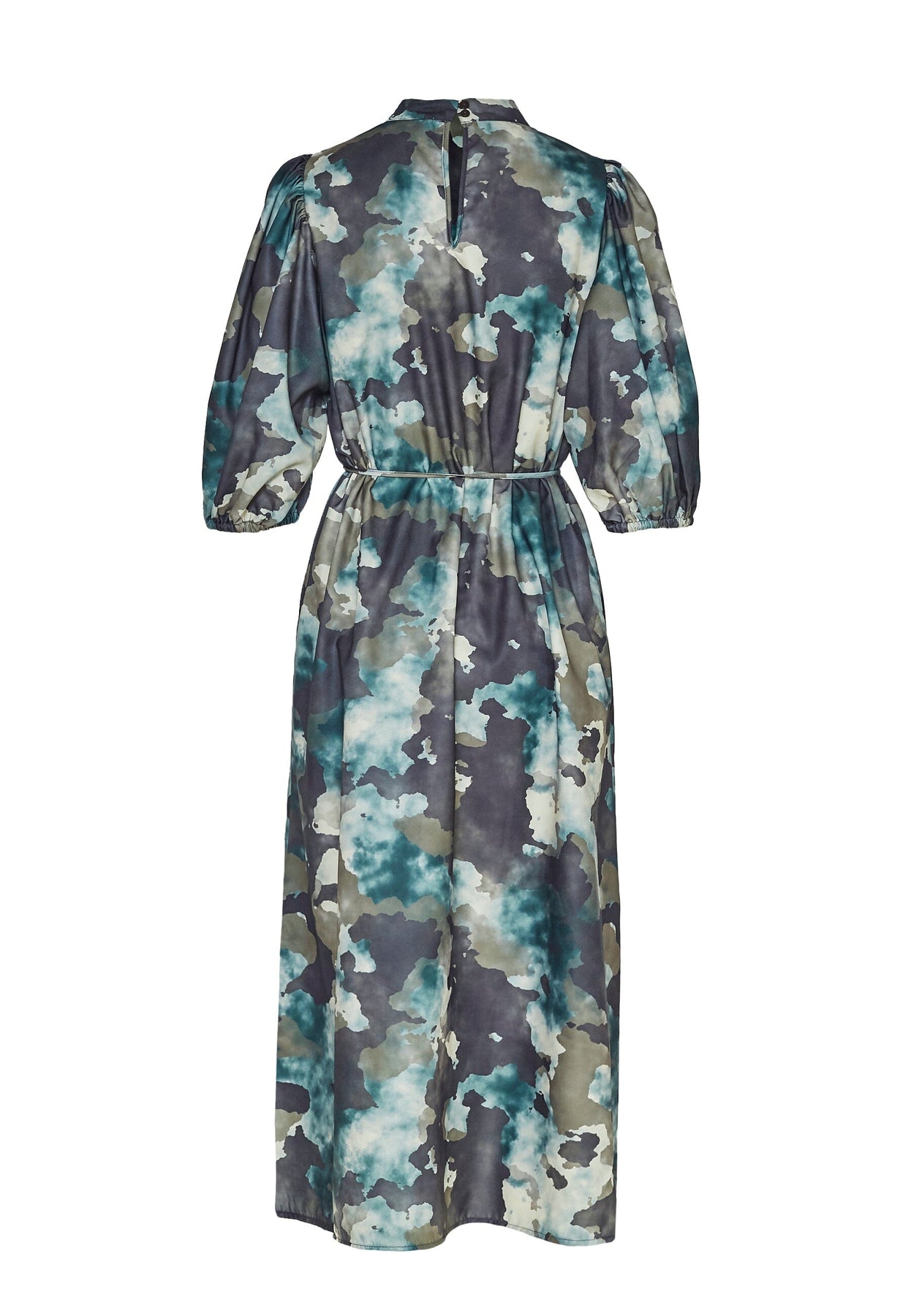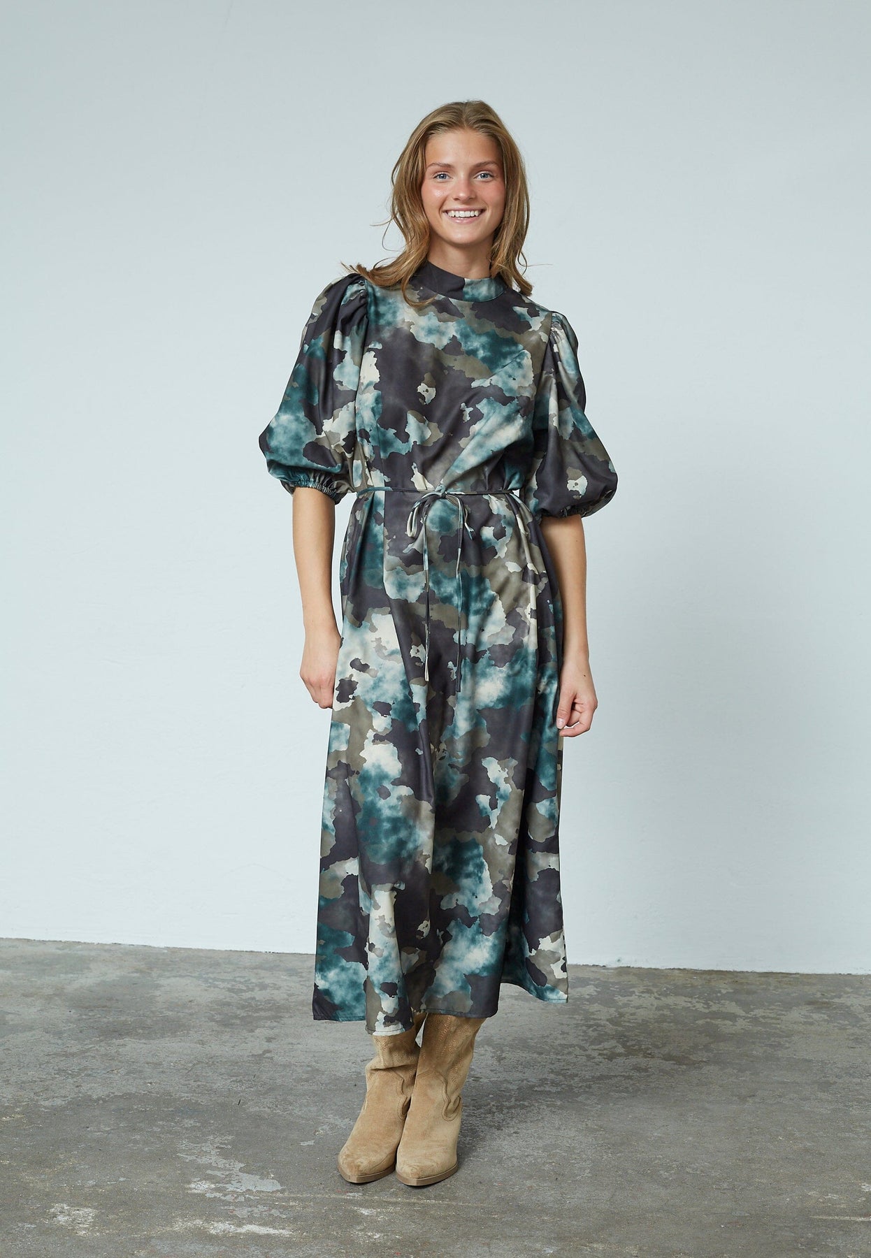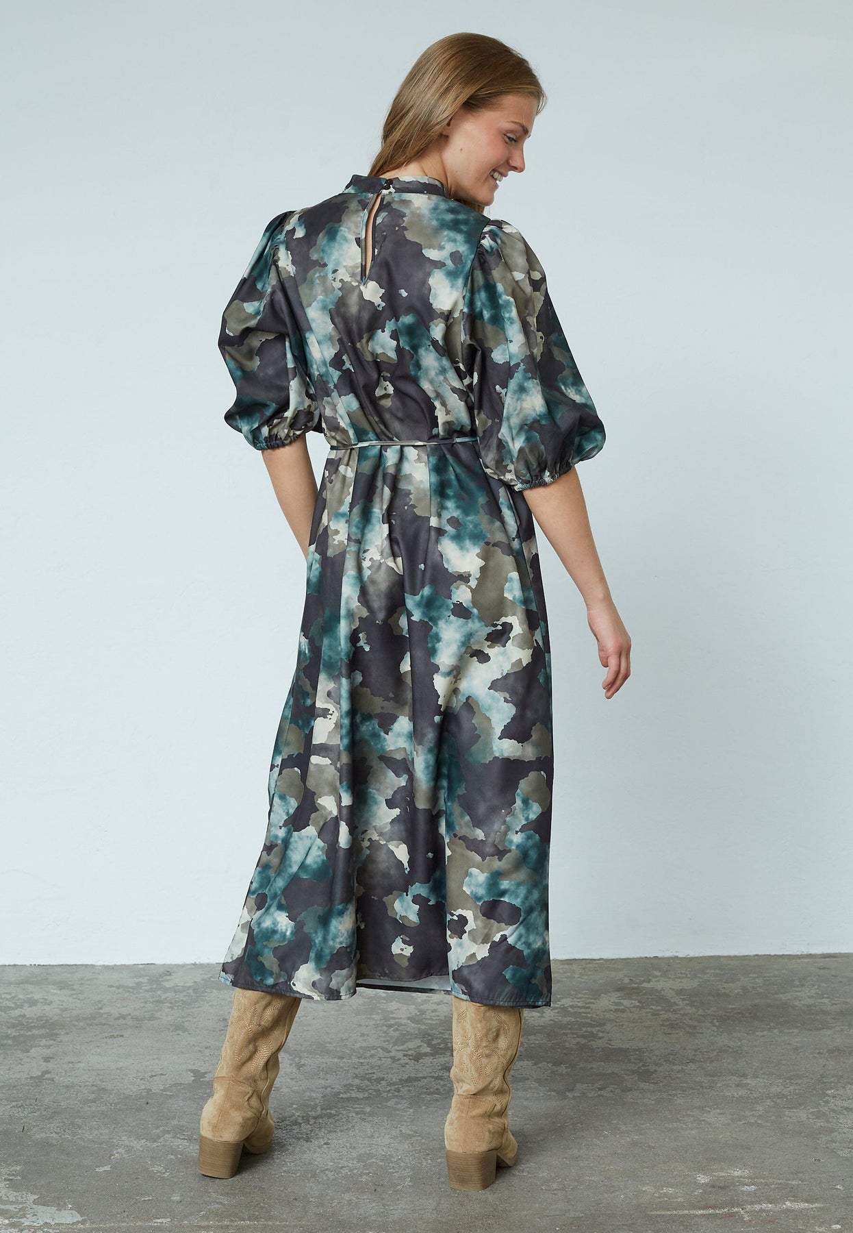 Jurk van Sisters Point met camouflagemotief in blauwe, grijze en beige tinten. De jurk heeft een hoge hals met pofmouwen en een strikceintuur in de taille.