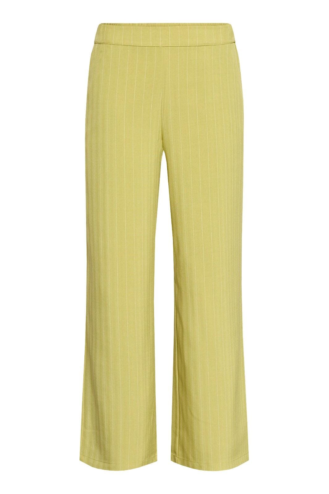 Limoenkleurige pantalon van Sisters Point met dunne strepen in een verticaal pinstripe-patroon. De broek heeft wijde, rechte pijpen en een hoge taille met elastische band.