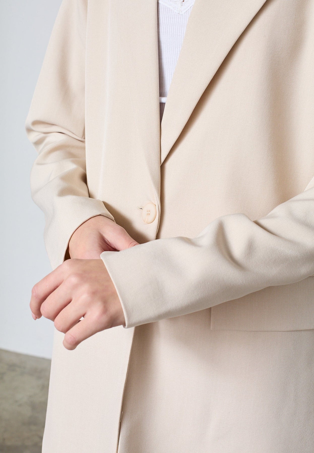 Lichte blazer van Sisters Point in de kleur Fog, een neutrale beige tint. De blazer heeft een reverskraag, knoopsluiting aan de voorkant en twee zakken.