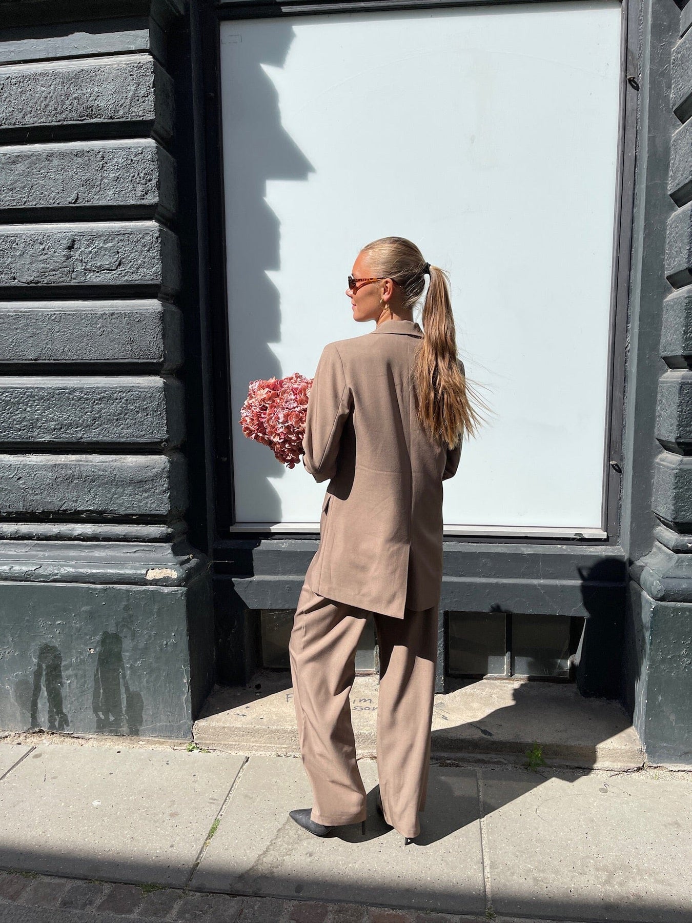 Zandkleurige blazer van Sisters Point met reverskraag en enkelrijige knoopsluiting. De blazer heeft twee zakken aan de voorkant en drie sierknopen op de mouwen.