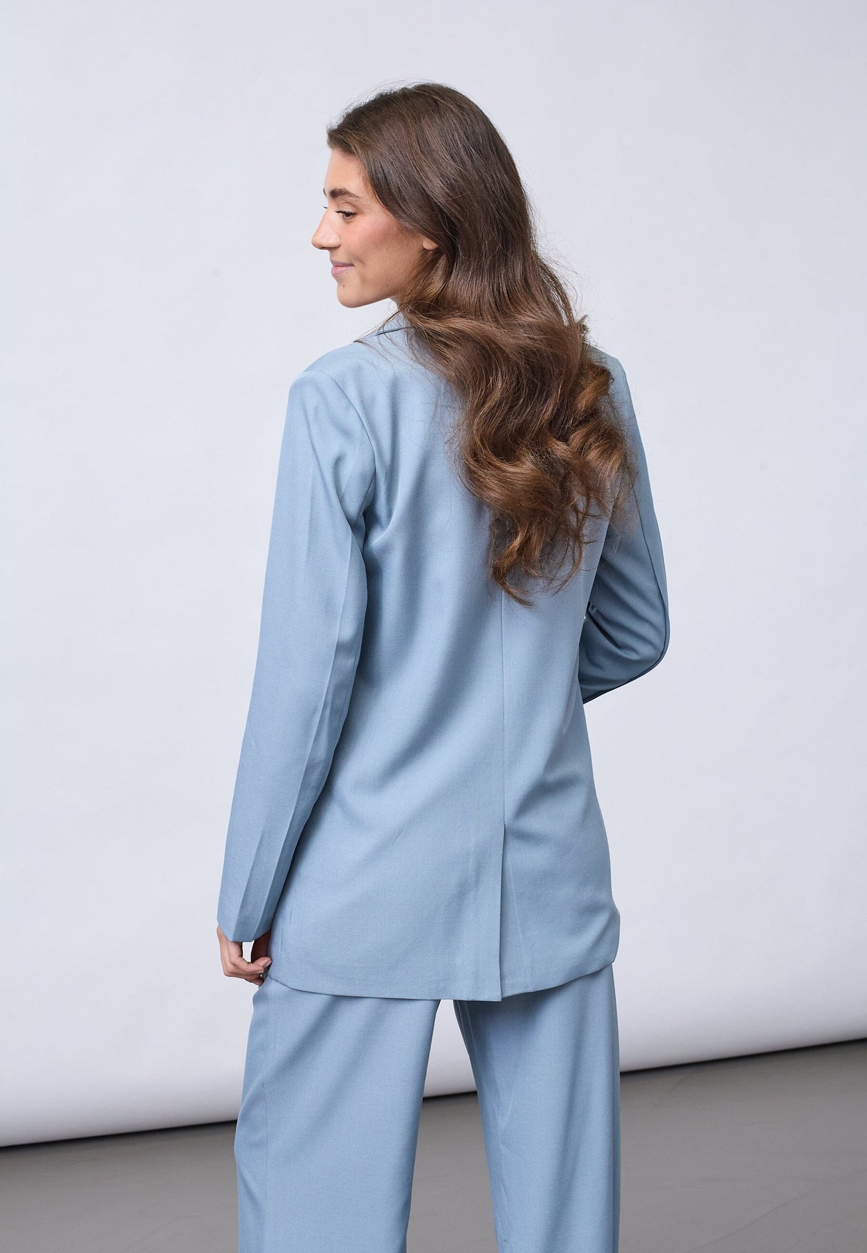 Lichtblau colbert van Sisters Point met klassieke reverskraag en knoopsluiting aan de voorkant. De blazer heeft twee zakken aan de voorkant en drie sierknopen op elke mouw.