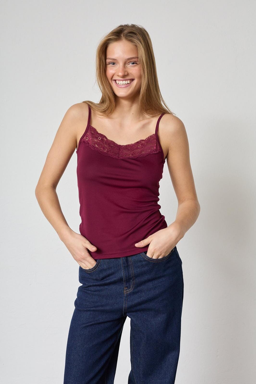 Top van Sisters Point in diep bordeauxrood met kantdetails bij de halslijn. De top heeft verstelbare spaghettibandjes en een aangesloten pasvorm.