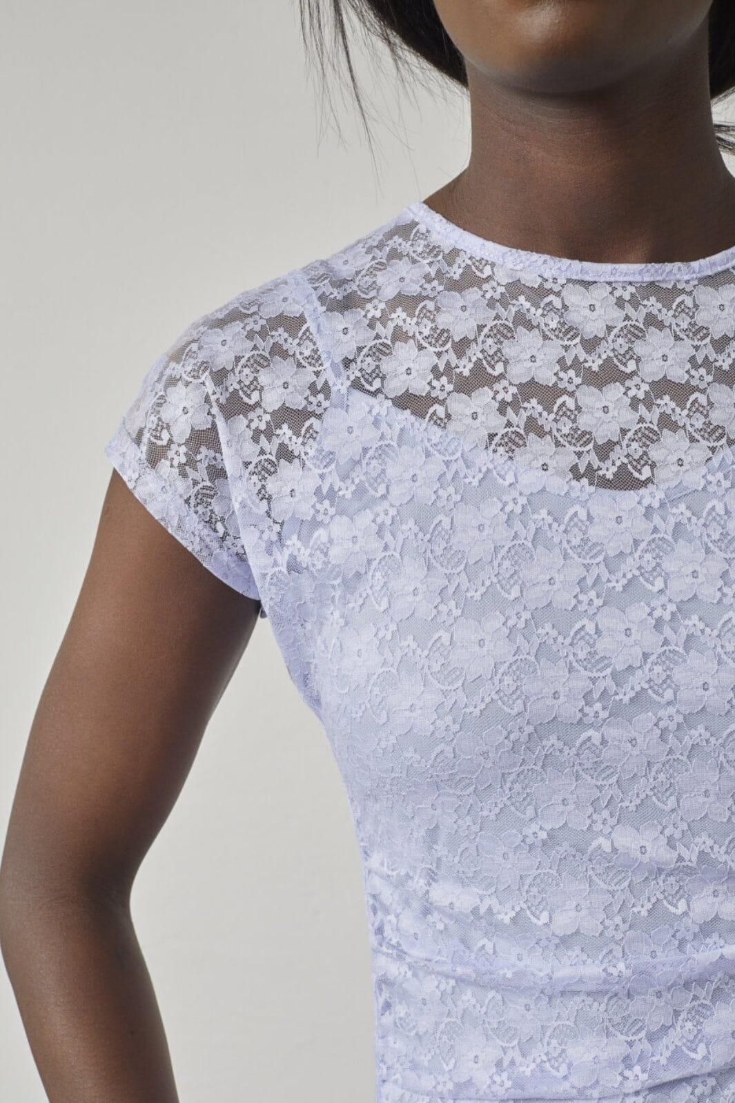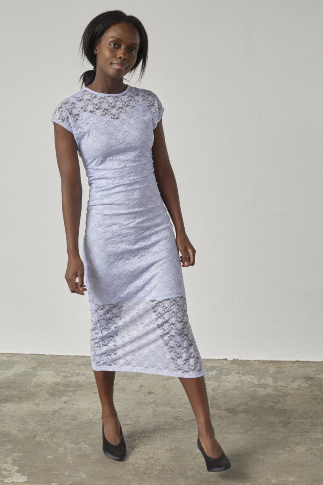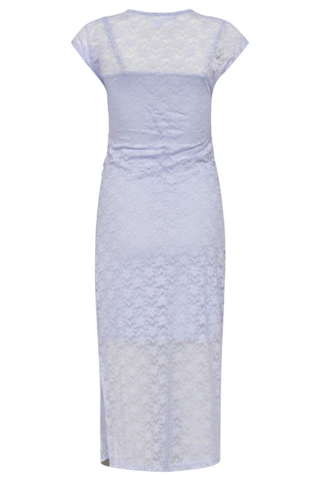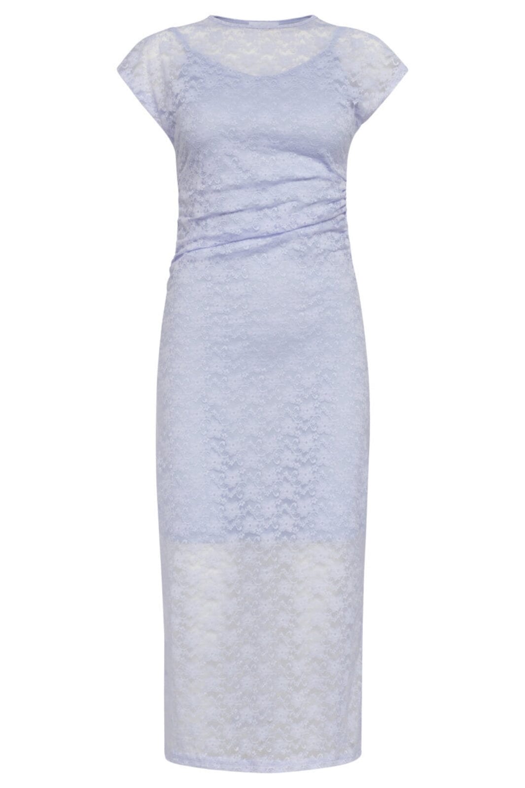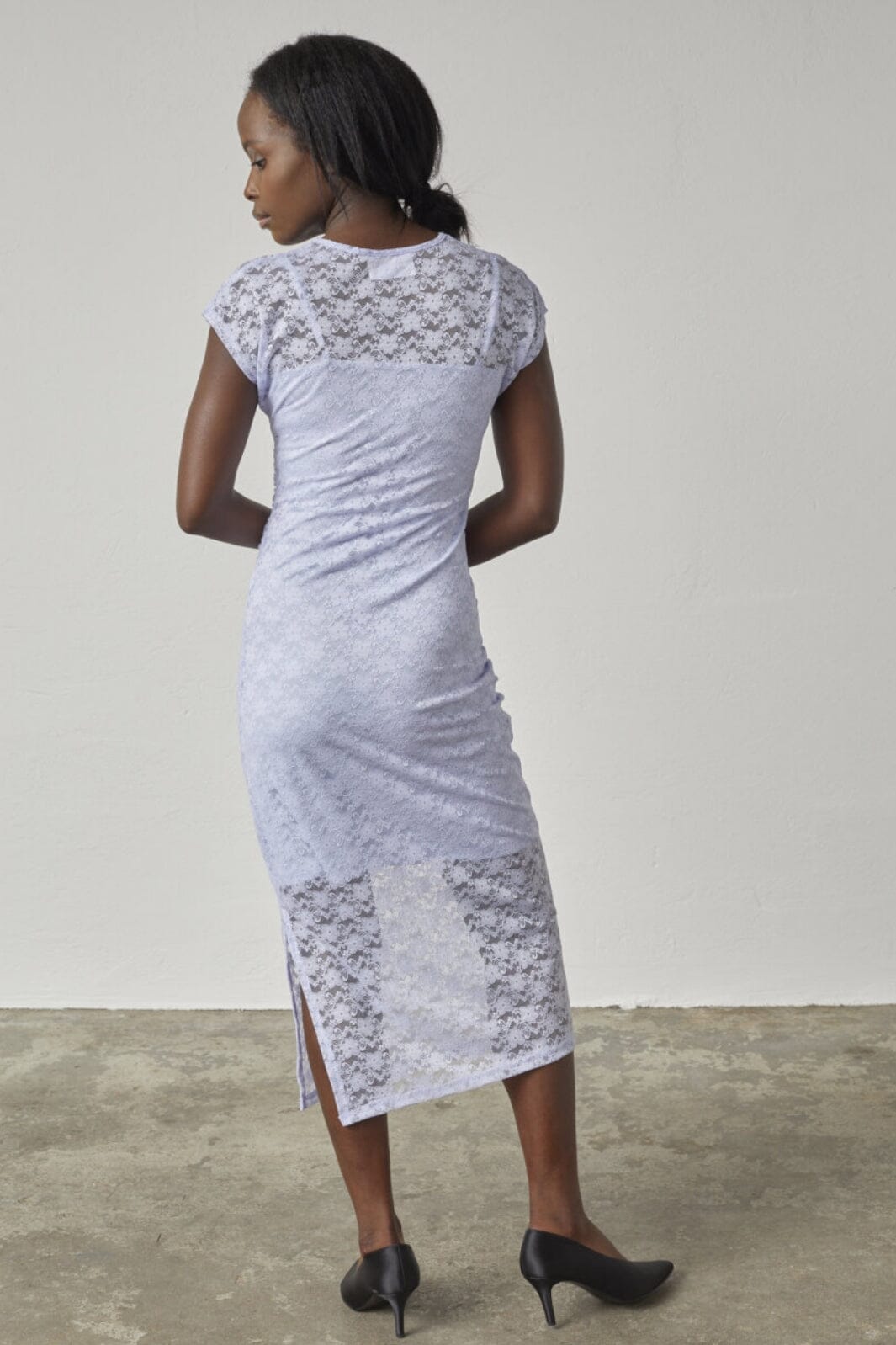 Blonde jurk van Sisters Point in een lichte lavendelkleur. De jurk heeft een ronde halslijn en korte mouwen met doorzichtige kanten panelen. Een onderjurk is inbegrepen.