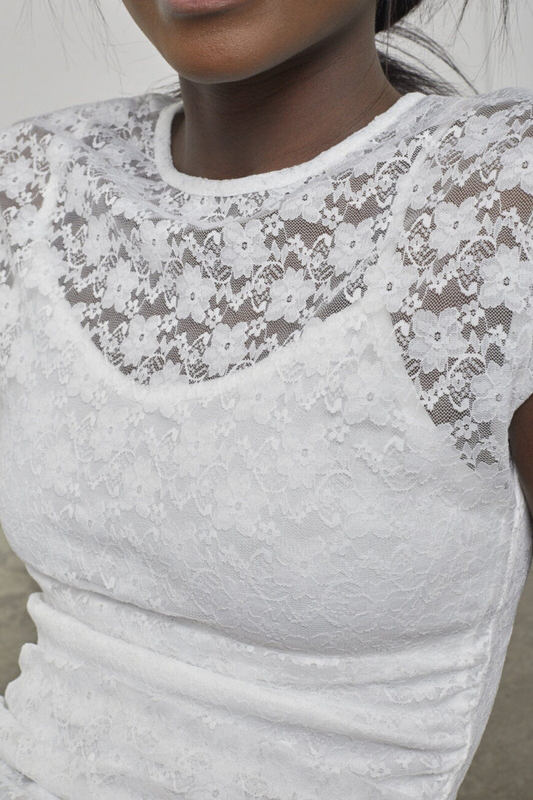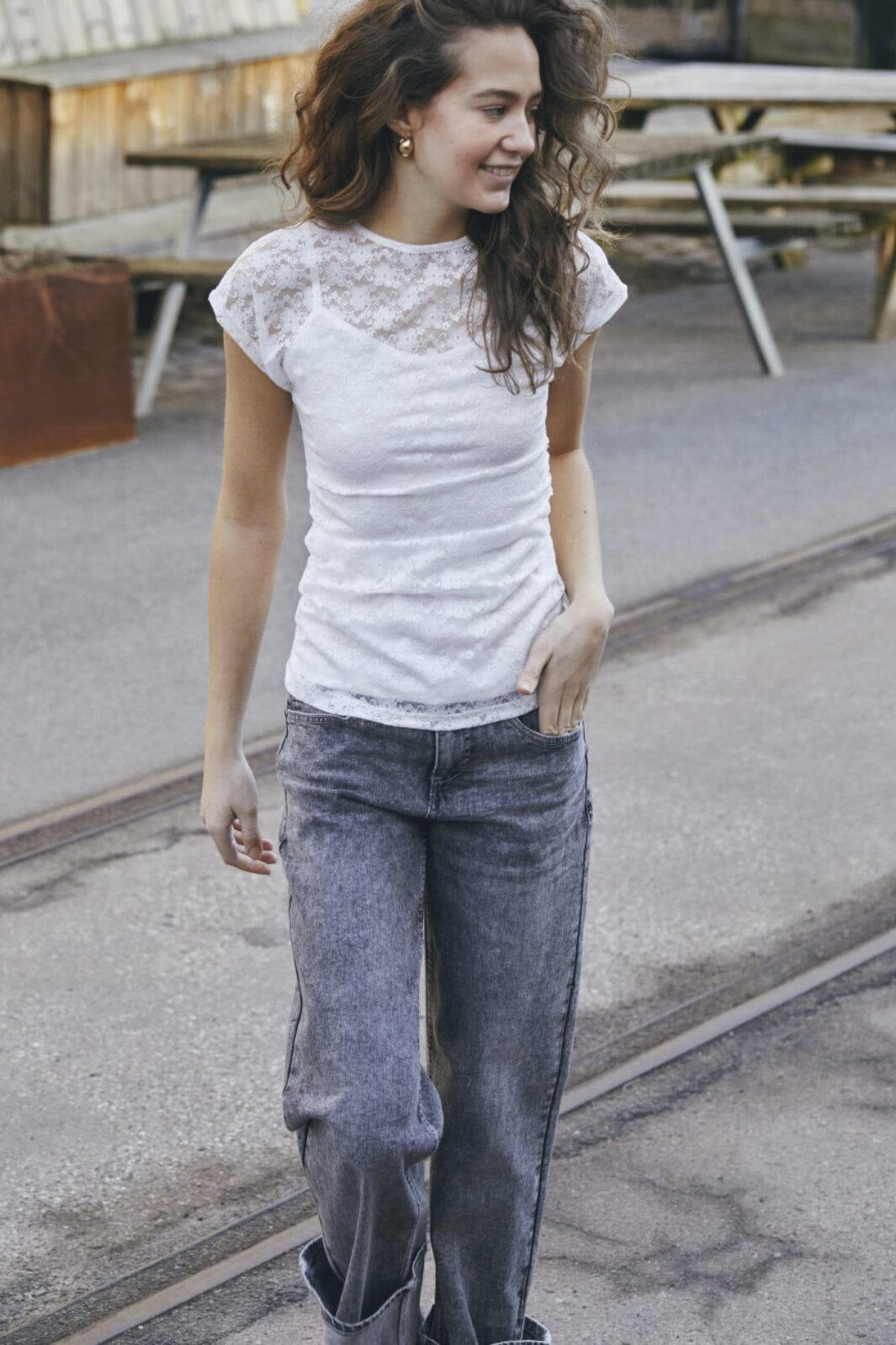 Crème kleurige top van Sisters Point met kantoverlag. De top heeft een ronde halslijn, korte mouwen en een ondertop onder het kant.