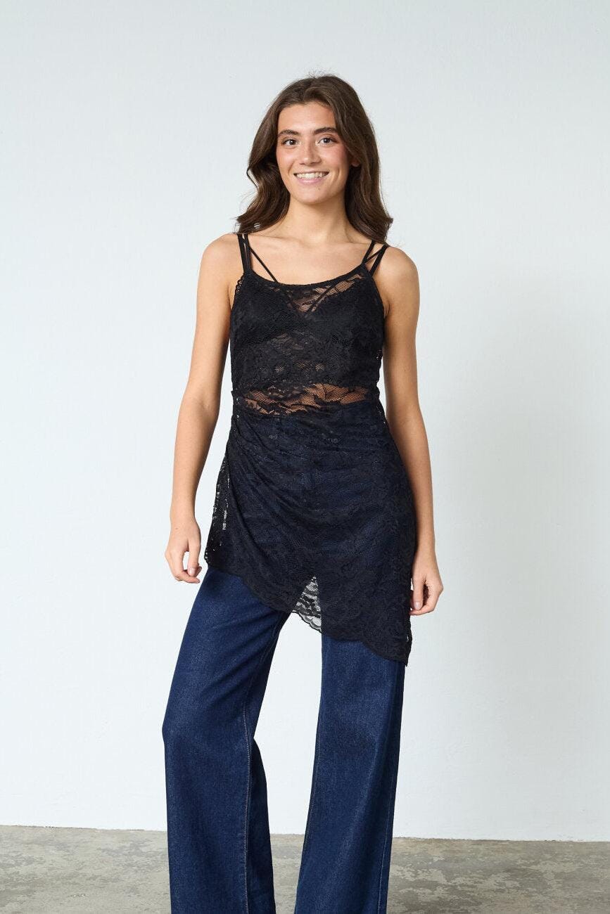 Zwarte kanten jurk van Sisters Point met bloemenpatroon. De jurk is doorschijnend en geschikt voor zowel relaxte dagen als feestelijke gelegenheden.