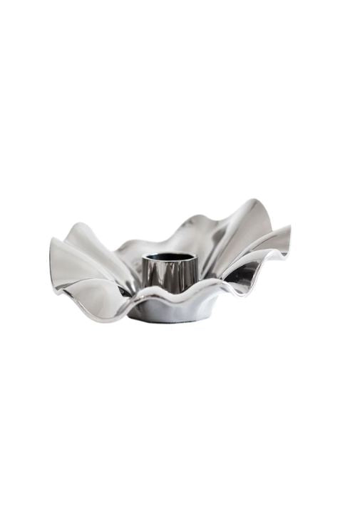Kandelaar van Specktrum, gemaakt van metaal met een zilverkleurige chroomafwerking. Het ontwerp heeft een golvende, bloemachtige vorm met een reflecterend oppervlak.