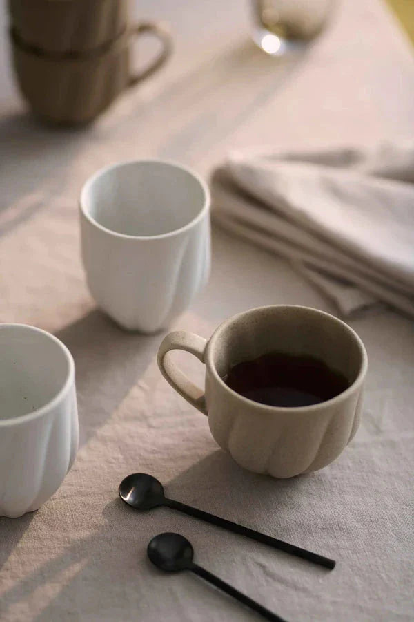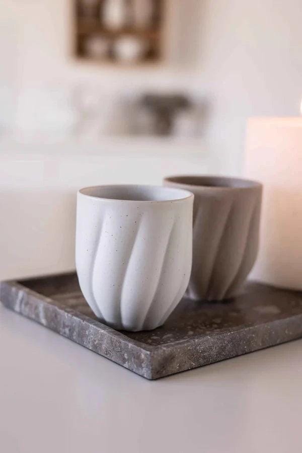 Keramische beker van Specktrum met golvende lijnen op het oppervlak. De off-white beker heeft een licht taps toelopende vorm naar de onderkant en is ontworpen zonder oor voor een strak uiterlijk.