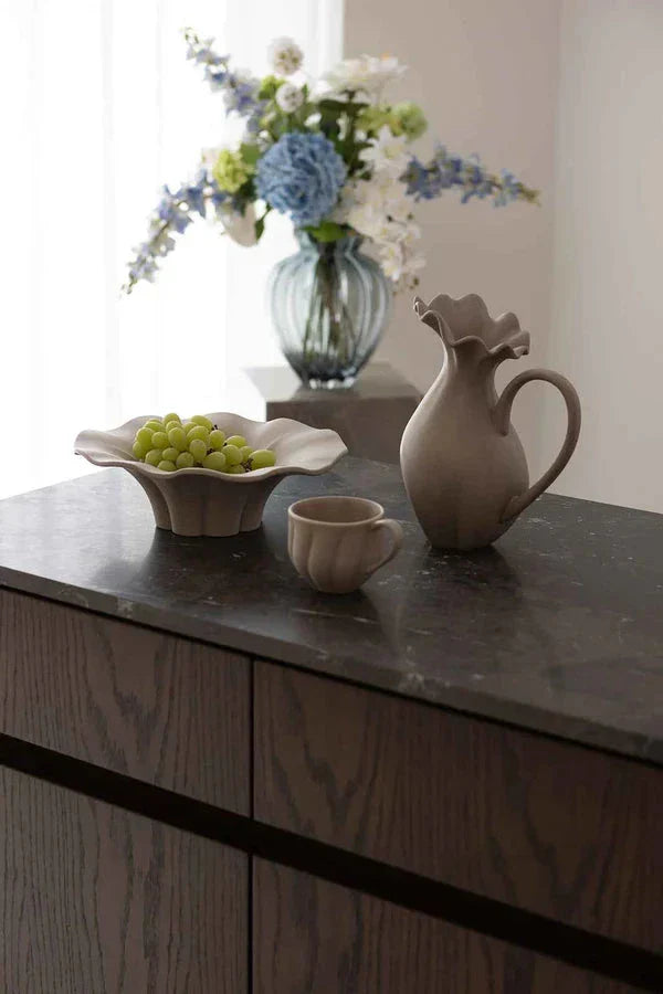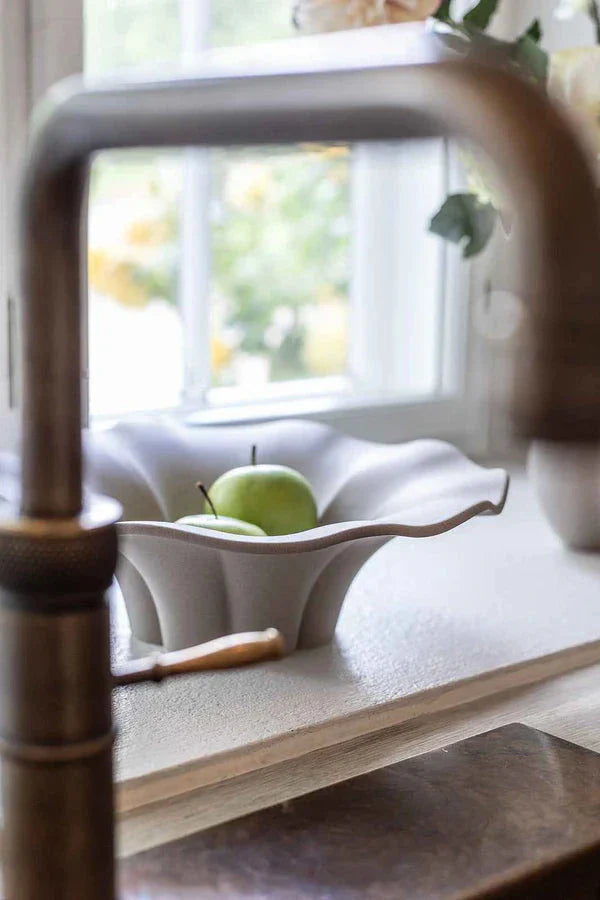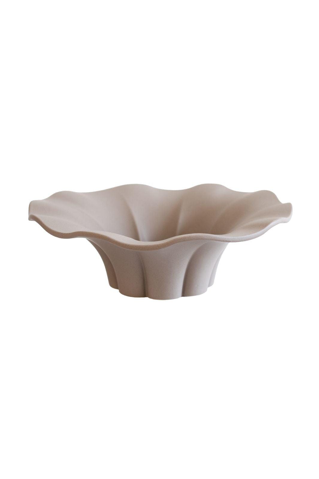 Zandkleurige keramische schaal van Specktrum met een golvende rand en een matte afwerking. De schaal is gemaakt door traditioneel vakmanschap, wat elk stuk zijn eigen unieke karakter geeft.