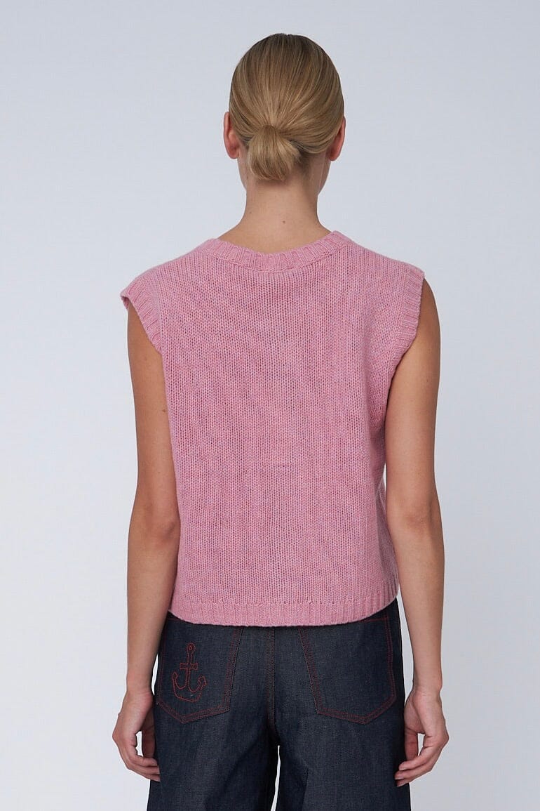 Mouwloos vest van Stella Nova in lila. Het vest heeft een geel anker-motief geborduurd op de linkerborst en vijf knopen aan de voorkant.