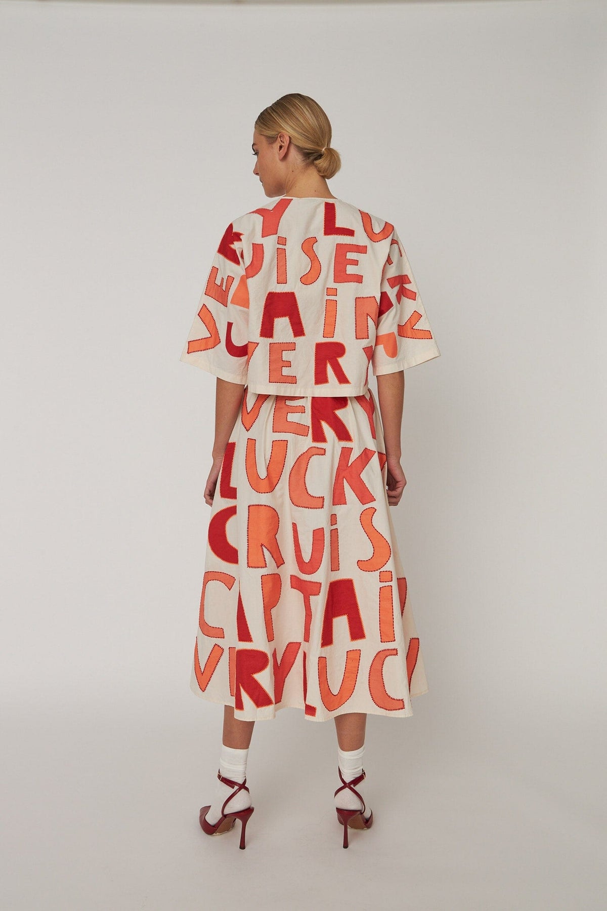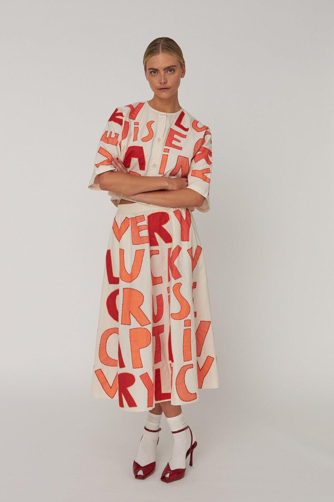 Een rok van Stella Nova met grote letters in rode en oranje tinten op een witte en crèmekleurige basis.