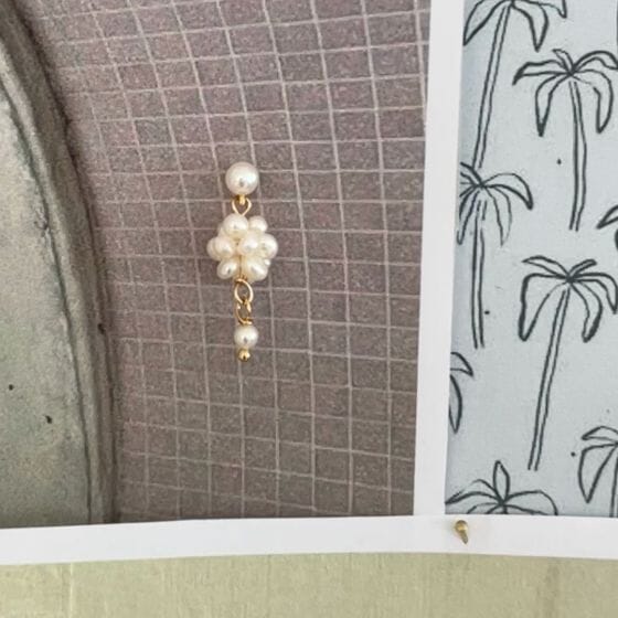 Oorbellen van Stine A met een cluster van zoetwaterparels in verschillende maten. De prijs is per stuk. De oorbel heeft een vergulde zetting en een hangend ontwerp.