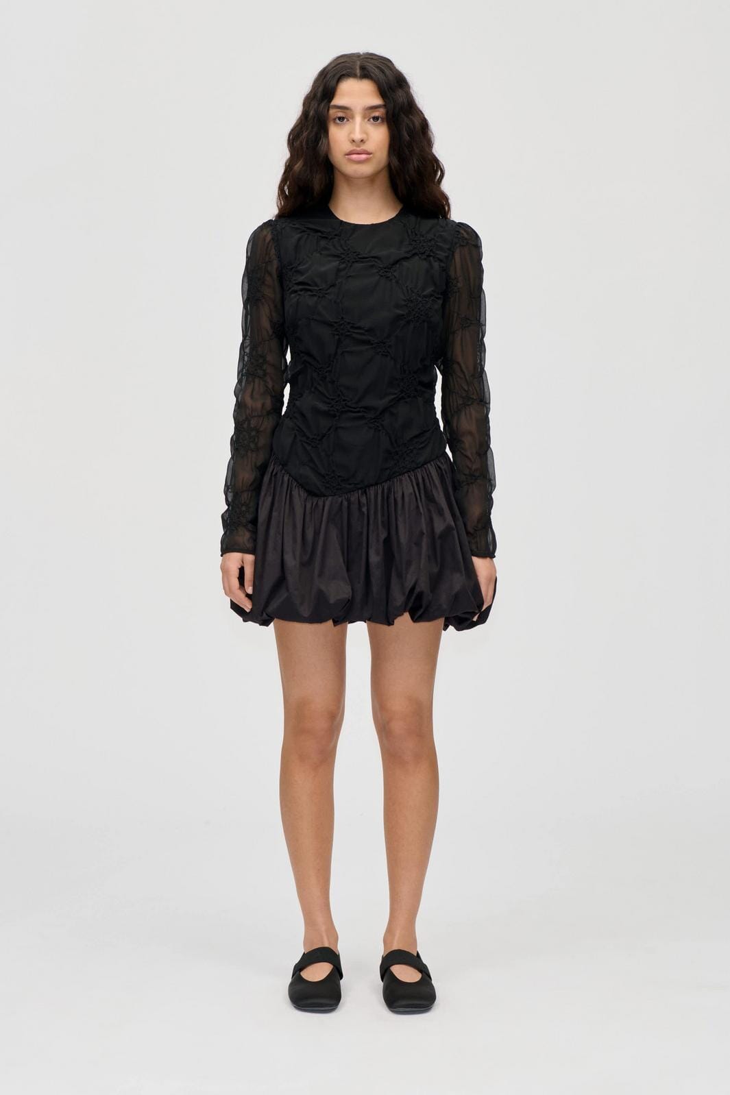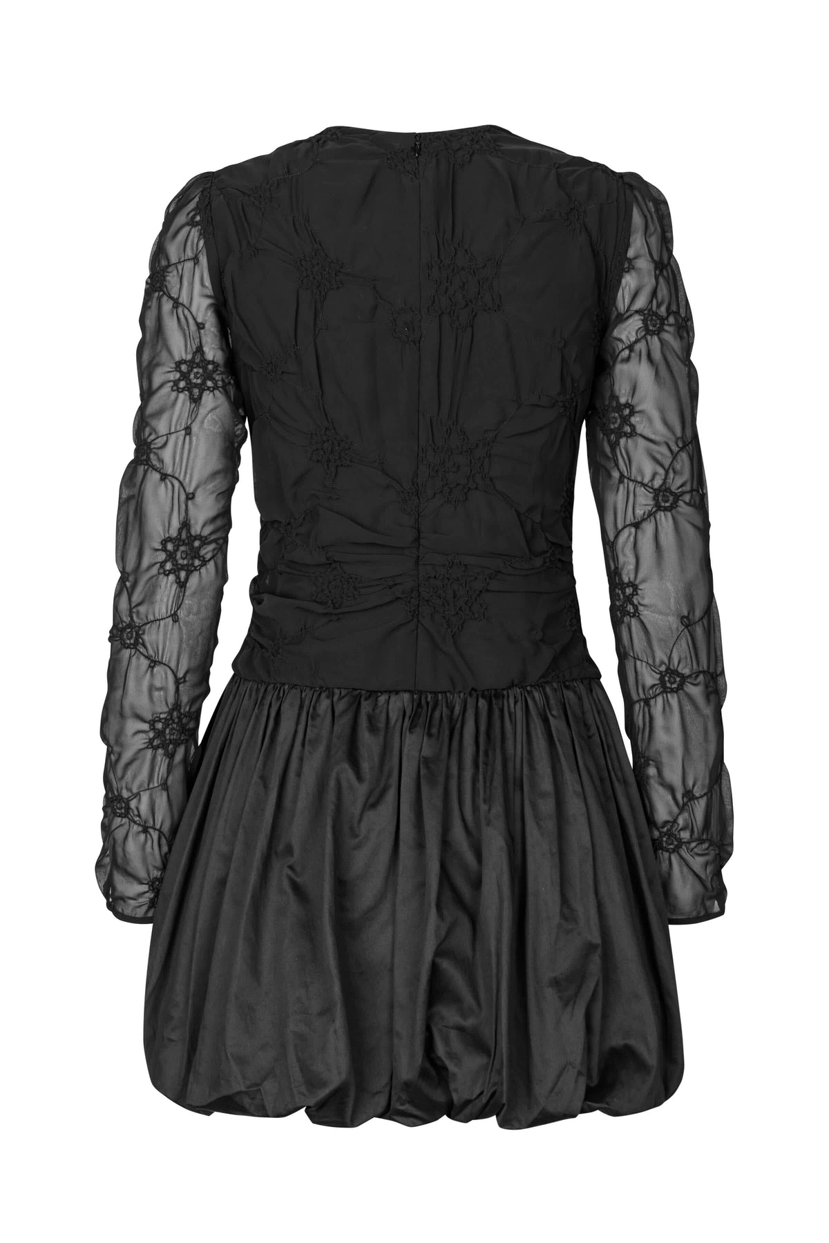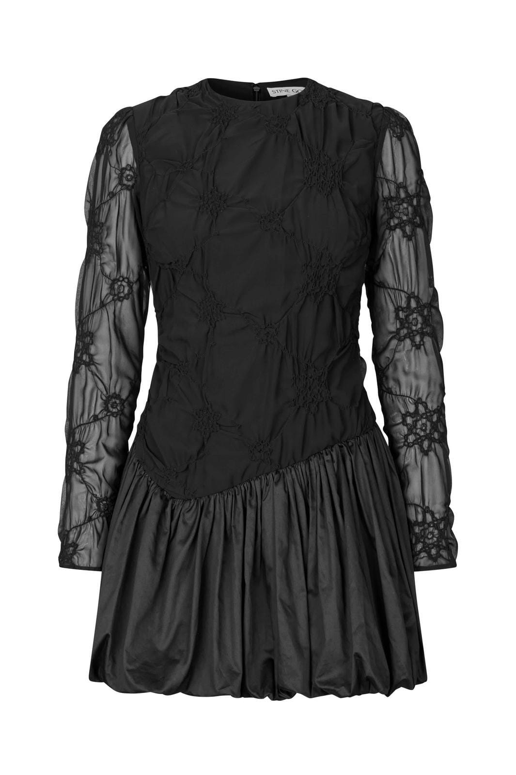 Zwarte jurk van Stine Goya met smockdesign en bloemenborduursel. De jurk heeft transparante ballonmouwen met bloemendetails en een korte, ballonvormige rok.