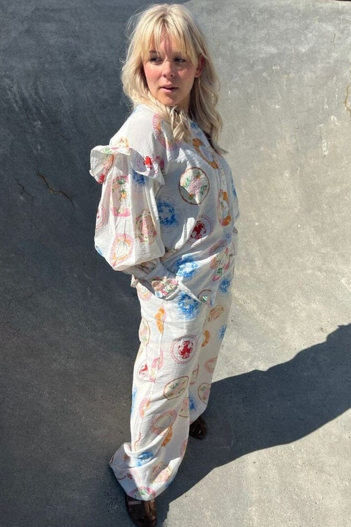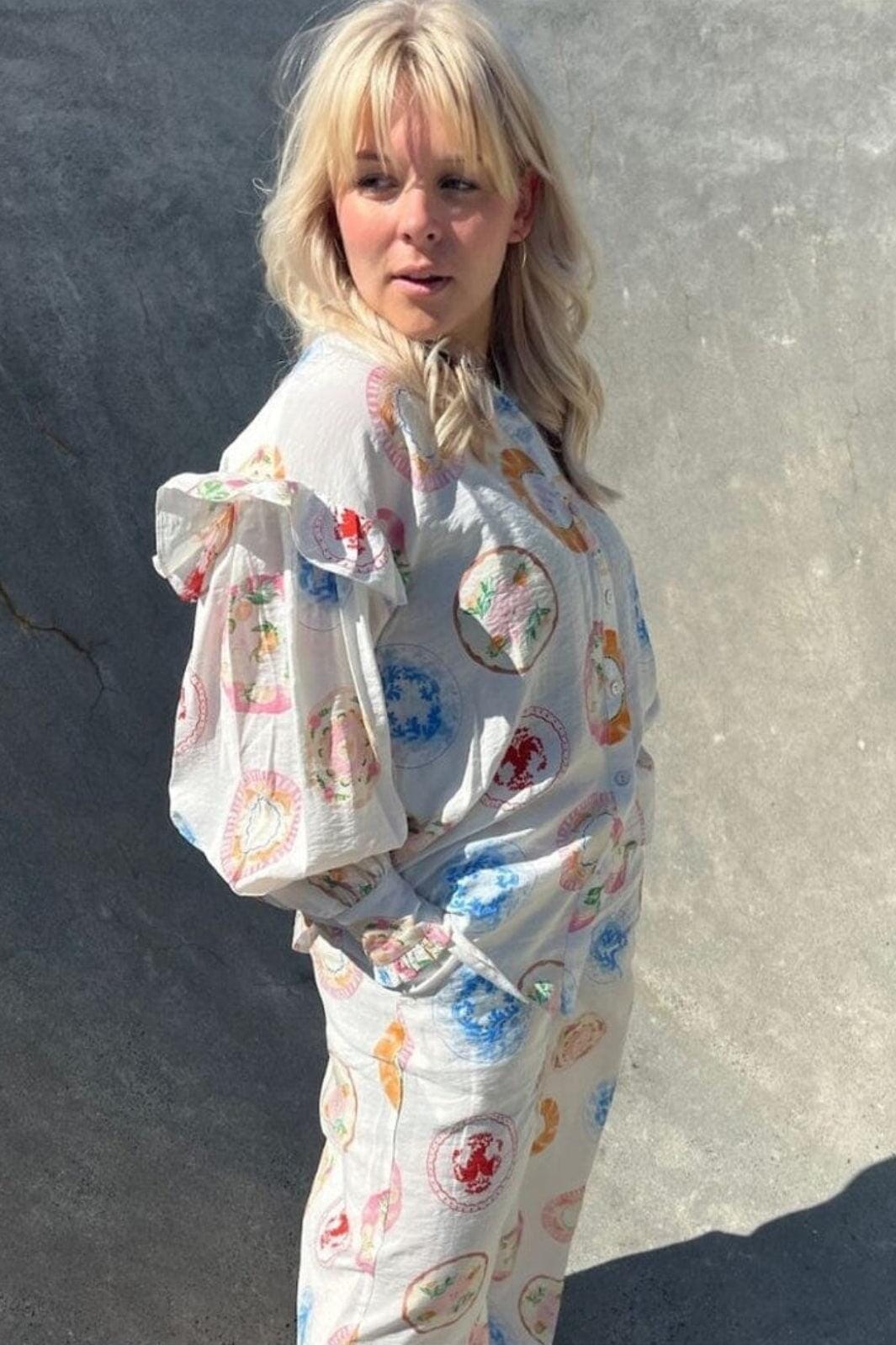 Een blouse van Stories From The Atelier By Copenhagen Shoes met een meerkleurig patroon van cirkelvormige motieven in verschillende kleuren.