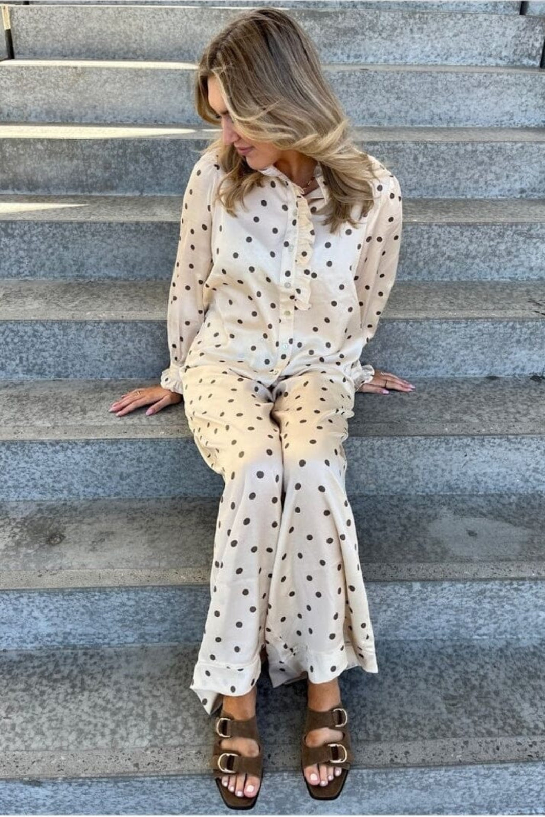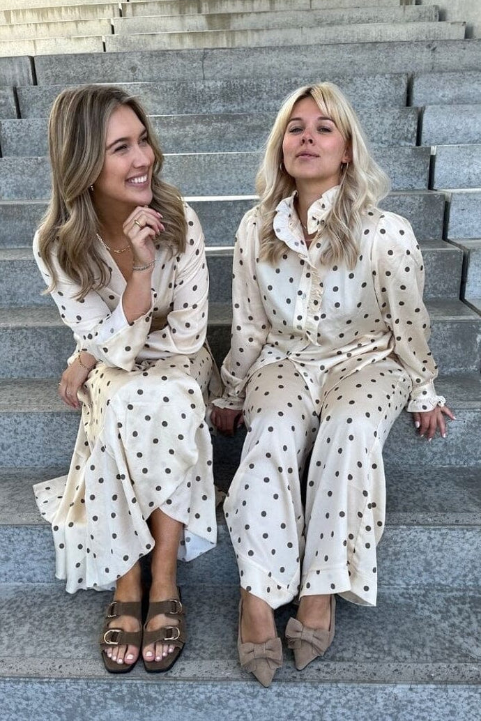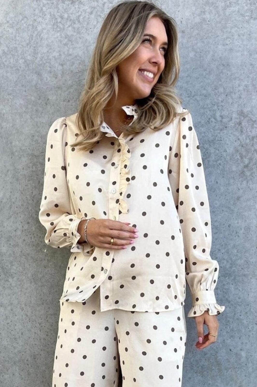 Een offwhite blouse met bruine stippen van Stories From The Atelier by Copenhagen Shoes. De blouse heeft ruches bij de kraag en een knoopsluiting aan de voorkant.